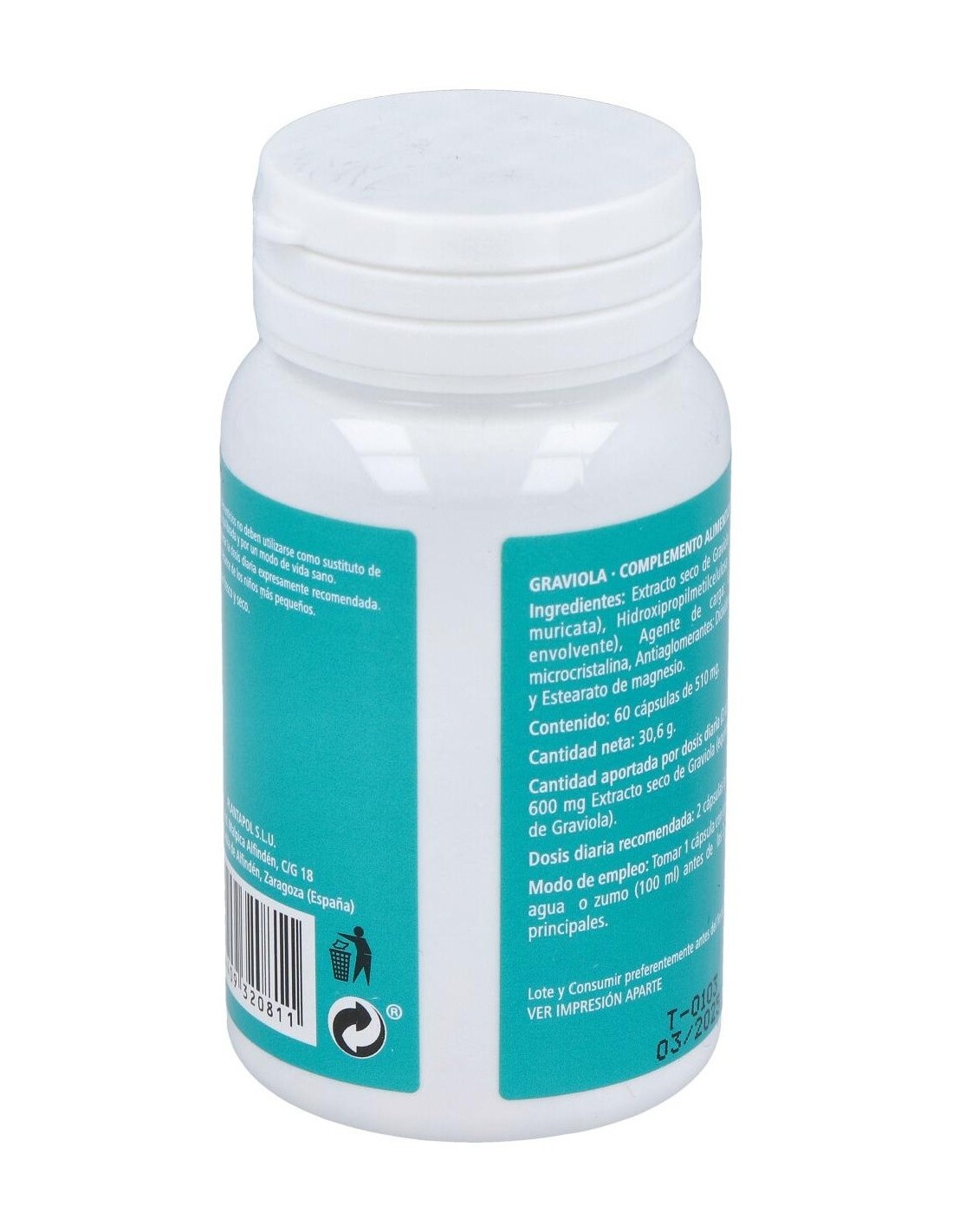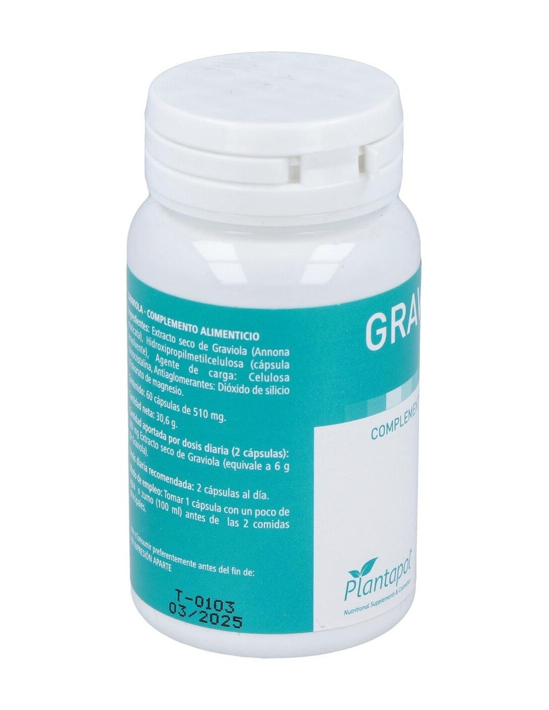 Extracto seco de Graviola (Annona muricata) 300 mg (equivalente a 4.500 mg), Agente de carga: Celulosa microcristalina, Antiaglomerantes: Dióxido de silicio y Estereato de magnesio)