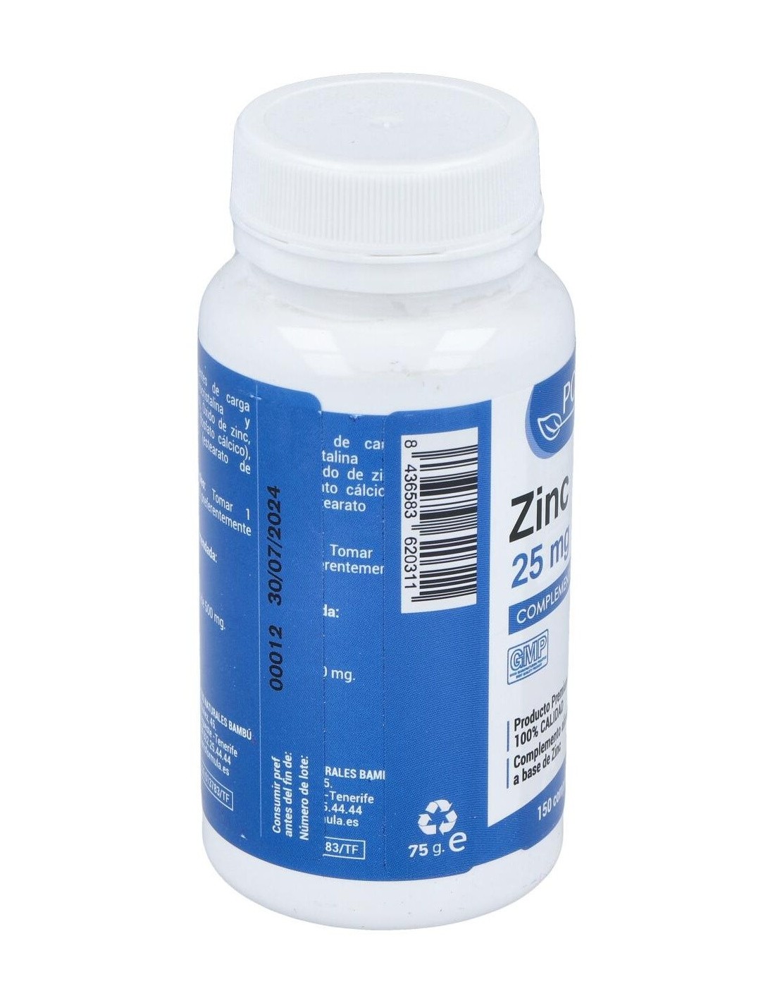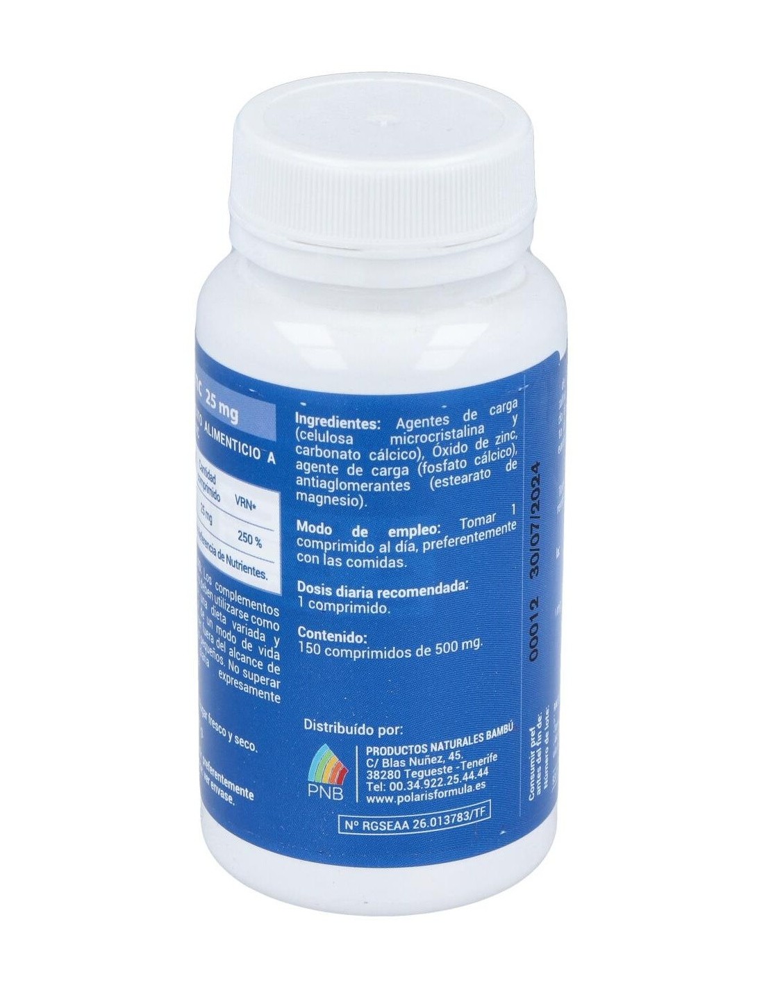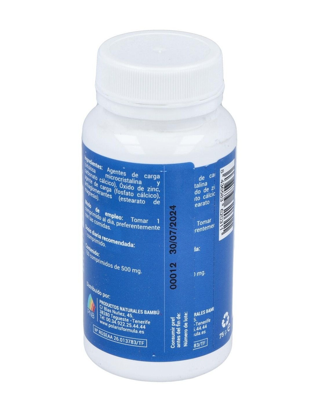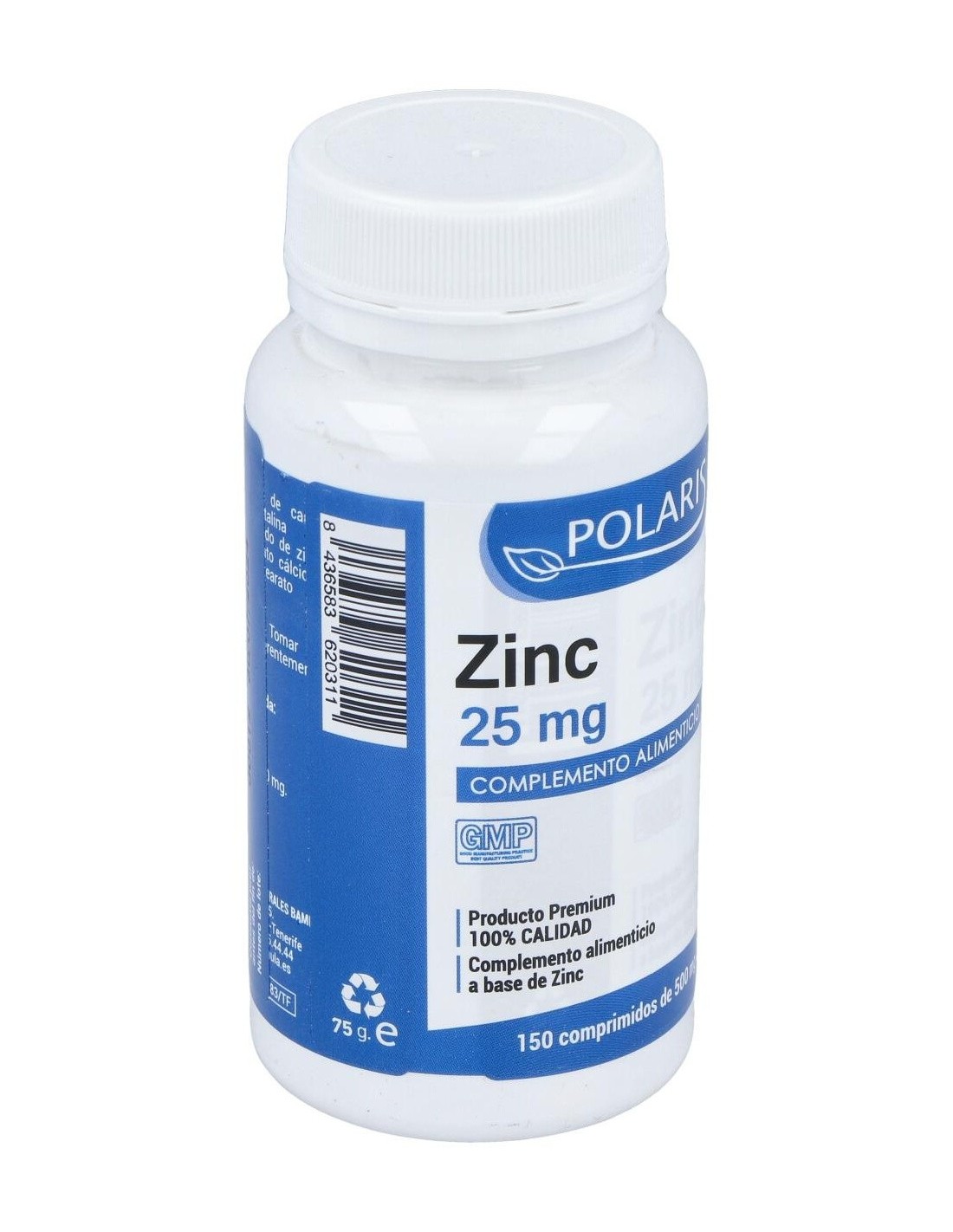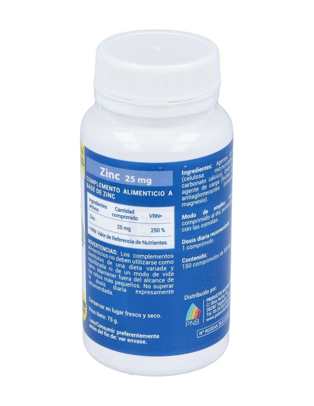 Frasco con 150 comprimidos de la marca Polaris. Cada comprimido contiene 50 miligramos de zinc y fosfato de calcio. El envase pesa aproximadamente 500 gramos, por lo que puede guardarse en un espacio fresco y seco con facilidad. Este producto está elaborado para fortalecer las funciones del sistema inmunitario. Es de utilidad para fomentar el buen funcionamiento del metabolismo y favorece el proceso de cicatrización de las heridas.