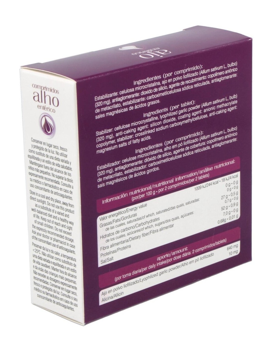 Ajo en polvo liofilizado (Allium sativum L, bulbo)(320 mg), estabilizante: celulosa microcristalina silicificada (celulosa microcristalina y dióxido de silicio) y celulosa microcristalina, antiaglomerante: dióxido de silicio, estabilizante: carboximetilcelulosa sódica reticulada, antiaglomerante: sales magnésicas de ácidos grasos, agentes de recubrimiento: copolímero de metacrilato neutro, talco y polietilenglicol.