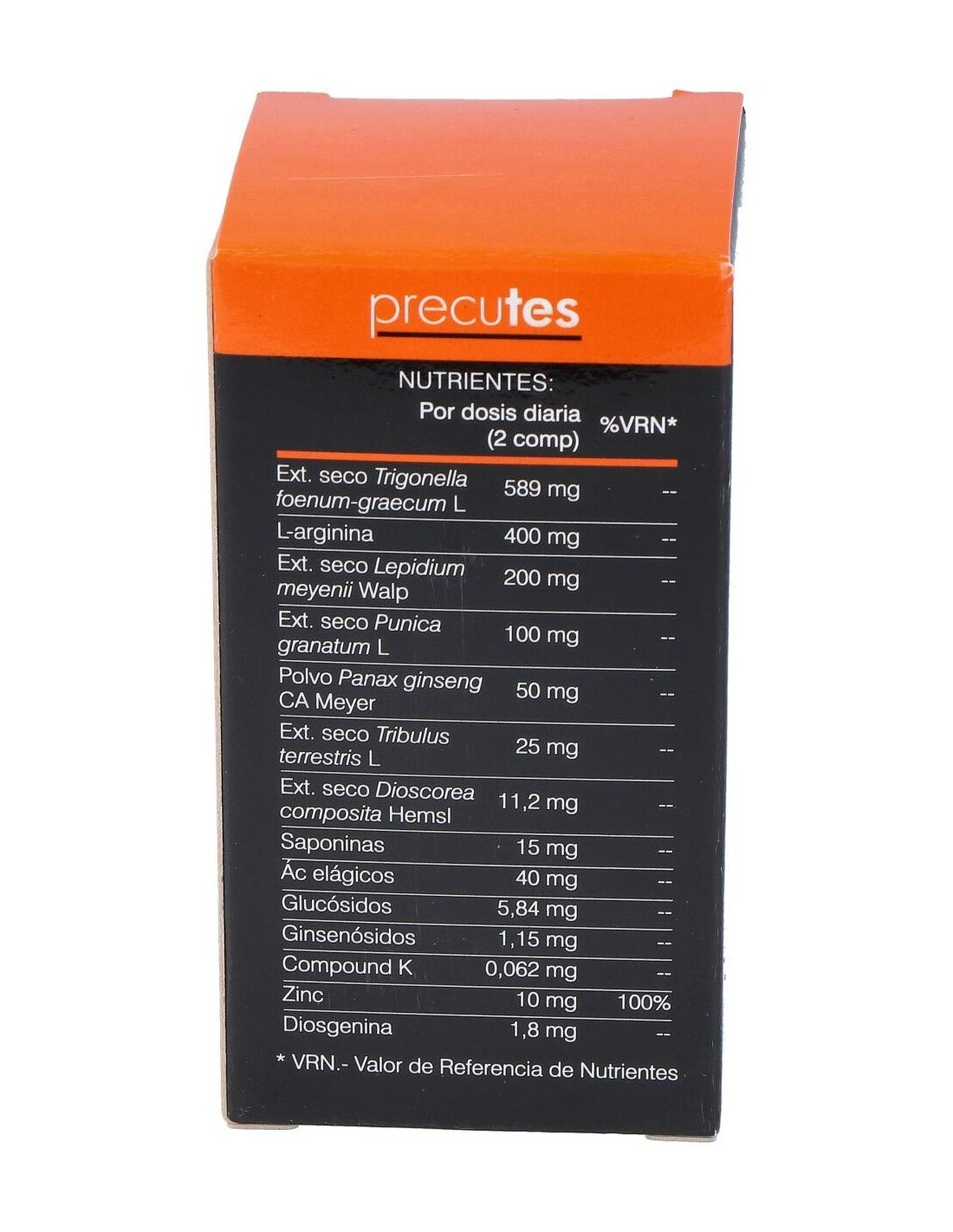 Extracto seco de alholva (Trigonella foenum-graecum L, semillas) (294,5 mg), L-arginina HCI, estabilizante: celulosa microcristalina, extracto seco de maca (Lepidium meyenii Walp, raíz) (100 mg), extracto seco de granada (Punica granatum L, cáscara de fruto) (50 mg), polvo de ginseng negro fermentado (cultivado en Soria) (Panax ginseng CA Meyer, raíz) (25 mg), picolinato de zinc, antiaglomerante: dióxido de silicio., extracto seco de abrojo (Tribulus terrestris L, fruto) (12,5 mg), estabilizante: carboximetilcelulosa sódica reticulada, antiaglomerante: sale magnésicas de ácidos grasos, extracto seco de Dioscorea composita (Dioscorea composita Hemsl, raíz) (5,6 mg).
