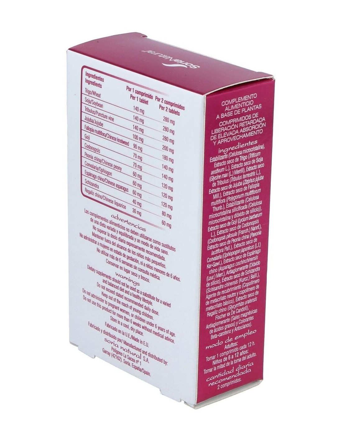 Estabilizante (Celulosa microcristalina), Extracto seco de Trigo (Triticum aestivum L.), Extracto seco de Soja (Glycine max (L.) Merrill), Extracto seco de Tribulus (Tribulus terrestris L.), Extracto seco de Jujuba (Ziziphus jujuba Mill.), Extracto seco de Fallopia multiflora (Polygonum multiflorum Thunb.), Extracto seco de Goji (Lycium barbarum L.), Extracto seco de Codonopsis (Codonopsis pilosula (Franch.) Nannf.), Estabilizante (Hidroxipropilcelulosa), Extracto seco de Peonia china (Paeonia lactiflora Pall.), Extracto seco de Convalaria (Ophiopogon japonicus (L.f.) Ker-Gawl.), Extracto seco de Espárrago chino (Asparagus cochinchinensis (Lour.) Merr.), Extracto seco de Schizandra (Schisandra chinensis (Kurcz.) Baill.), Antiaglomerante (Dióxido de silicio), Extracto seco de Regaliz chino (Glycyrrhiza uralensis Fischer ex De Candoll), Agente de recubrimiento (Copolímero neutro), Antiaglomerante (Estearato de magnesio) y Colorantes (Beta-caroteno y Antocianos).