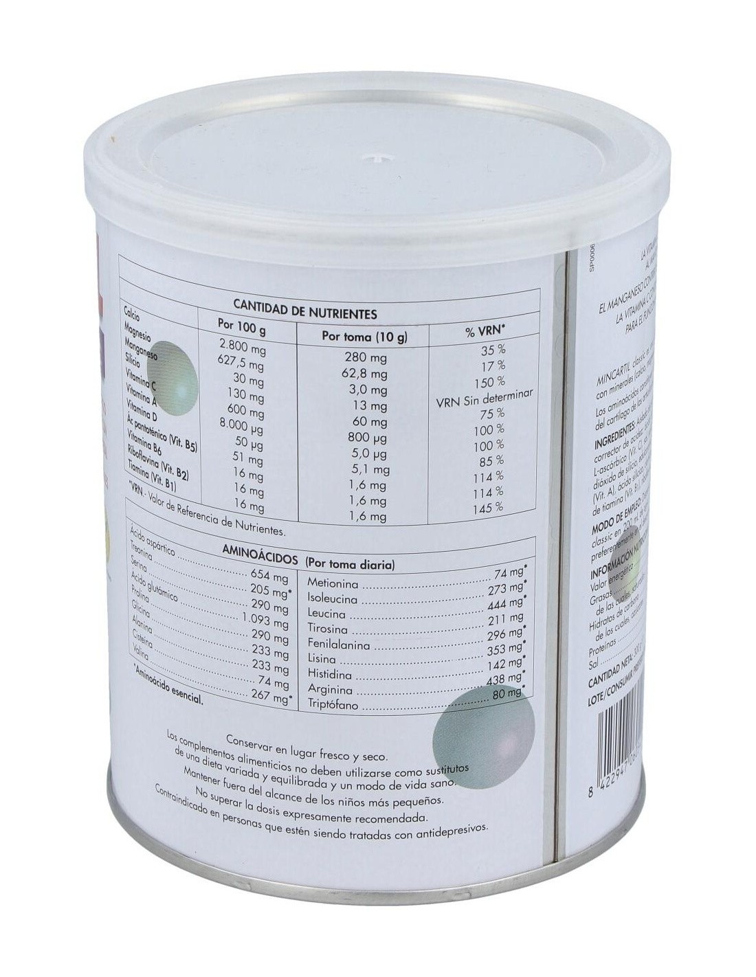 Aislado de proteína de soja (Glycine max (L) Merr., semilla), lactato cálcico, corrector de acidez: ácido cítrico, cloruro de magnesio, aroma de piña, edulcorante: acesulfame K, ácido L-ascórbico (Vit. C), sal, fructosa, gluconato de manganeso, dióxido de silicio: pantotenato cálcico, ácido de retinilo (Vit A), ácido silícico, edulcorante: neohesperidina DC, clorhidrato de piridoxina (Vit B6), colecalciferol (Vit D) riboflavina (Vit B2), tiamina (Vit. B1).