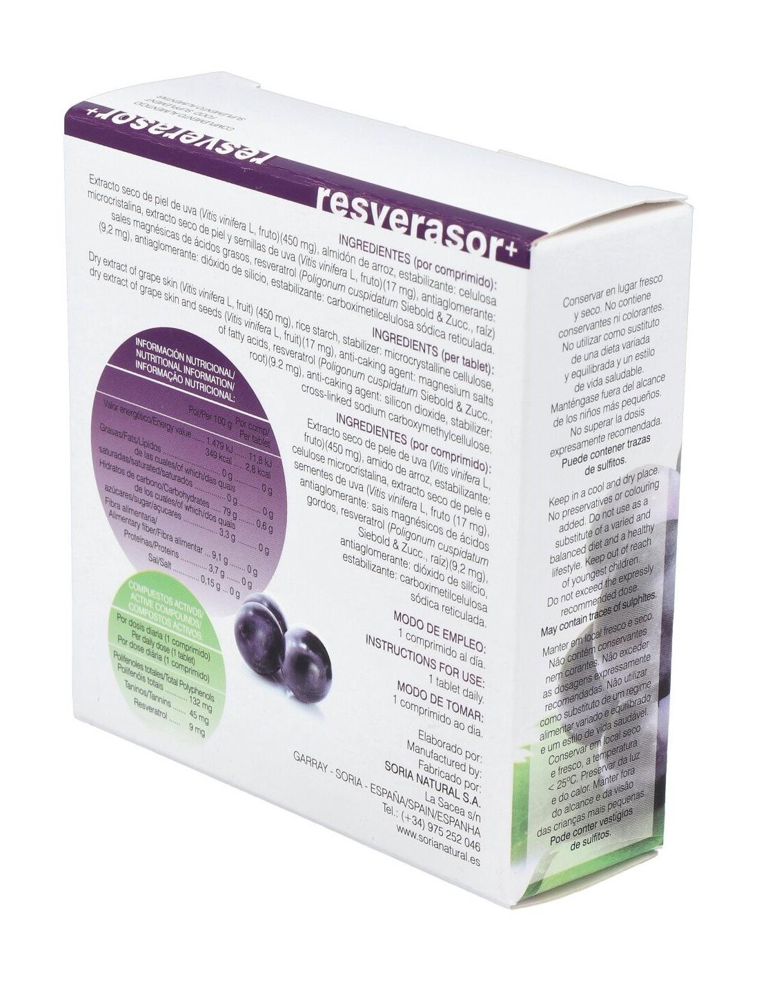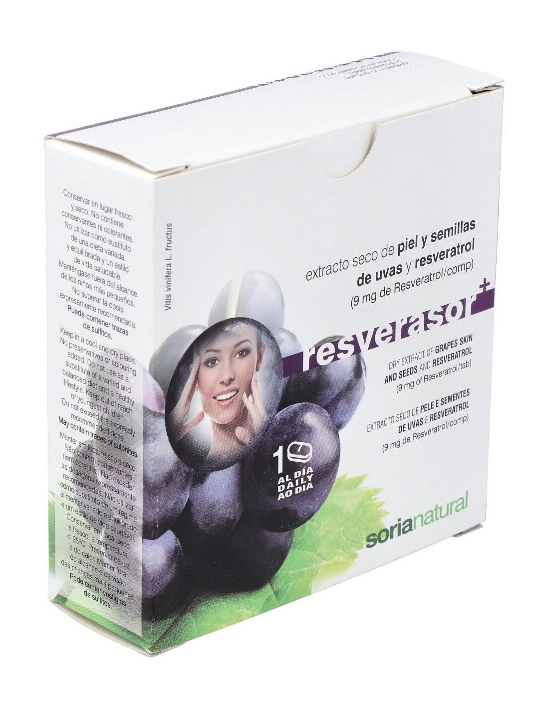Soria Natural te presenta Resverasor Plus, unos comprimidos realizados a base de semillas y piel de uvas negras procedentes de cultivo ecológico. Esta fruta te ofrece una acción antioxidante y antienvejecimiento.