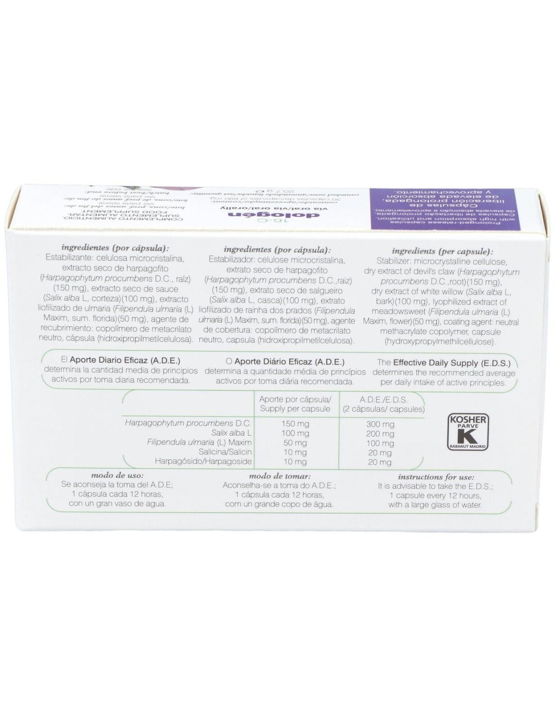 EXTRACTO LIOFILIZADO DE HARPAGOFITO (HARPAGOPHYTUM PROCUMBENS D.C, RAÍZ)(150 MG), EXTRACTO LIOFILIZADO DE SAUCE (SALIX ALBA L, HOJA)((100 MG), EXTRACTO LIOFILIZADO DE ULMARIA (FILIPENDULA ULMARIA (L)(MAXIM, S FLORIDA)(50 MG), ESTABILIZANTE: CELULOSA MICROCRISTALINA; AGENTE DE RECUBRIMIENTO: COPOLÍMERO DE METACRILATO NEUTRO, CÁPSULA (HIDROXIPROPILMETILCELULOSA).