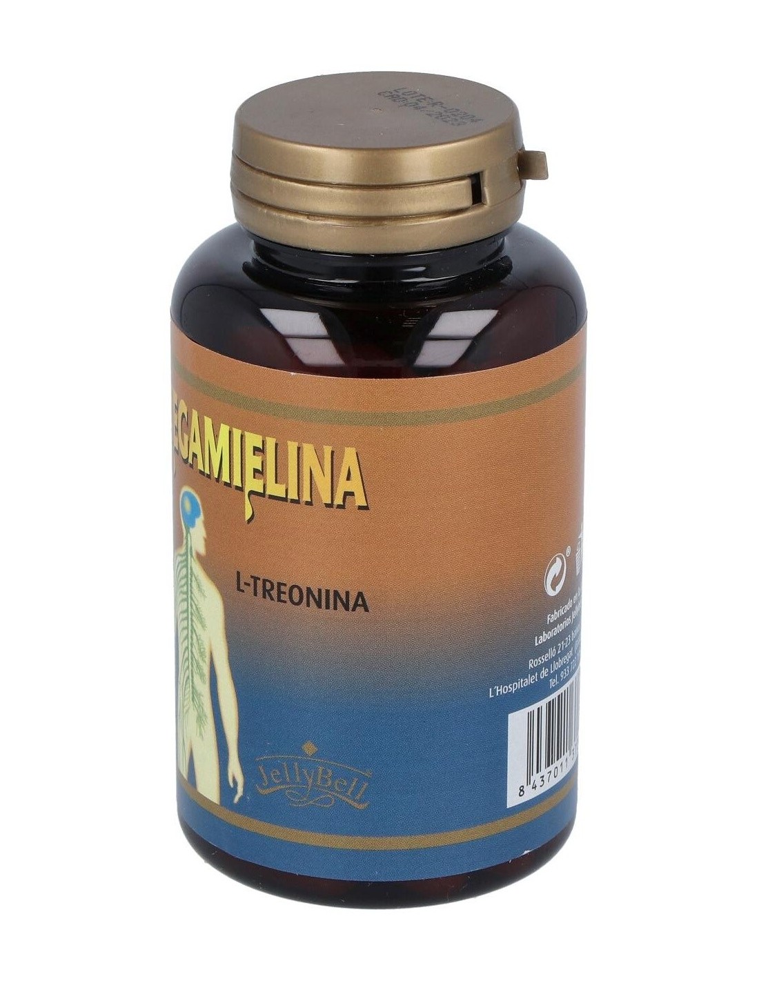 Cápsulas de complemento alimenticio de Megamielina L-Treonina de la marca Jellybell que ayuda a favorecer las funciones de las fibras nerviosas y para un correcto crecimiento muscular del esqueleto, un correcto funcionamiento de las enzimas digestivas y ciertas proteínas inmunes y un funcionamiento correcto del hígado, que están directamente relacionados con ciertos procesos del sistema nervioso central.