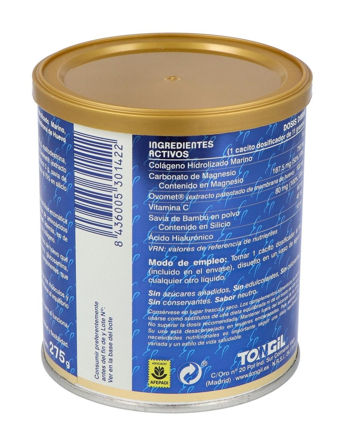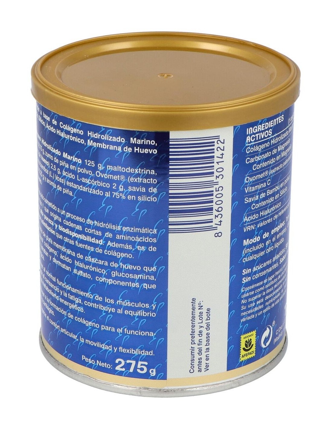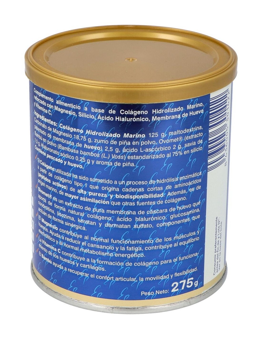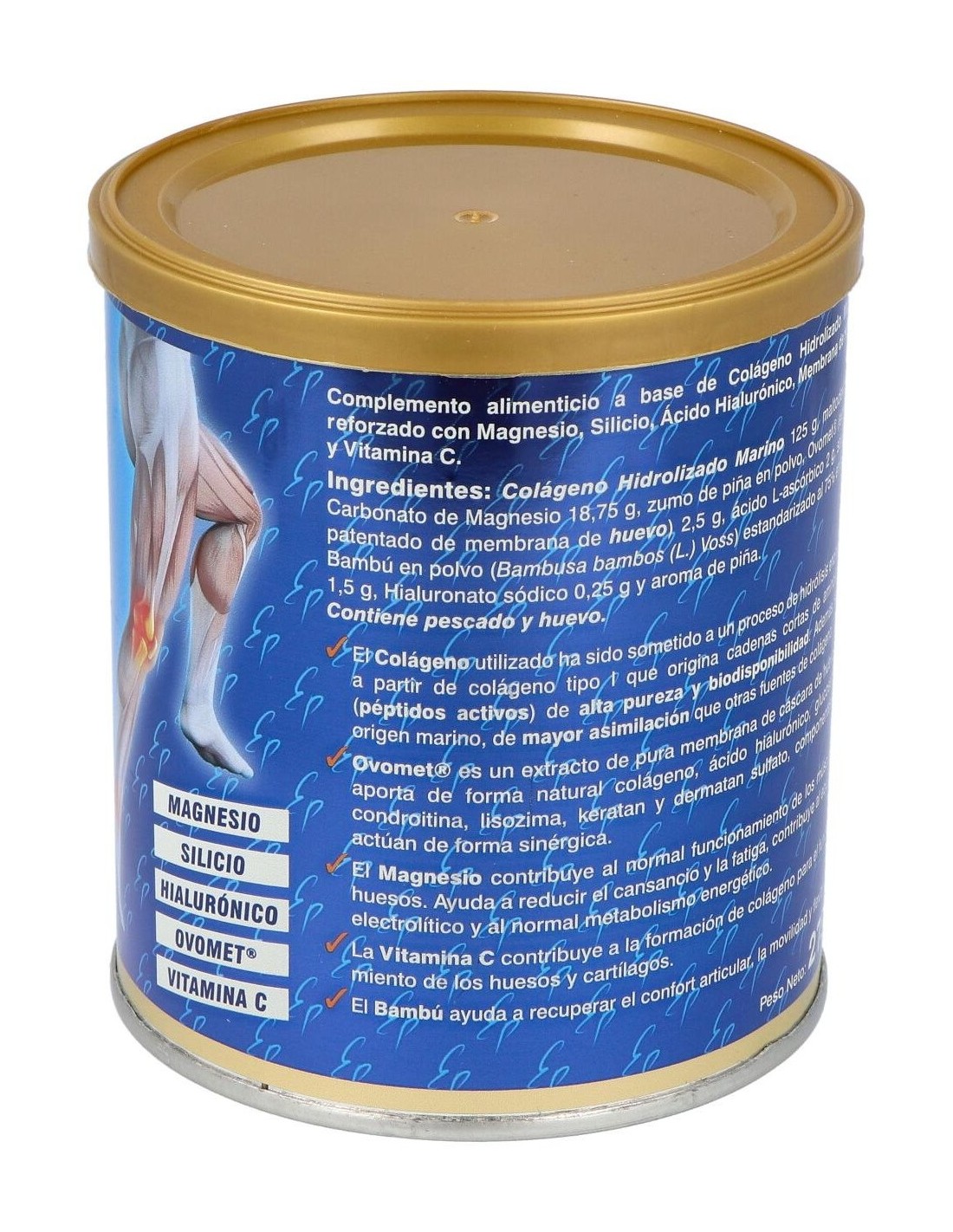 Colágeno Hidrolizado Marino 125 g, Carbonato de Magnesio 18,75 g, zumo de piña en polvo, Ovomet® (extracto patentado de membrana de huevo) 2,5 g, ácido L-ascórbico 2 g, savia de Bambú en polvo (Bambusa bambos (L.) Voss) estandarizado al 75% en silicio 1,5 g, Hialuronato sódico 0,25 g y aroma de piña. Excipientes: agente de carga (maltodextrina), estabilizante (goma arabiga) y emulsionante (propilenglicol).