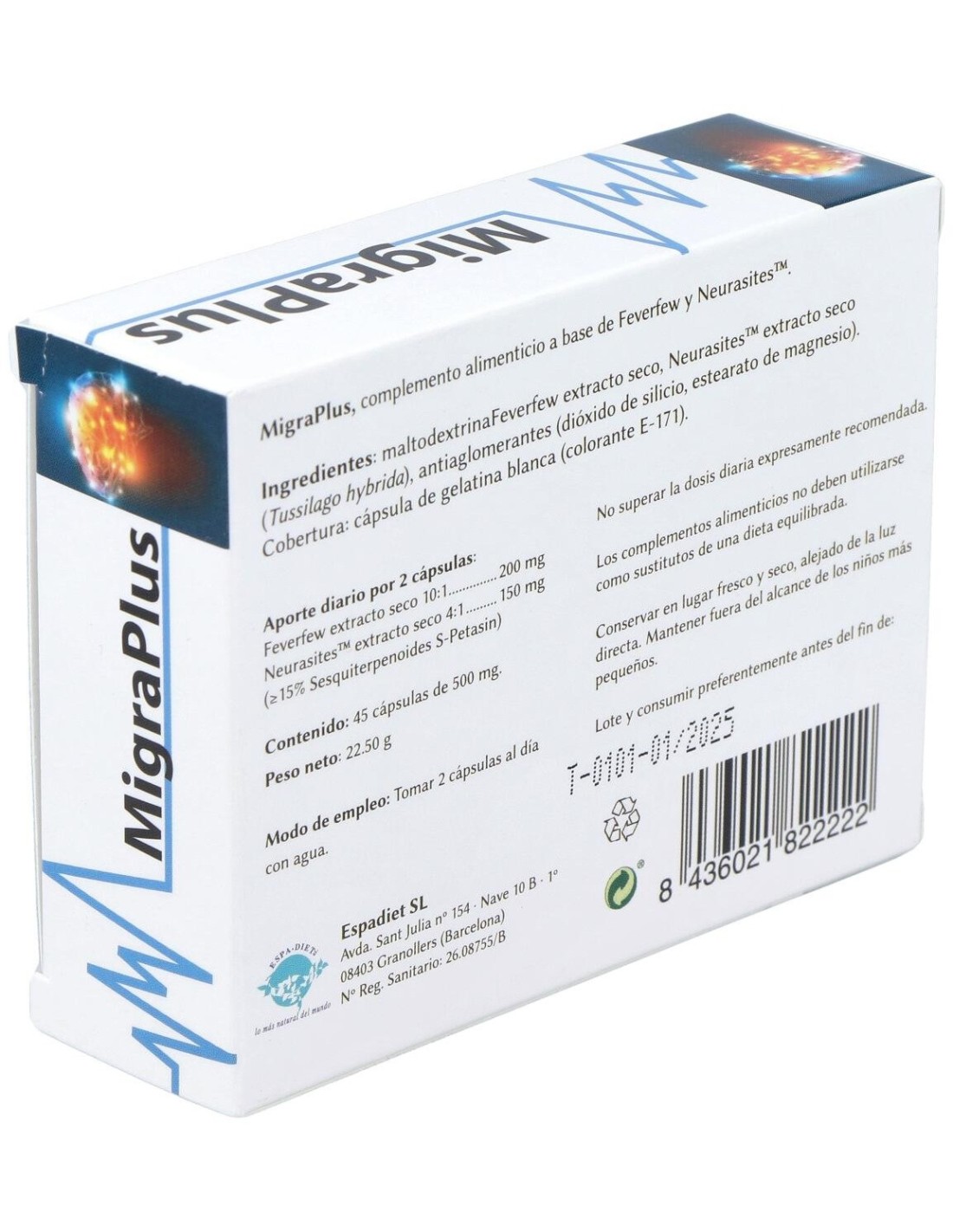 Complemento alimenticio elaborado con neurasites, que ejerce una acción antiinflamatoria ayudando a paliar los dolores provocados por las migrañas. La composición contiene: Maltodextrina, extracto seco de feverfew, extracto seco de neurasites, antiaglomerantes (estearato de magnesio y dióxido de silicio), cobertura (gelatina blanca). Advertencias de uso: No superar la dosis diaria recomendada. Conservar en un lugar fresco y seco. Mantener fuera del alcance de los niños. No utilizar como sustituto de una dieta equilibrada y sana.