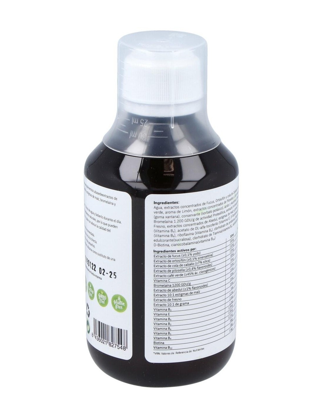 Agua, extractos concentrados de fucus, ortosifón y cola de caballo, aroma de té verde y limón, extractos concentrado de pilosella y café verde, sorbato potásico, ácido L-ascórbico (vitamina C), bormelaína 1200 GDU/g de actividad protelítica, goma xantana, extracto hidroalcohólico de fresno, extractos concentrados de abedul, estigmas de maíz y grama, nicotinamida, acetato DL-alfa tocoferilo, D-pantotenato cálcico, sucralosa, rivoflavina, clorhidrato de piridoxina, clorhidrato de tiamina, ácido fólico, D-biotina, cianocobalamina.