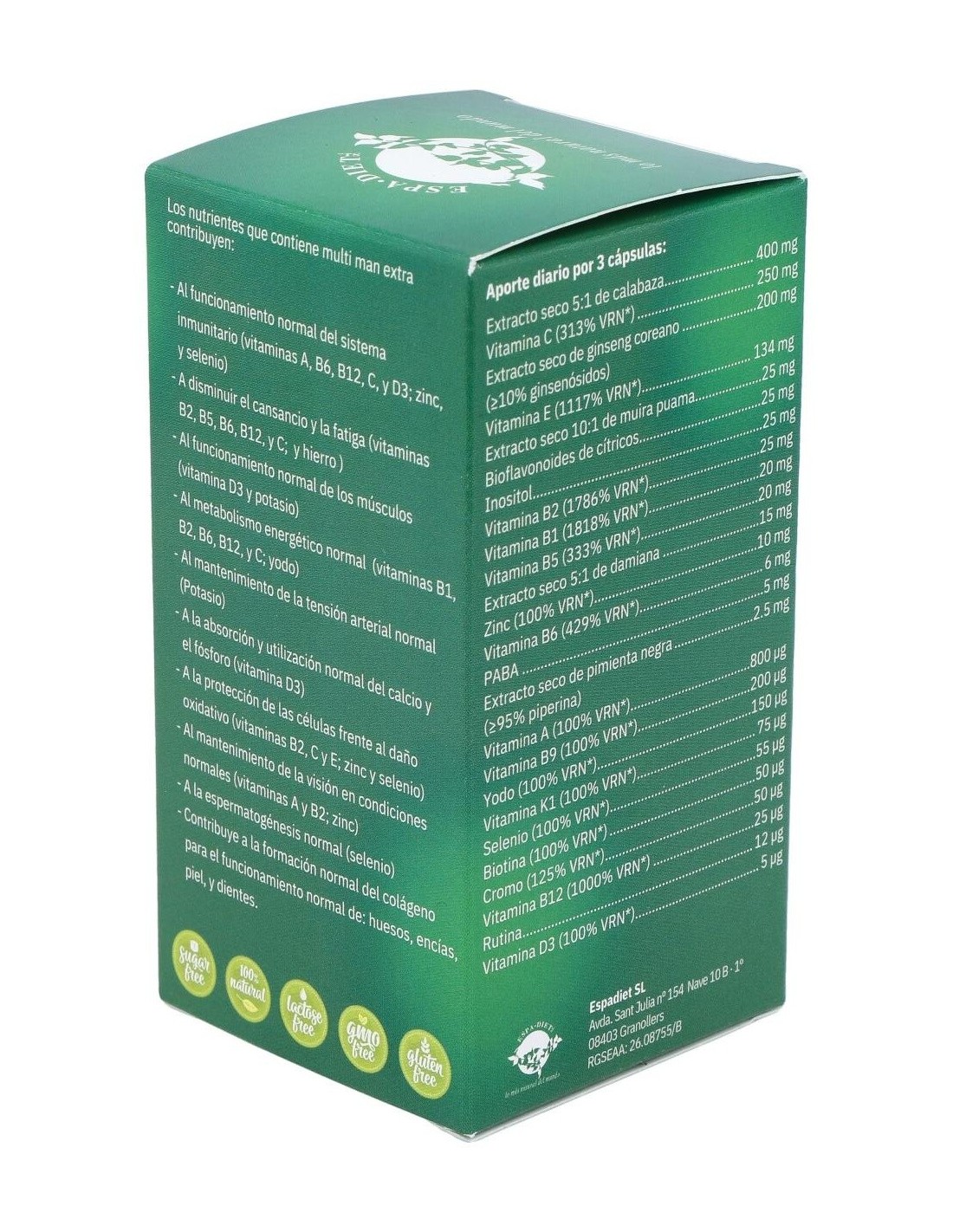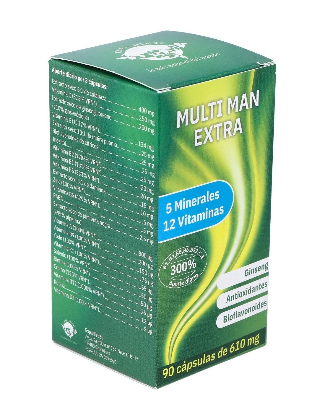 Extracto seco de calabaza, acetato DL-alfa tocoferilo (vitamina E), ácido L-ascórbico (vitamina C), extracto seco de ginseng coreano, gluconato de zinc, clorhidrato de tiamina (vitamina B1), inositol, bioflavonoides de cítricos, extracto seco de muira puama, riboflavina (vitamina B2), D-pantotenato cálcico (vitamina B5), almidón de maíz, extracto seco de damiana, gluconato potásico, clorhidrato de piridoxina (vitamina B6), acetato de retinilo (vitamina A), ácido para-aminobenzoico (PABA), extracto seco de pimienta negra, antiaglomerante (estearato de magnesio), fitomenadiona (vitamina K1), picolinato de cromo, cianoco- balamina (vitamina B12), ácido fólico (vitamina B9), yoduro potásico, selenito sódico, biotina, colecalciferol (vitamina D3), rutina (vitamina P). Cobertura: cápsula de gelatina.