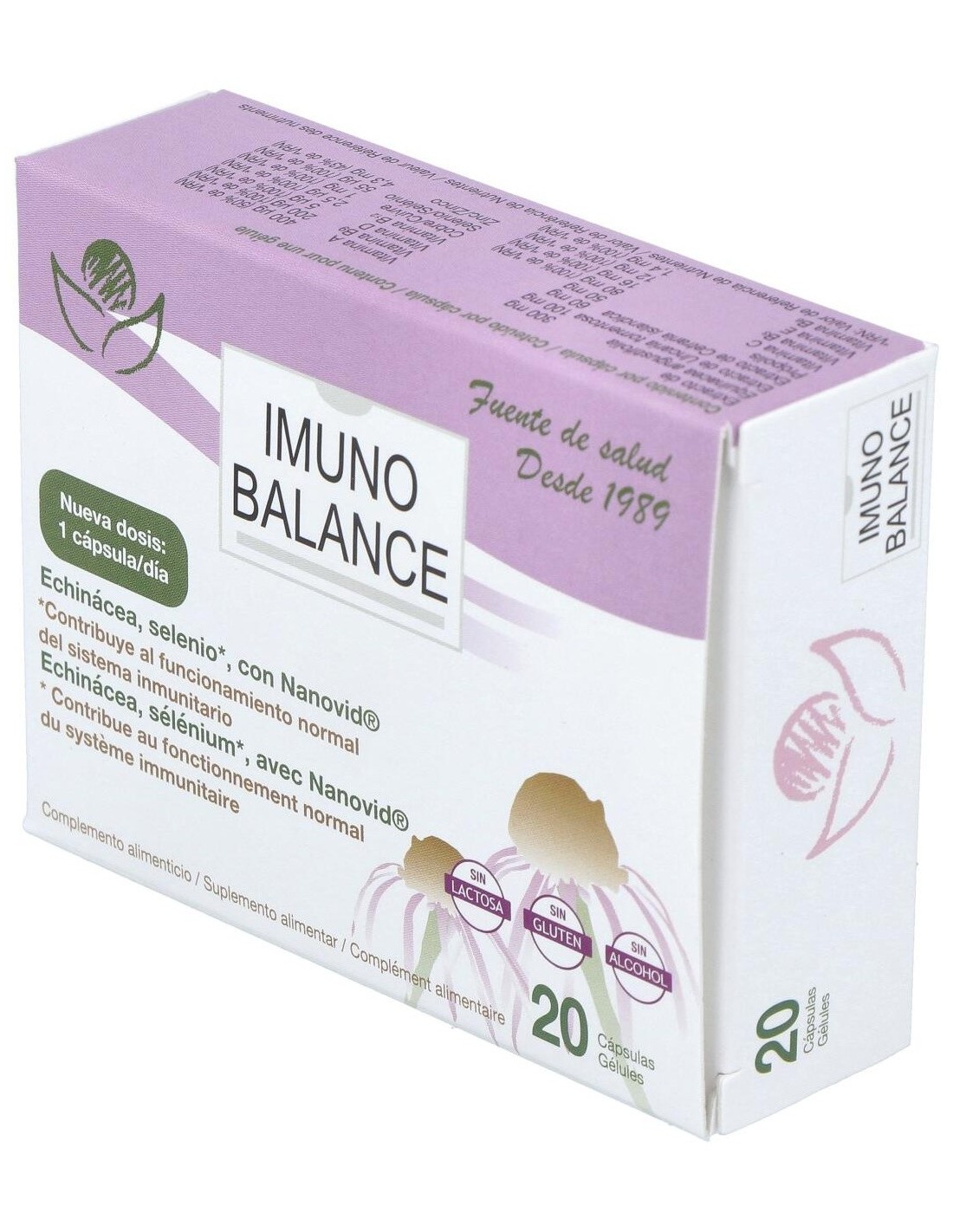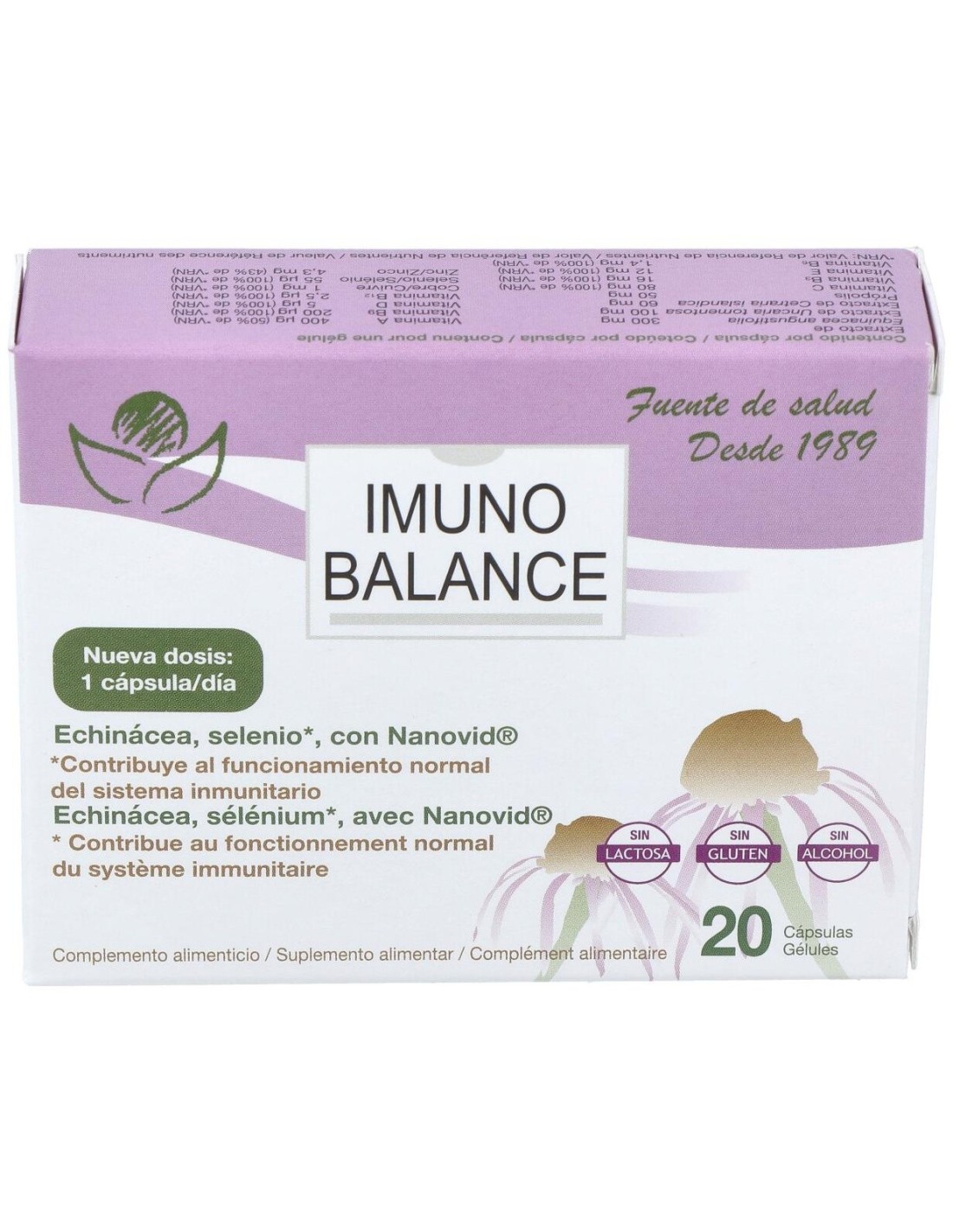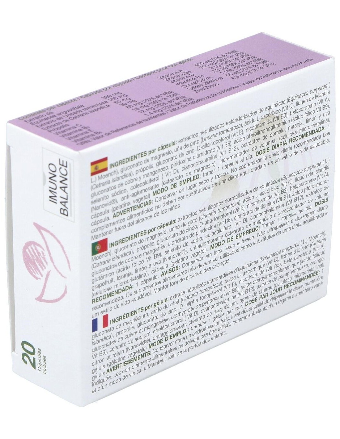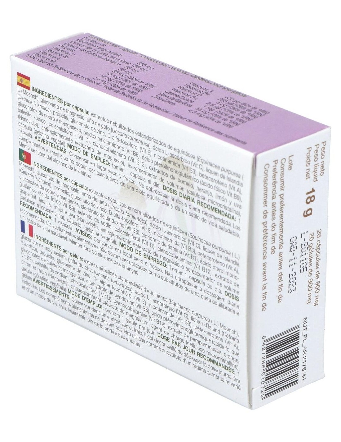 Ingredientes por cápsula: extractos nebulizados estandarizados de equinácea (Equinacea purpurea ( L.) Moench), gluconato de magnesio, uña de gato (Uncaria tomentosa), ácido L-ascórbico (Vit C), liquen de Islandia (Cetraria islandica), própolis, gluconato de zinc, D-alfa-tocoferol (Vit E), nicotinamida (Vit B3), betacaroteno (Vit A), gluconatos de cobre y manganeso, piridoxina clorhidrato (Vit B6), ácido pteroilmonoglutámico (ácido fólico Vit B9), selenito sódico, colecalciferol ( Vit D), cianocobalamina (Vit B12), extractos de pomelo, naranja, limón y uva (Nanovid®), anti-aglomerante (estearato de magnesio), incrementador de volumen (celulosa microcristalina), cápsula (gelatina vegetal).