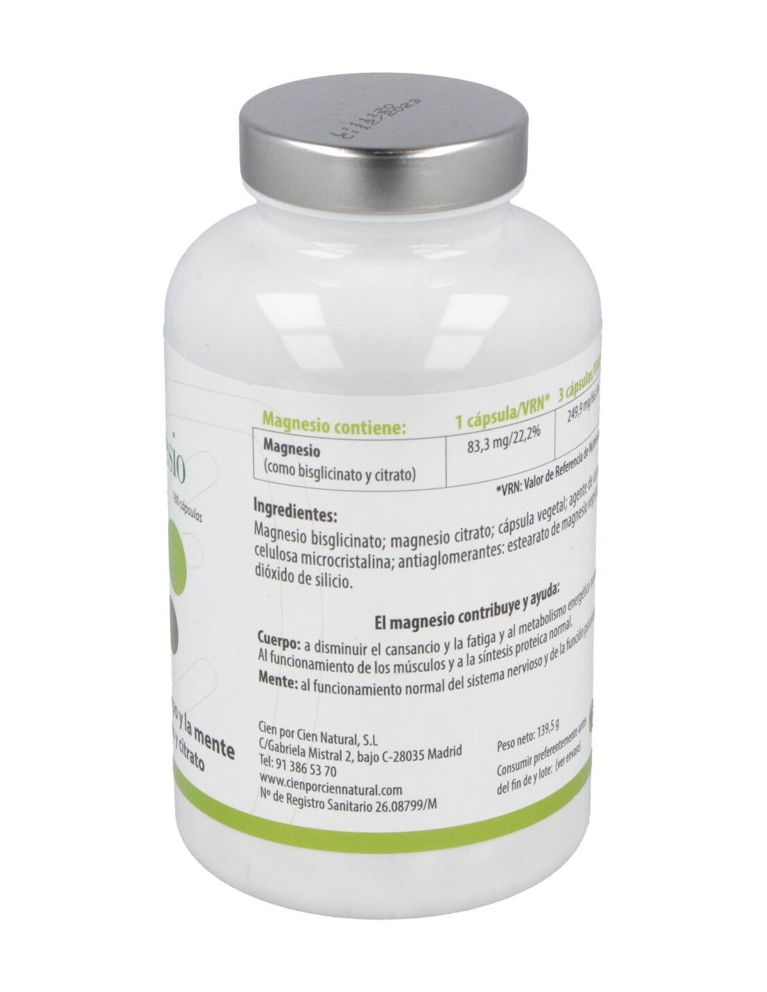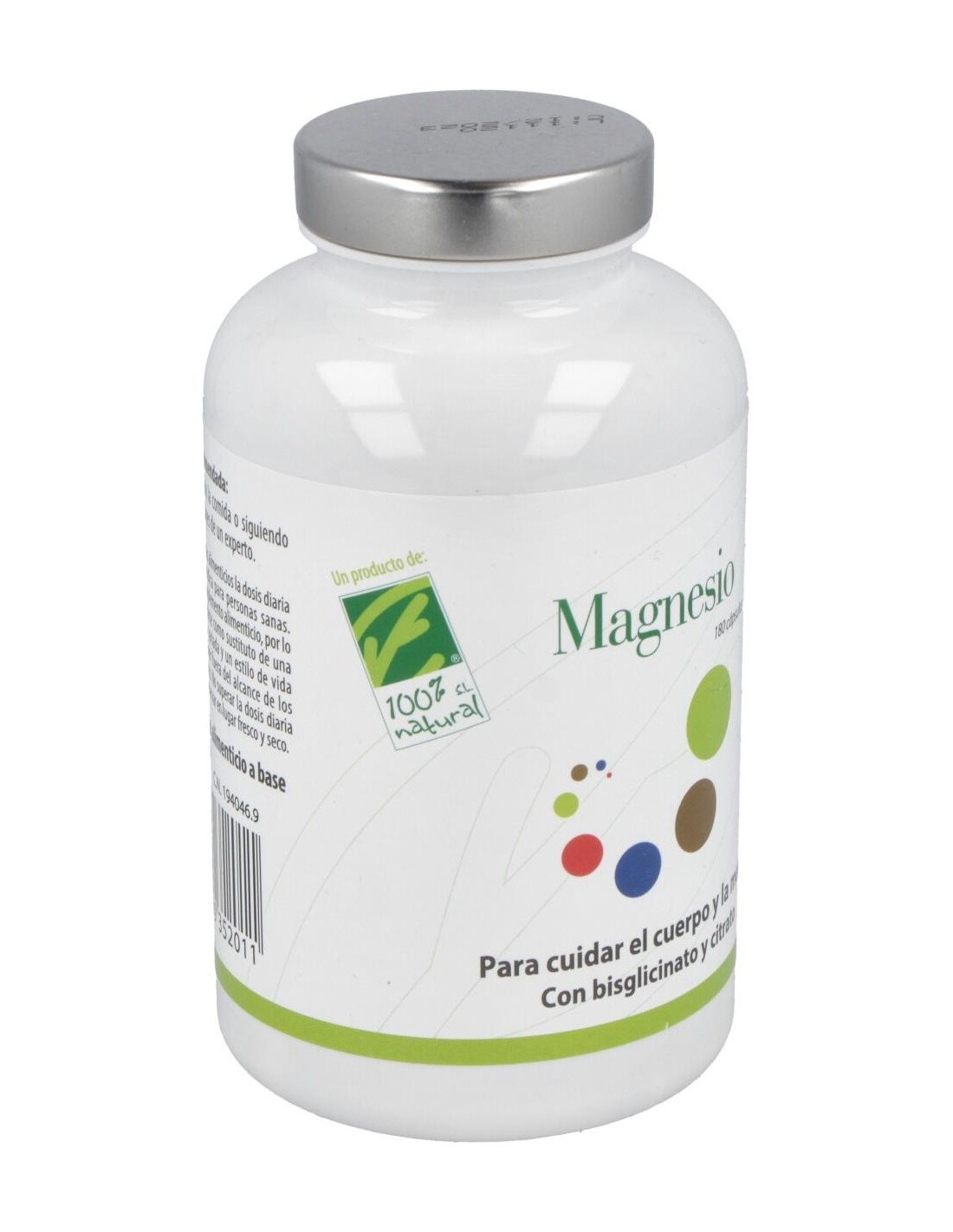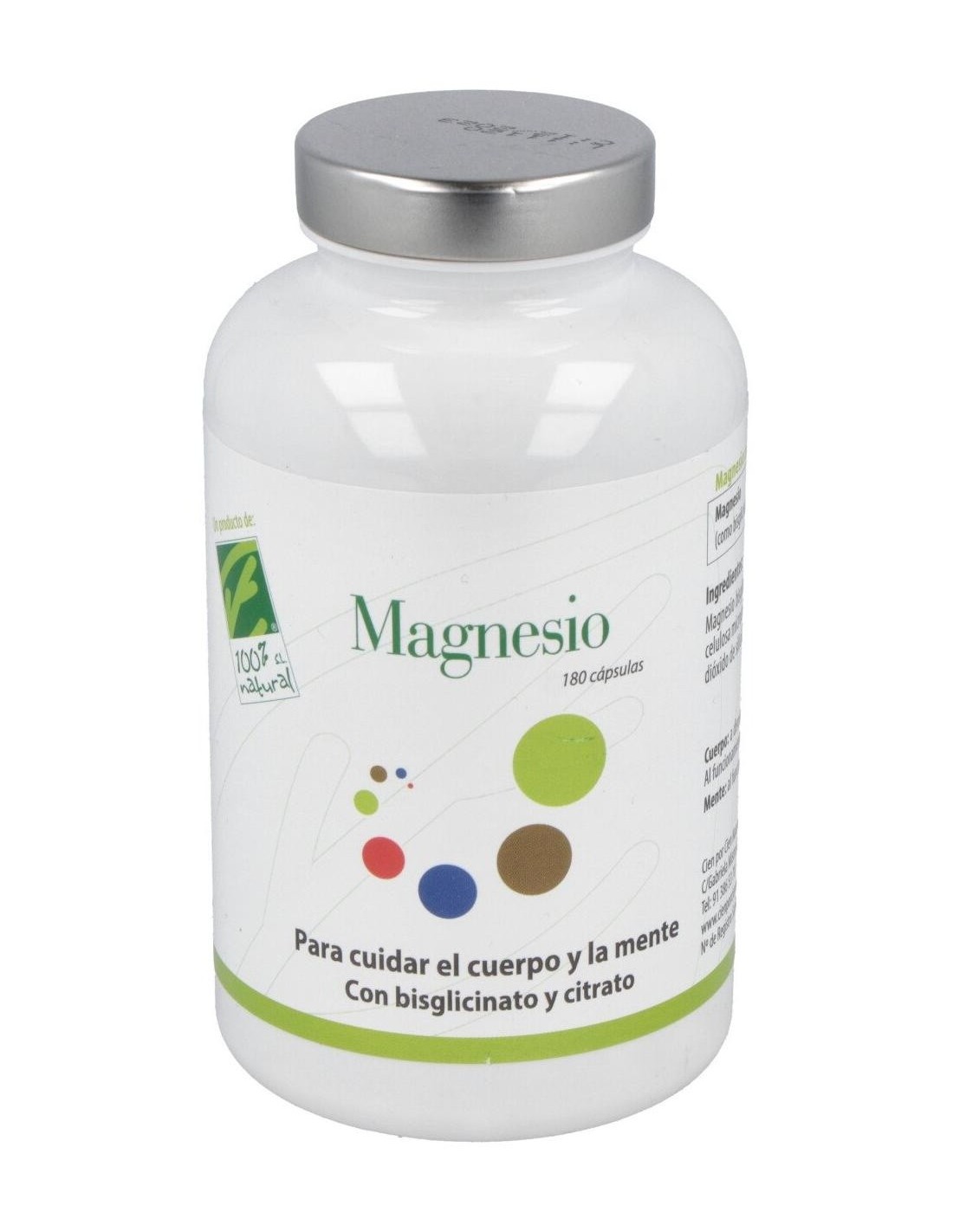 100% Natural Magnesio 180 cápsulas es un complemento alimenticio a base de magnesio que nos ayudará a cuidar nuestra mente y cuerpo. El magnesio es un nutriente que colabora a reducir el cansancio y fatiga de nuestro cuerpo, además de contribuir en nuestro metabolismo energético normal y a la síntesis proteica normal.