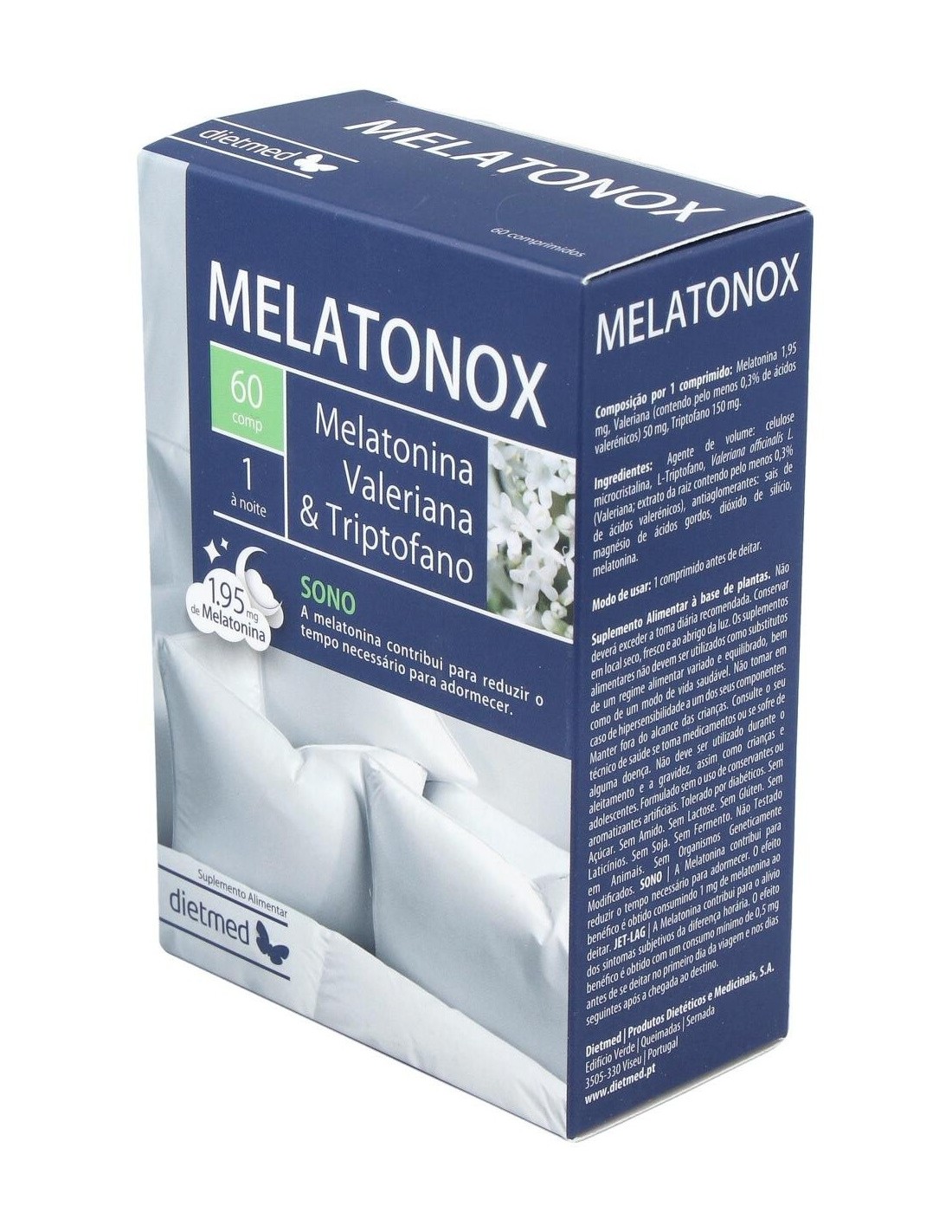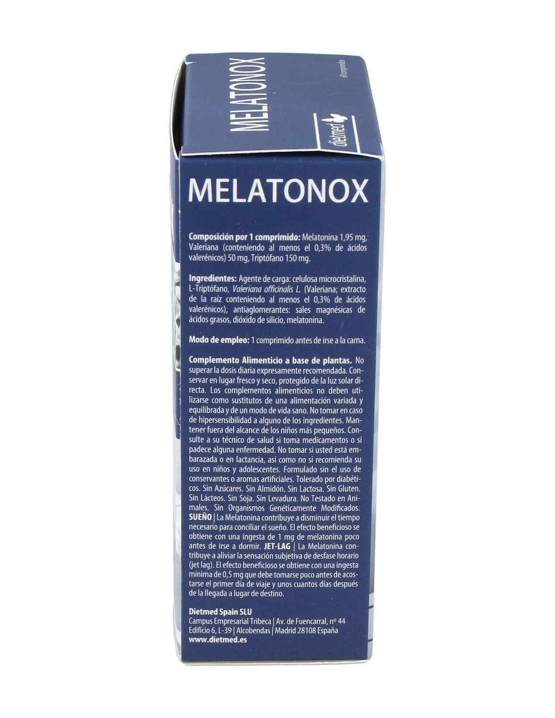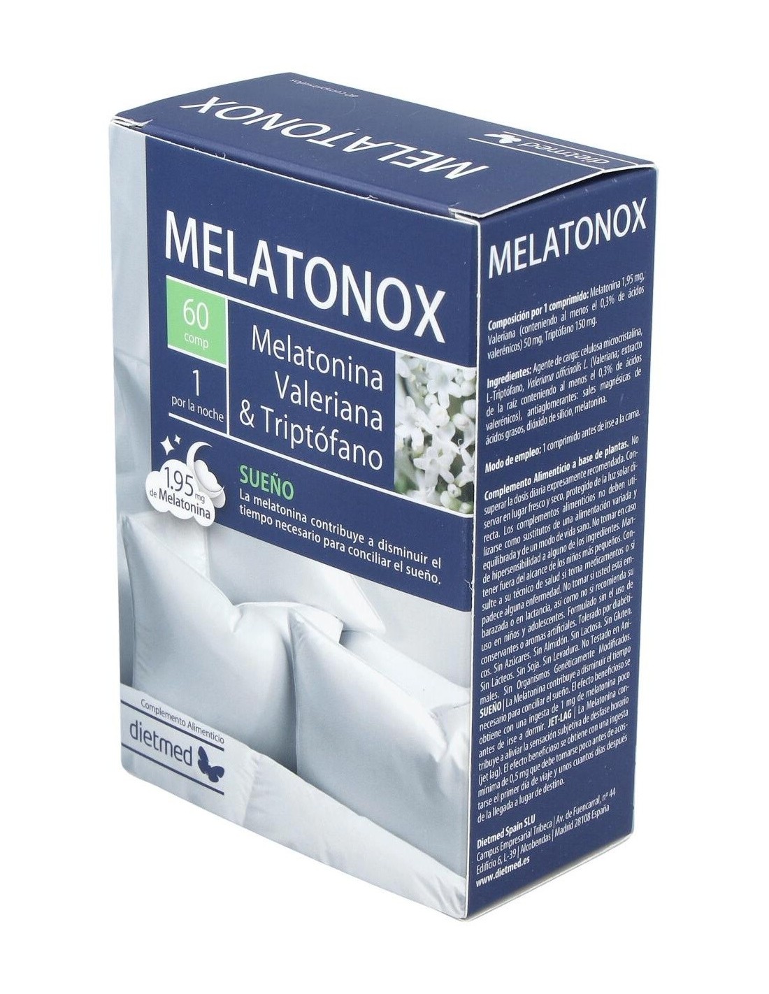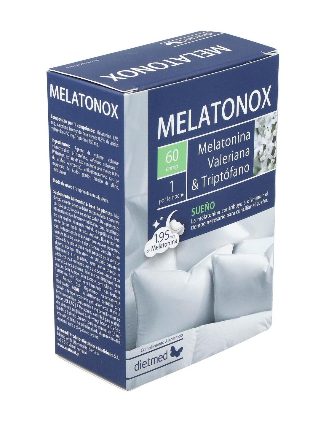 DietMed Melatonox Melatonina Valeriana & Triptofano 60comp es un complemento alimenticio en formato comprimido, que está indicado para ayudar a conciliar el sueño y conseguir un mejor descanso. A base de melatonina, valeriana y triptófano, su fórmula está dirigida a solucionar los trastornos del sueño, especialmente el insomnio, reduciendo los efectos del estrés.