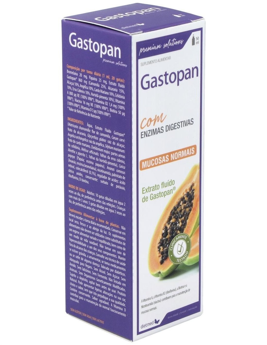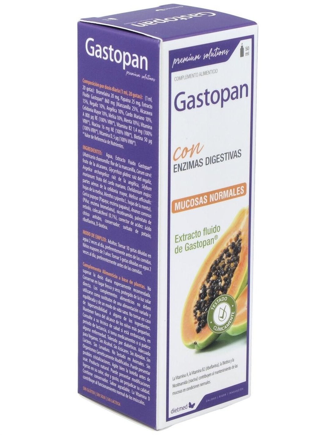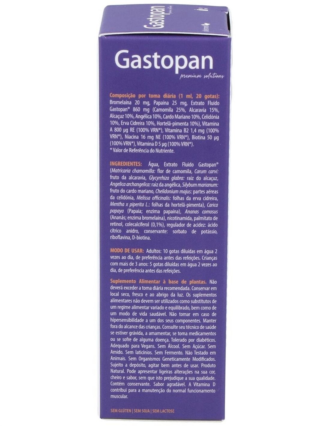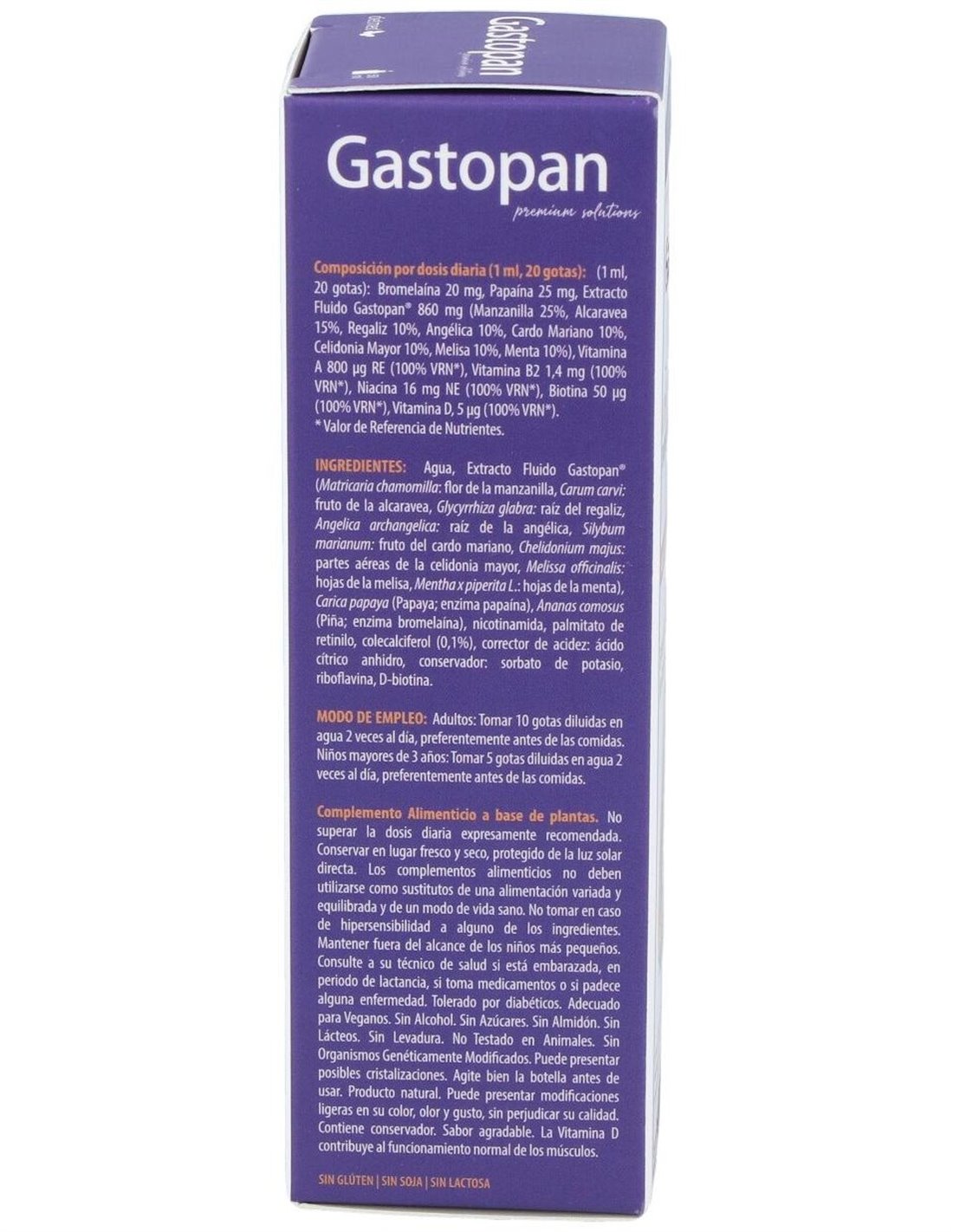 Bromelaína 20 mg, Papaína 25 mg, Extracto Fluido Gastopan® 860 mg (Camomila 25%, Alcaravia 15%, Regaliz 10%, Angélica 10%, Cardo Mariano 10%, Celidónia 10%, Melisa 10%, Menta 10%), Vitamina A 800 µg RE (100% VRN*), Vitamina B2 1,4 mg (100% VRN*), Niacina 16 mg NE (100% VRN*), Biotina 50 µg (100% VRN*), Vitamina D 5 µg (100% VRN*).