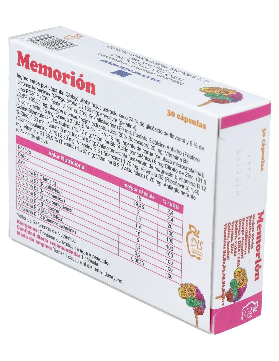 Por cápsula: Ginkgo Biloba 300mg, Fosfatidilserina 100mg, Fósforo 10mg, Taurina 10mg, Inositol 10mg, Colina 10mg, Zinc 2mg, Tiamina (vitamina B1) 0,21mg, Riboflavinas (vitamina B2) 0,25mg, Nicotinamida (vitamina B3) 1,10mg, Ácido fólico (vitamina B9) 1,20mg, Cianocobalamina (vitamina B12) 0,3mg.