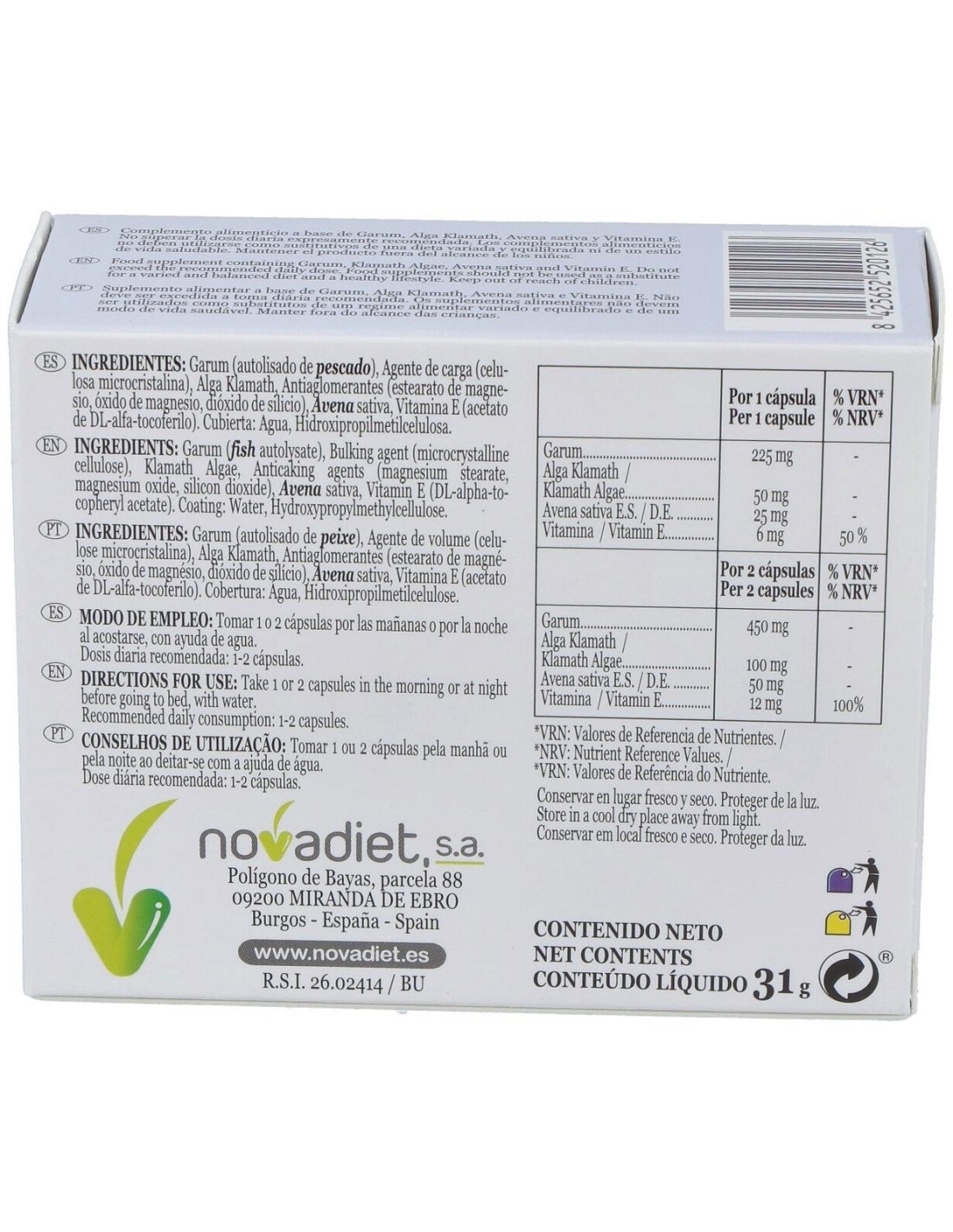 Garum (autolisado de pescado), Agente de carga (celulosa microcristalina), Alga Klamath, Antiaglomerantes (estearato de magnesio, óxido de magnesio, dióxido de silicio), Avena sativa, Vitamina E (acetato de DL-alfa-tocoferilo). Cubierta: Agua, Hidroxipropilmetilcelulosa.