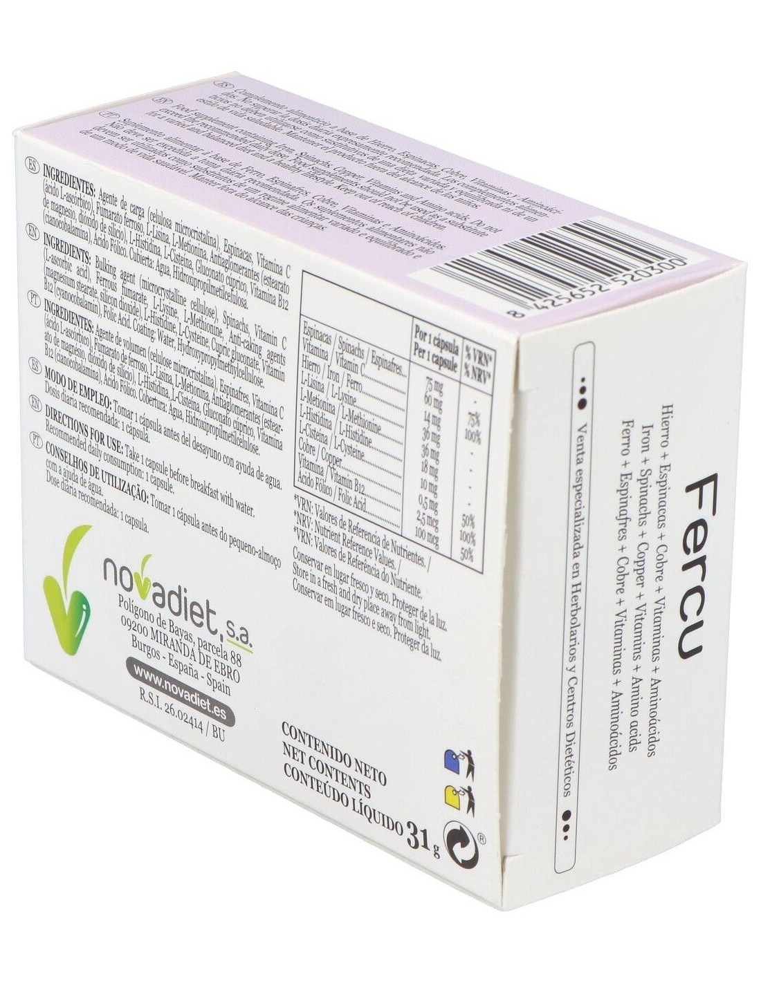 Las cápsulas Novadiet Fercu aportan hierro a nuestro organismo que, junto con otros ingredientes naturales, ayudan a nuestro cuerpo a su mejor absorción para aumentar los niveles de hierro en sangre y así ayudarnos en esas épocas de cansancio extra provocado por la anemia.
