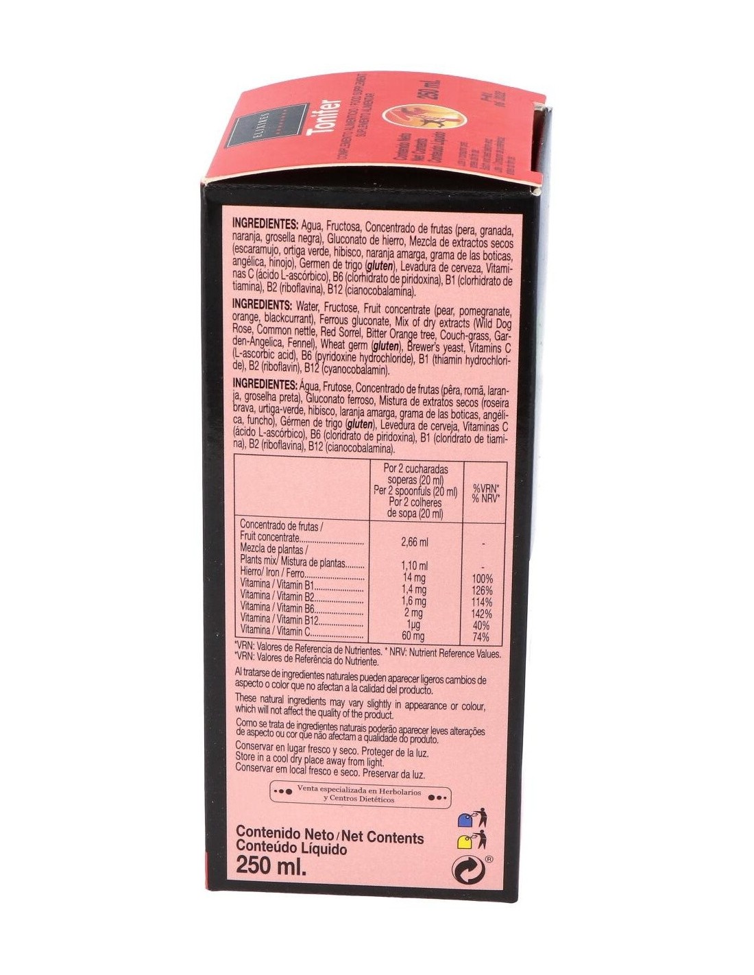 Agua, Fructosa, Concentrado de frutas [pera (sulfitos), granada, naranja, grosella negra], Gluconato de hierro, Mezcla de plantas (Escaramujo, Ortiga verde, Hibisco, Naranja amarga, Grama de las boticas, Angélica, Hinojo), Germen de trigo (gluten), Levadura de cerveza, Vitaminas C (ácido L-ascórbico), B6 (clorhidrato de piridoxina), B1 (clorhidrato de tiamina), B2 (riboflavina), B12 (cianocobalamina).