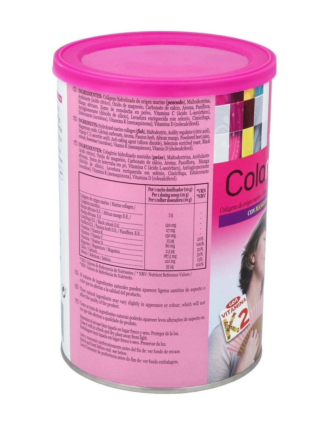 Colágeno hidrolizado de origen marino (pescado), Maltodextrina, Acidulante (ácido cítrico), Óxido de magnesio, Carbonato de calcio, Aroma, Pasiflora (E.S. titulado a >2% en flavonoides totales expresados como vitexina), Mango africano (E.S. 10:1), Zumo de remolacha en polvo, Vitamina C (ácido L-ascórbico), Antiaglomerante (dióxido de silicio), Levadura enriquecida con selenio, Cimicífuga (E.S. 10-14:1), Edulcorante (sucralosa), Vitamina K (menaquinona), Vitamina D (colecalciferol).