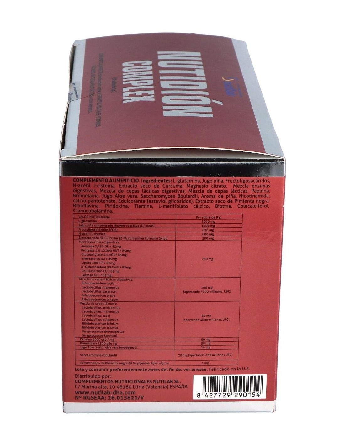 L-glutamina, jugo de piña, fructooligosacáridos, N-acetil L-cisteína, extracto seco de cúrcuma, magnesio citrato, mezcla enzimas digestivas, mezcla de cepas lácticas digestivas, mezcla de cepas lácticas, papaína, bromelaína, jugo de aloe vera, saccharomyces boulardii, aroma de piña, nicotinamida, calcio pantotenato, steviol glucósidos, extracto seco de pimienta negra, riboflavina, piridoxina, tiamina, L-metilfolato cálcico, biotina, colecalciferol, cianocobalamina.