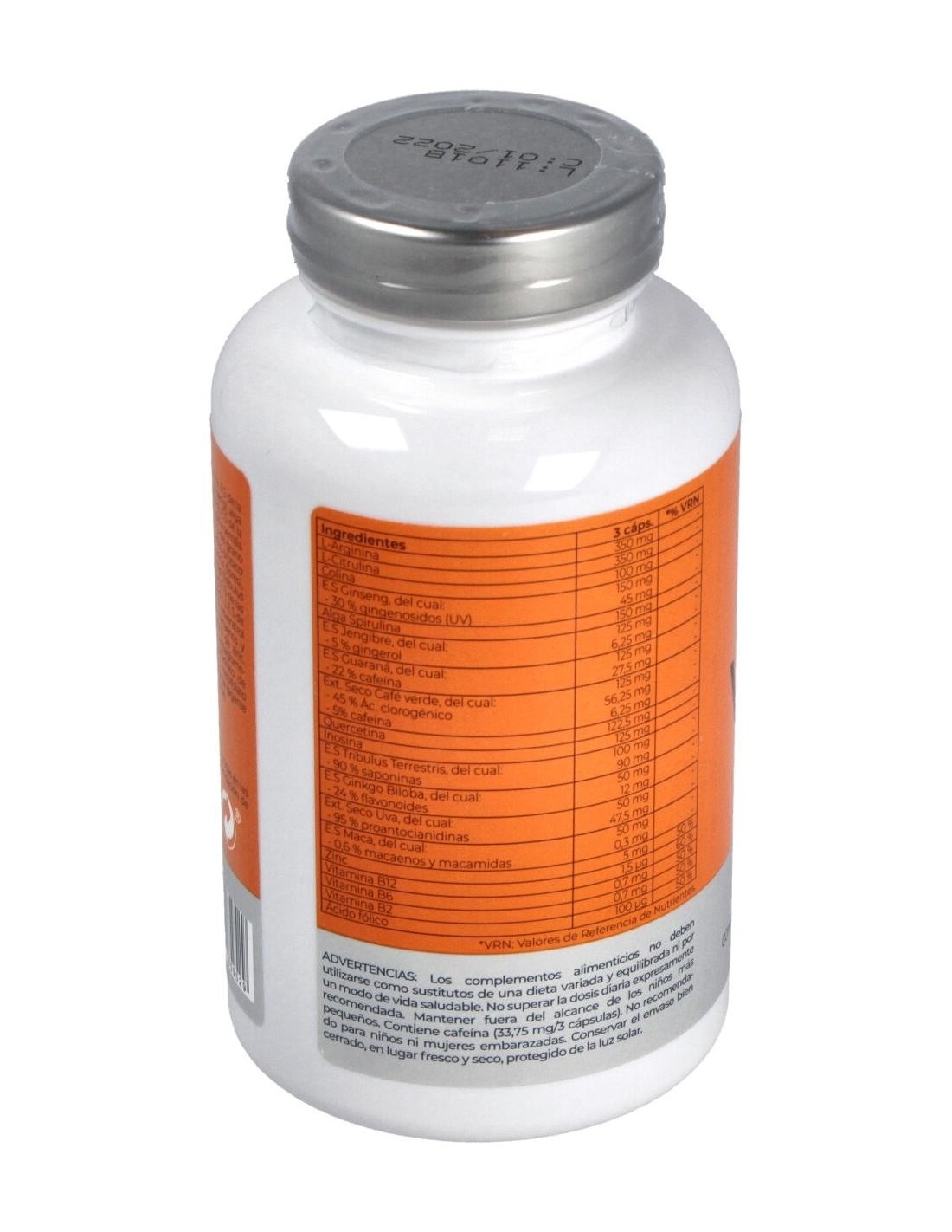 L-arginina, L-citrulina, bitartrato de colina, ext. seco de la raíz y hojas de ginseng coreano 30 % (UV) (Panax ginseng), alga spirulina en polvo 60 % de proteína (Spirulina platensis), ext. seco de la raíz de jengibre 5 % gingerol (Zingiber officinalis), ext. seco de la semilla de guaraná 22 % cafeína (Paullina cupana Kunth), ext. seco del grano de café verde 45 % ácido clorogénico y 5 % cafeína (Coffea arabica L.), quercetina 98 % (UV) y 95 % HPLC (Sophora japonica, flores), inosina, ext. seco del fruto de tribulus terrestris 90 % saponinas (Tribulus terrestris L.), celulosa microcristalina (agente de carga), ext. seco de las hojas de ginkgo biloba 24 % flavonoides (Ginkgo biloba L.), ext. seco de las semillas de uva 95 % proantocianidinas (UV) y 5 % resveratrol (Vitis vinífera L.), ext. seco de la raíz de maca 0,6% macaenos y macamidas 10:1 (Lepidium meyenii walp), gluconato de zinc, estearato de magnesio vegetal y dióxido de silicio (antiaglomerantes), metilcobalamina 0,1 % (vitamina B12), clorhidrato de piridoxina (vitamina B6), riboflavina (vitamina B2), L-metilfolato cálcico (ácido fólico), cápsula: hidroxipropilmetilcelulosa (agente de recubrimiento) y óxido de hierro rojo E-172 (colorante).