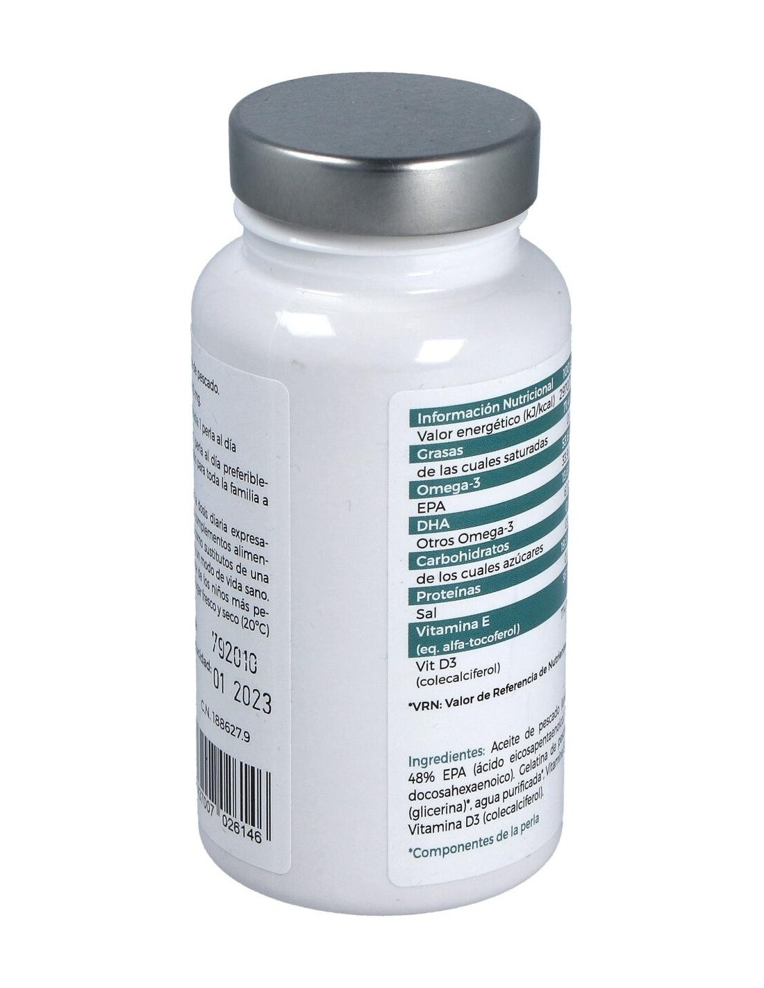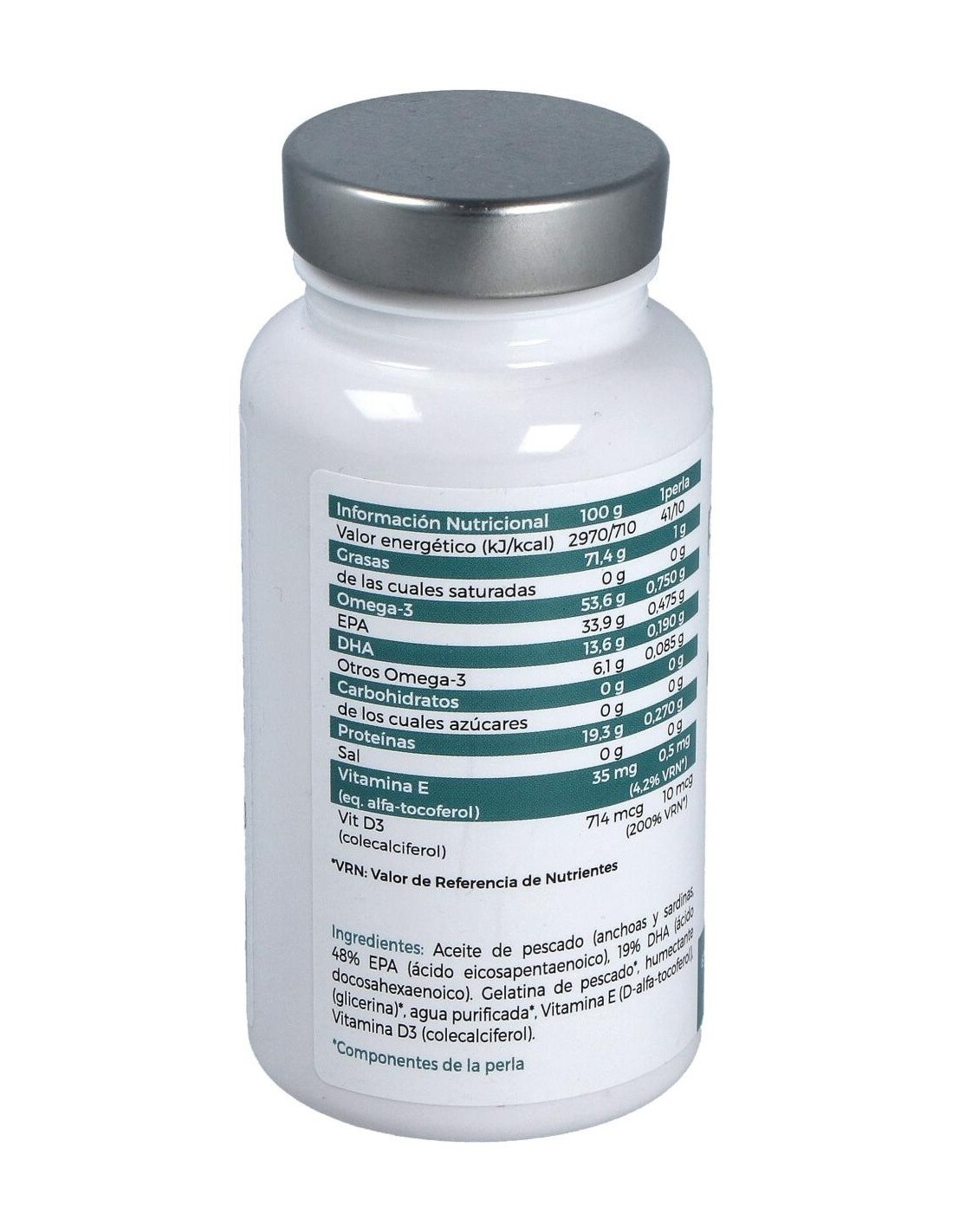 Aceite de pescado (anchoas y sardinas salvajes) [48% EPA (ácido eicosapentaenoico)/ 19% DHA (ácido docosahexaenoico)] y Vitamina E (D-alfa-tocoferol). Perla [gelatina natural de pescado, humectante (glicerina) y agua purificada].