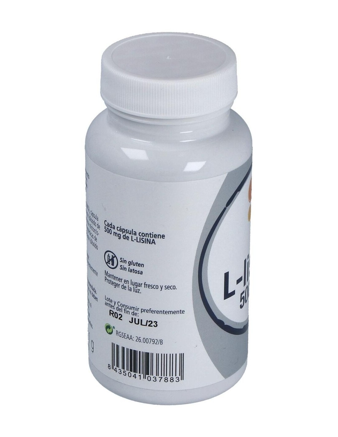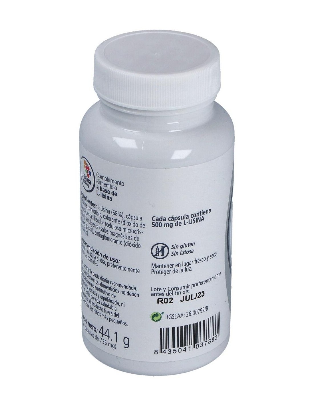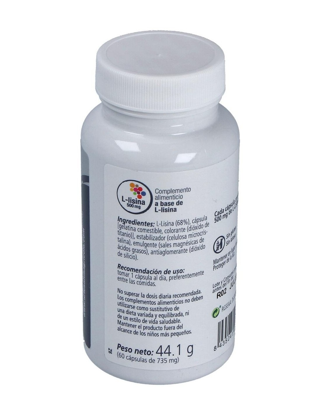 L-Lisina, Cápsula [gelatina comestible, colorante (dióxido de titanio)], Estabilizador (celulosa microcristalina), Emulgente (sales magnésicas de ácidos grasos), Antiaglomerante (dióxido de silicio.).