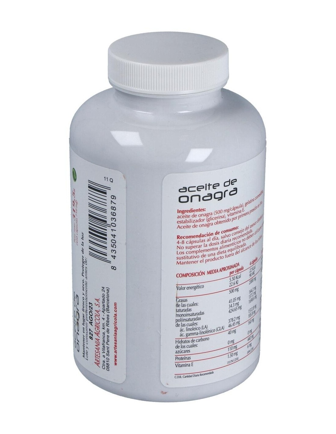 Vit.E 10 mg.(10 u.i.)/ aceite de onagra 500 mg. extraído por primera presión de sus semillas con la siguiente fracción lipídica: ác.gr.sat. (ácido palmítico 5-6%: ácido esteárico 1-2%), monosat. (ácido oléico 10-14%), poliinsat. (ácido linoleico 69-73%, ácido gammalinolénico 8% o superior)