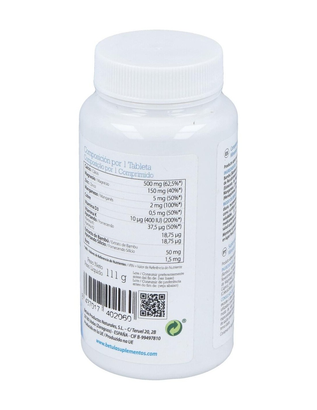 Carbonato de Calcio, Óxido de Magnesio, Extracto de Bambú (Bambusa arundinacea), Agente de Carga (Fosfato Dicálcico), Agente de Recubrimiento (Hidroxipropil Metilcelulosa, Glicerina), Antiaglomerante (Estearato de Magnesio), Citrato de Zinc, Borato de Sodio, Citrato de Manganeso, Citrato de Cobre, Vitamina K1 (Fitomenadiona), Vitamina K2 (Menaquinona), Vitamina D3 (Colecalciferol).
