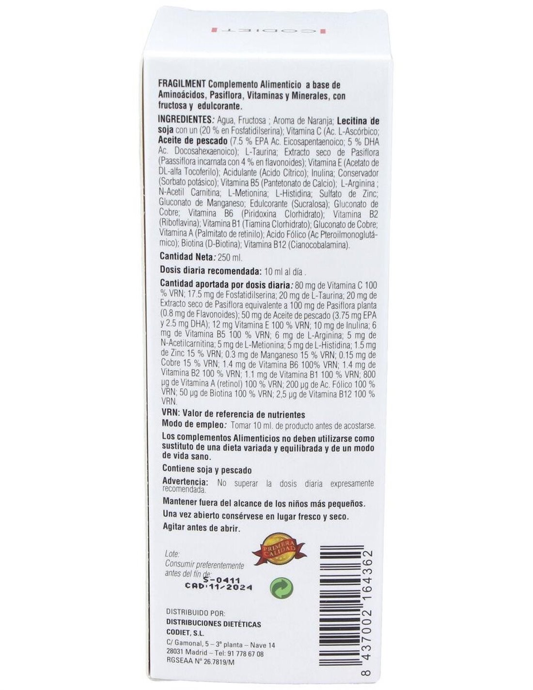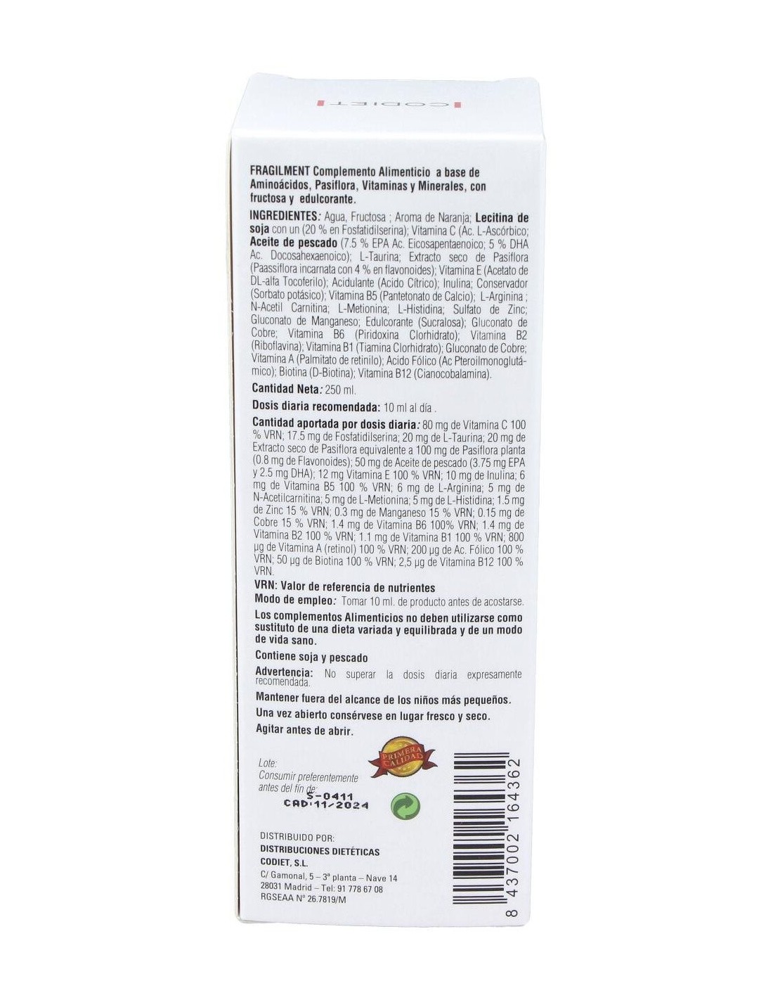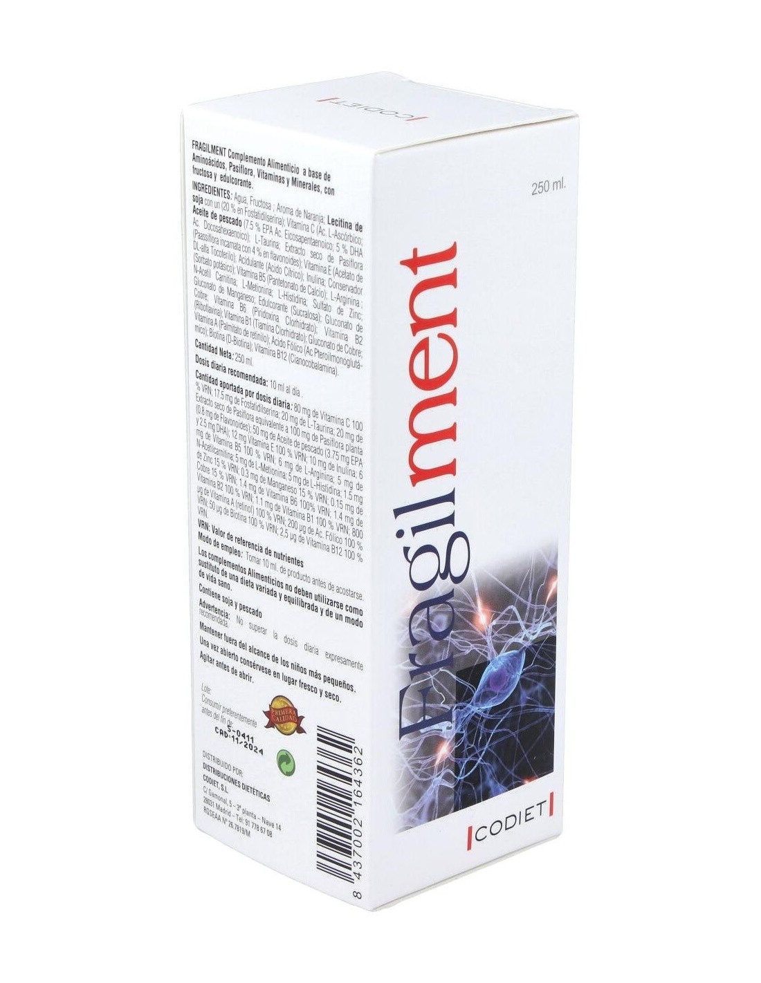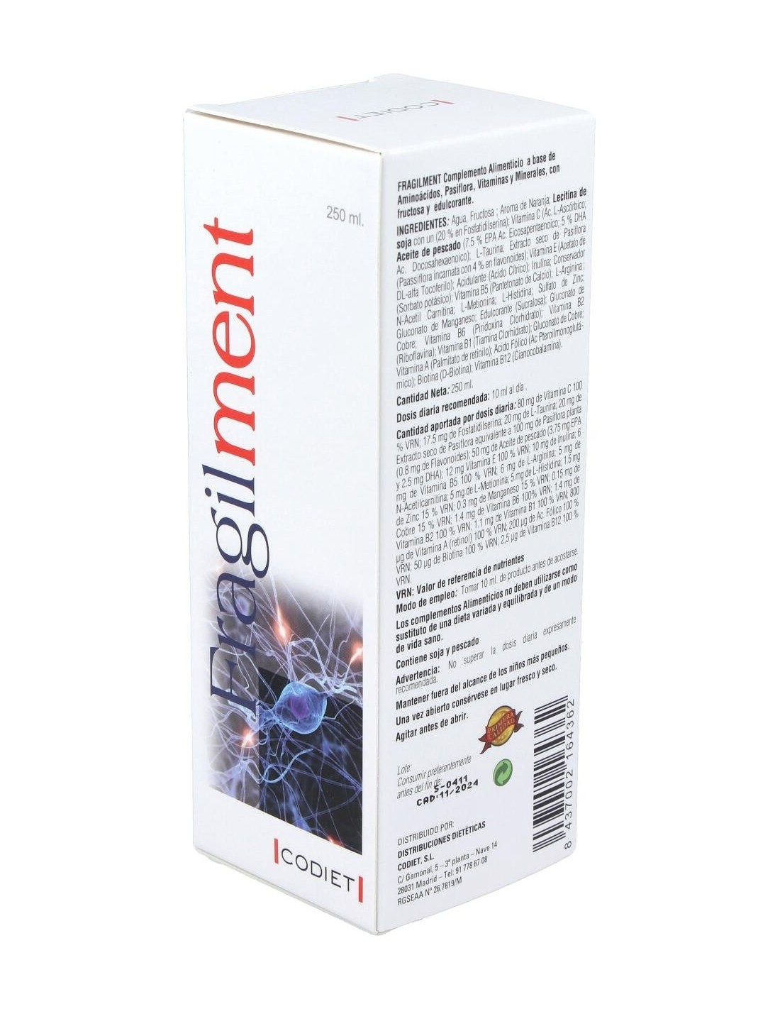 Agua, Fructosa : Aroma de Naranja: Vitamina C (Ac. L-Ascórbico) : Lecitina de soja (35% en fosfatidilserina): Aceite de pescado (12 % DHA ): L-Taurina: Extracto seco de Pasiflora (Passiflora incarnata) : Acido Cítrico: Vitamina E (Acetato de DL-alfa Tocoferilo): Inulina: Vitamina B5 (Pantetonato de Calcio): L-Arginina : N-Acetil Carnitina : L-Metionina : L-Histidina: Sulfato de Zinc: Gluconato de Manganeso: Melatonina: Gluconato de Cobre: Vitamina B6 (Piridoxina Clorhidrato): Vitamina B2 (Riboflavina): Vitamina B1 (Tiamina Clorhidrato):Vitamina A (Palmitato de retinilo ): Ácido Fólico (Ác. Pteroilmonoglutámico): Biotina (D-Biotina): Vitamina B12 (Cianocobalamina).