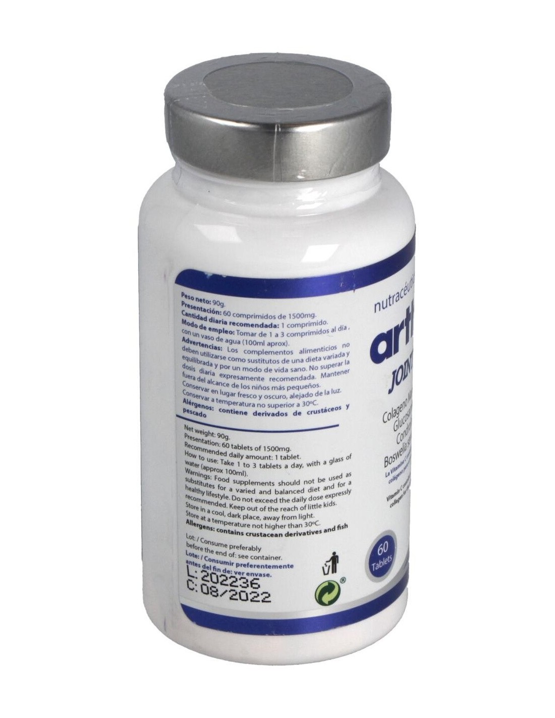 Agente de carga (Celulosa microcristalina), Glucosamina sulfato potásica 400mg, Sulfato de condroitina (90% Condroitina) 100m9 (90m9 de Condroitina), Extracto seco de Harpagofito (Harpagophytum procumbens (Burch.) DC., 2% Harpagosidos) 100 mg, MSM (Metil Sulfonil Metano) 100mg, Vitamina C (Ácido L-ascórbico) 80mg (100% VRN*), Colágeno hidrolizado marino 50 mg, Extracto seco de Cúrcuma (Curcuma tonga L., 95% Curcuminoides) 50 mg, Extracto seco de Boswellia (Boswellia serrata, 65% Ácido boswélico) 50 mg, Carbonato de calcio 25mg (10mg de Calcio, 1,25%VRN*), Citrato de magnesio 25mg (4,25mg de Magnesio, 1,1%VRN*), Hialuronato sódico (95% Ácido hialurónico) 10mg (9,5m9 Ácido hialurónico), Antiaglomerante (Estearato de magnesio), Extracto seco de Pimienta negra (Piper nigrum L., 95% Piperina) 10mg, Antiaglomerante (Dióxido de silicio) y Vitamina D3 (Colecalciferol, 100.000 UI/g) 2mg (5 mcg de Vitamina D3, 100%VRN*).