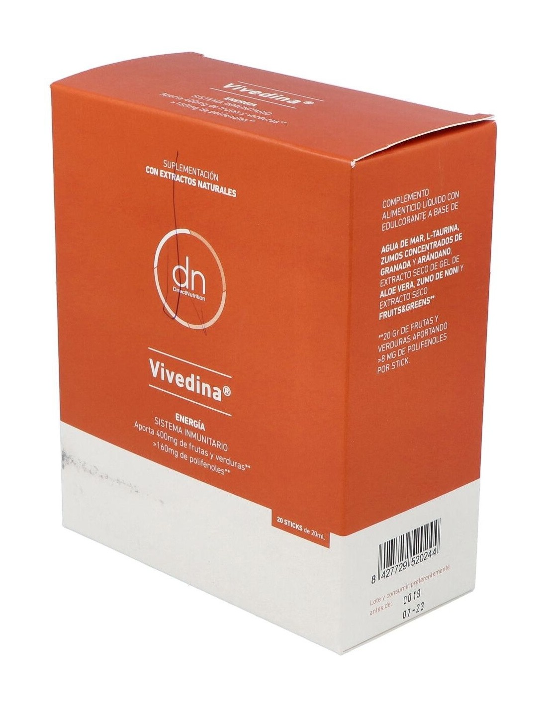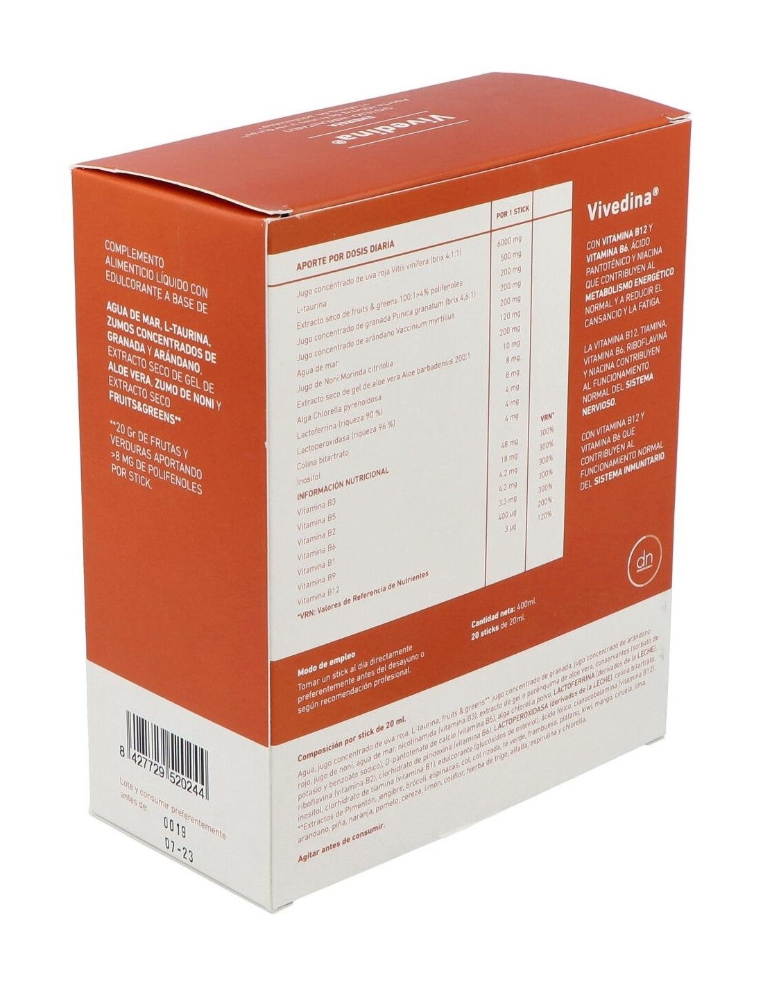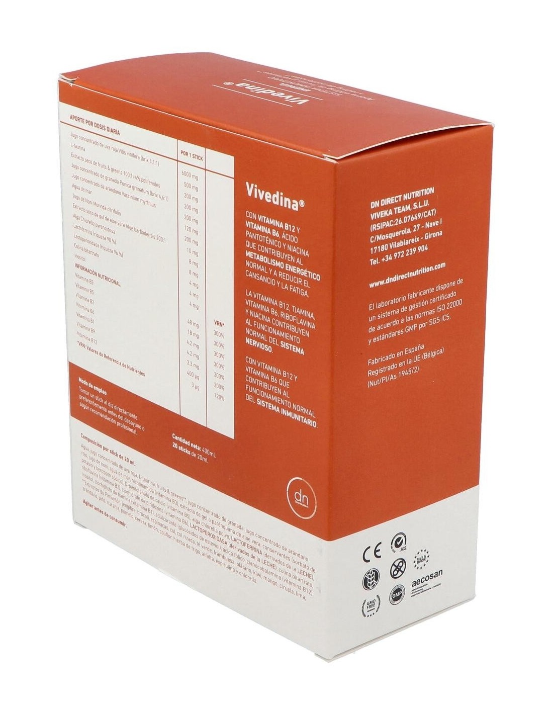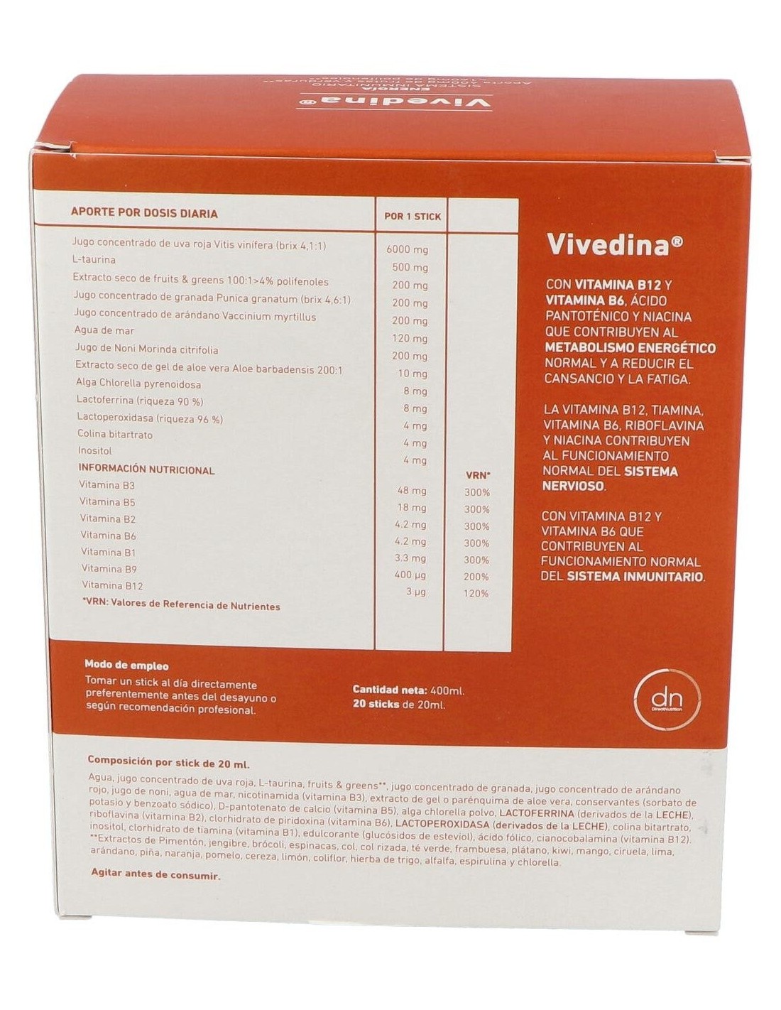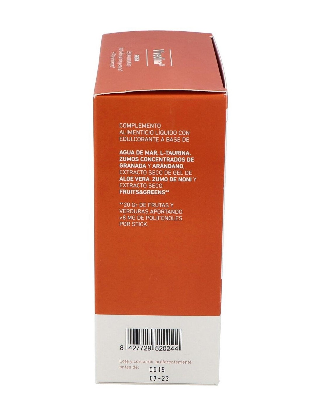 1 stick: Ext. Seco Aloe Vera (Barbadensis Miller) 10x > 10.00mg polisaccharide 0.20 ml, Agua de Mar Polvo 2000 (mg), Uva roja (Vitis vinifera) jugo concentrado 62,5-66,5ºbrix, fruto 6000 miligramos (mg), L-Taurina >98.5% 500 miligramos (mg), Granada (Punica granatum) jugo concentrado polvo 200 miligramos (mg), Noni polvo, fruto (Morinda Citrifolia) 200 miligramos (mg), Nicotinamida, Vitamina B3 (98-101.5%) 48 miligramos (mg), Pantotenato Calcico, Vitamina B5 (98-101%) 18 miligramos (mg), Ext. Seco Fruits&Greens 200 mg, Alga Chlorella polvo, Chlorella Pyrenoidosa Chick 55-70% proteínas 8 miligramos (mg), Lactoferrina 93%, proteína bioactiva 8 miligramos (mg), Riboflavina, Vitamina B2 4,2000 miligramos (mg), Piridoxina clorohidrato (Vitamina B6) (99 -101)% riqueza 4,2 miligramos (mg), Inositol 97% 4 miligramos (mg), Colina bitartrato 4 miligramos (mg), Lactoperoxidasa 96%, enzima bioactiva leche 4 miligramos (mg), Tiamina clorhidrato, Vitamina B1 3,3 miligramos (mg), Ácido Fólico, folato Vitamina B9 0,40 miligramos (mg), Cianocobalamina, Vitamina B12 0.003 miligramos (mg).