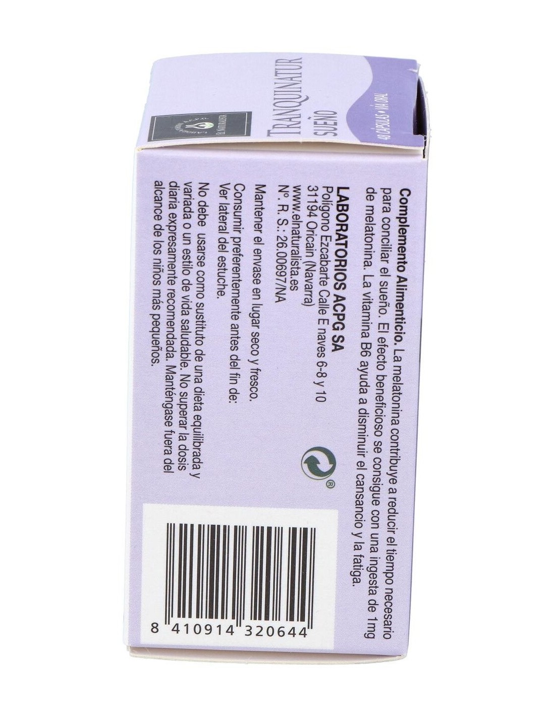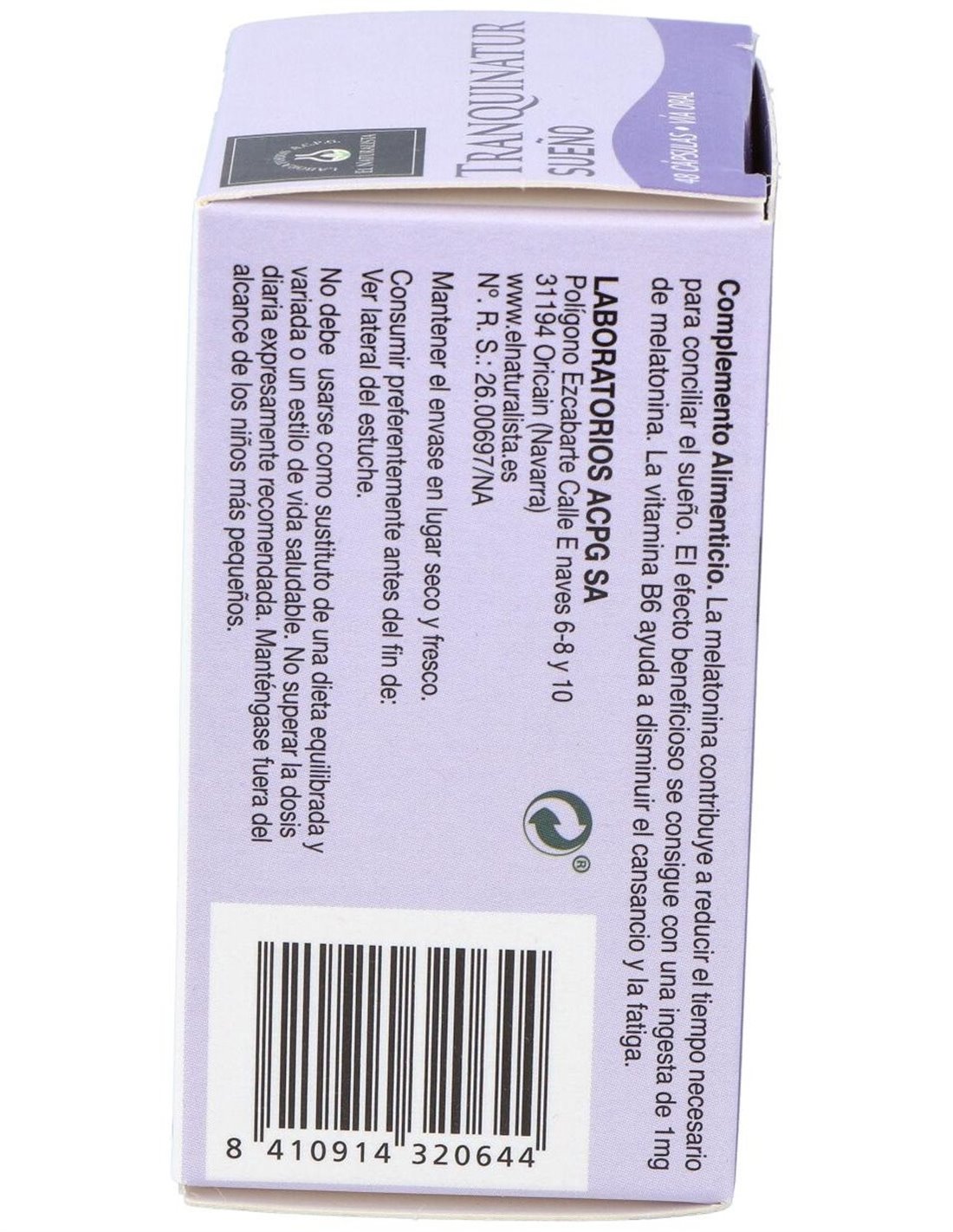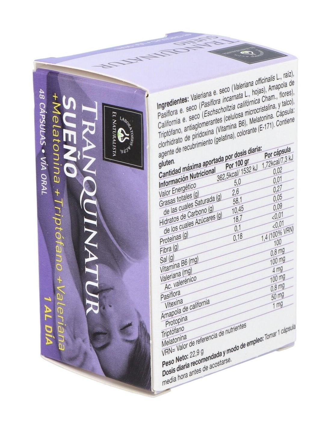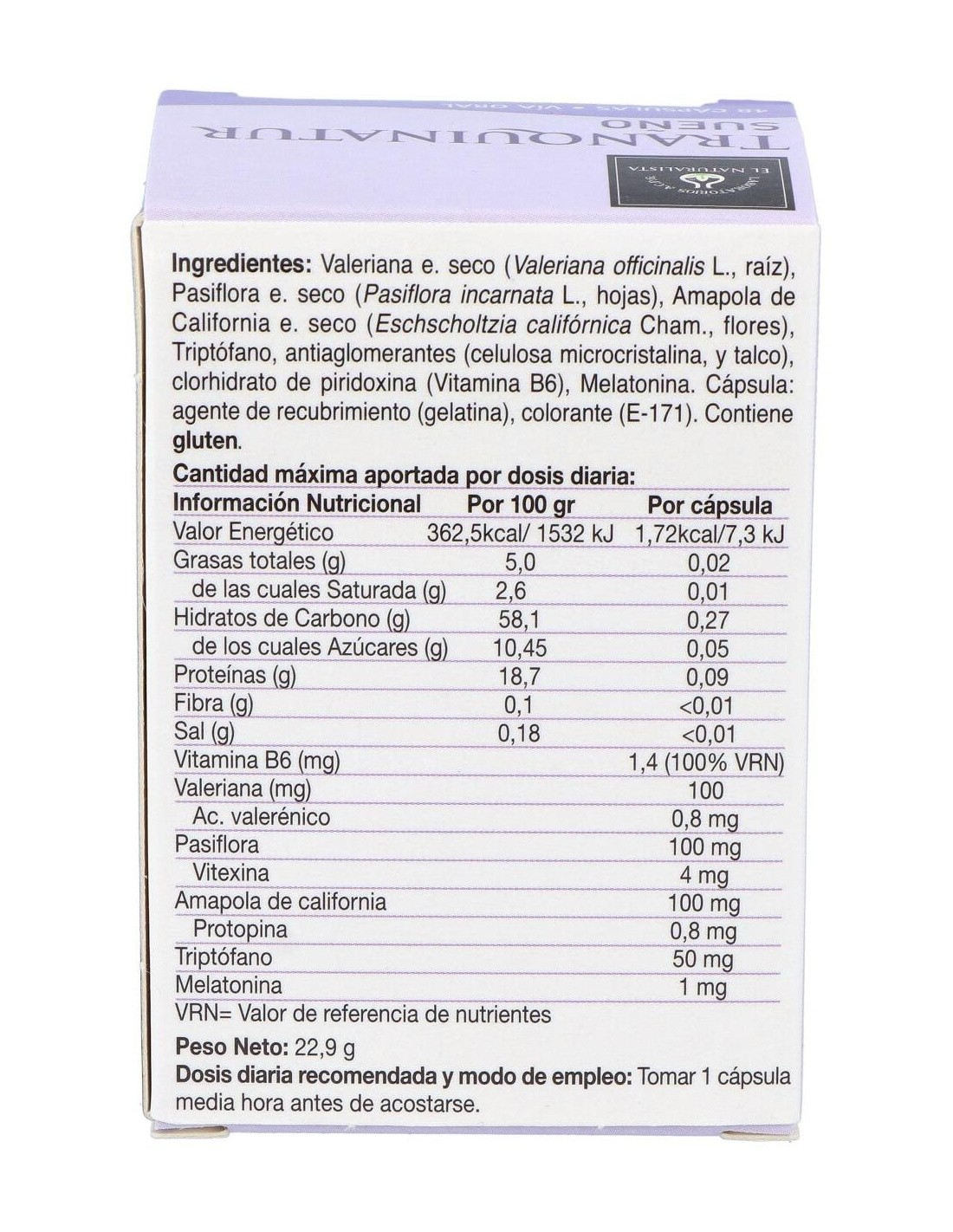 100 mg de E. seco valeriana 0,8% valerénico, 100 mg de E. seco pasiflora 4% vitexina, 100 mg de E. seco Amapola de California 0,8% alcaloides (protopina), 50 mg de Triptófano, 1 mg de Melatonina, 1,4 mg de Vitamina B6 y csp de Excipientes (talco, celulosa microcristalina y gelatina (cápsula)).