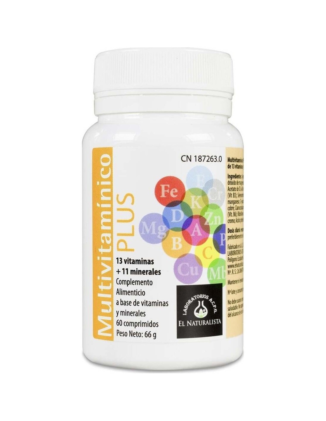 Agentes de carga (Fosfato bicalcico, celulosa microcristalina): Hidróxido de magnesio: L-ascorbato cálcico (Vit. C): Fumarato ferroso: Citrato de Zinc: Acetato de DL-alfa-tocoferilo (Vit. E): Menaquinona natural (Vit. K2): Nicotinamida (Vit B3): Selenometionina: Antiaglomerante (estearato de magnesio): Citrato de manganeso: D-pantotenato cálcico (Vit B5): Acetato de retinilo (Vit. A): Citrato de cobre: Cianocobalamina (Vit B12): Colecalciferol (Vit D3): Clorhidrato de piridoxina (Vit. B6): Riboflavina (Vit. B2): Molibdato de sodio: Tiamina (Vit. B1): Picolinato de cromo: ácido pteroilmonoglutámico (Vit B9): Yoduro de potasio: D-biotina.