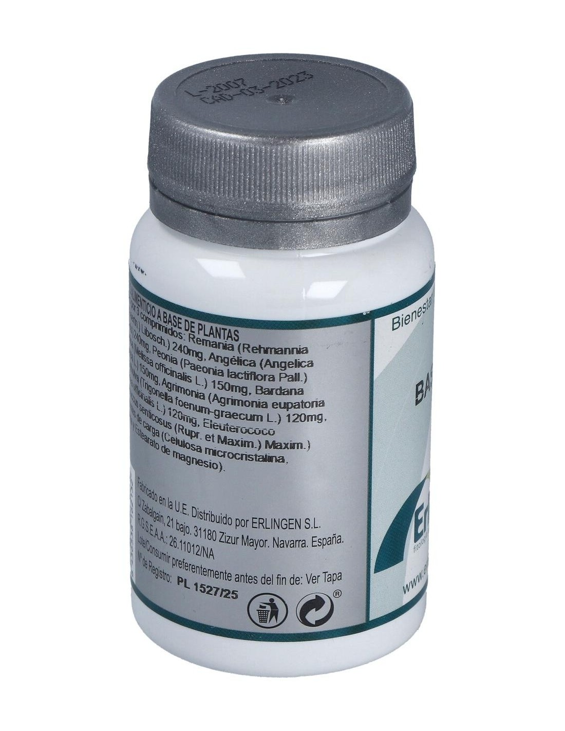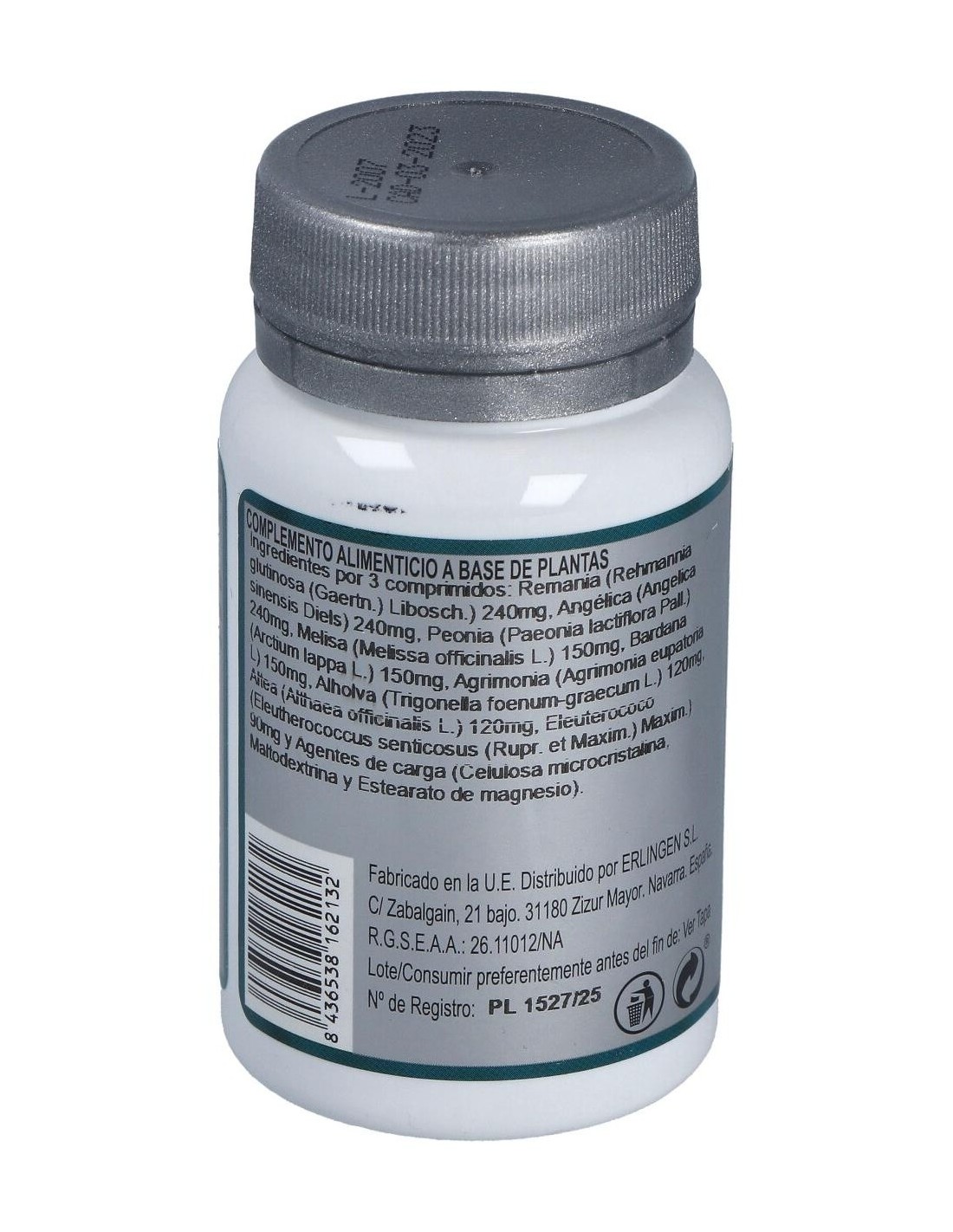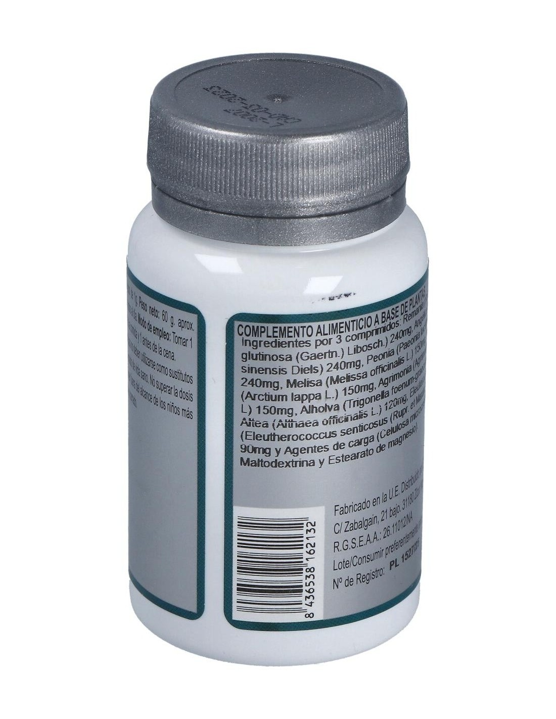 Remania (Rehmannia glutinosa (Gaertn.) Libosch.) 240 mg, Angélica (Angelica sinensis Diels) 240 mg, Peonia (Paeonia lactiflora Pall.) 240 mg, Melisa (Melissa officinalis L.) 150 mg, Bardana (Arctium lappa L.) 150 mg, Agrimonia (Agrimonia eupatoria L) 150 mg, Alholva (Trigonella foenum-graecum L.) 120 mg, Altea (Althaea officinalis L.) 120 mg, Eleuterococo (Eleutherococcus senticosus (Rupr. et Maxim.) Maxim.) 90 mg y Agentes de carga (Celulosa microcristalina, Maltodextrina y Estearato de magnesio).