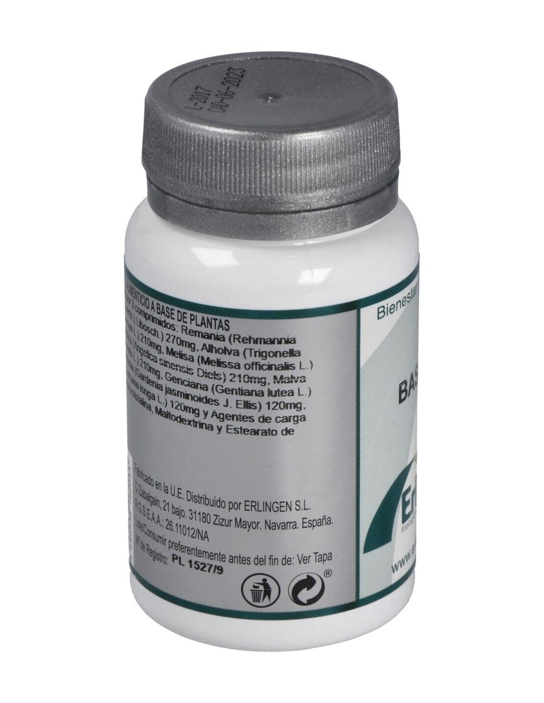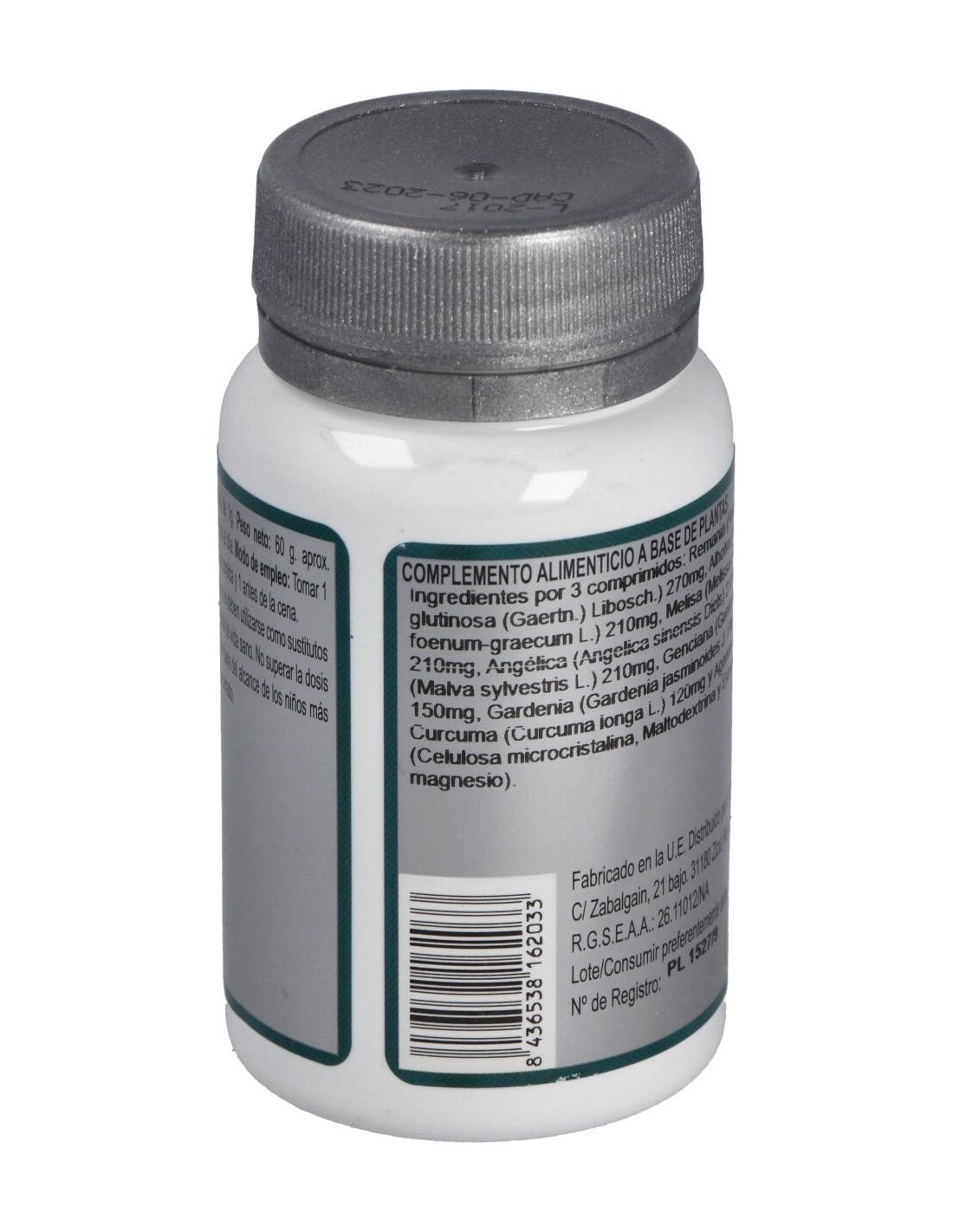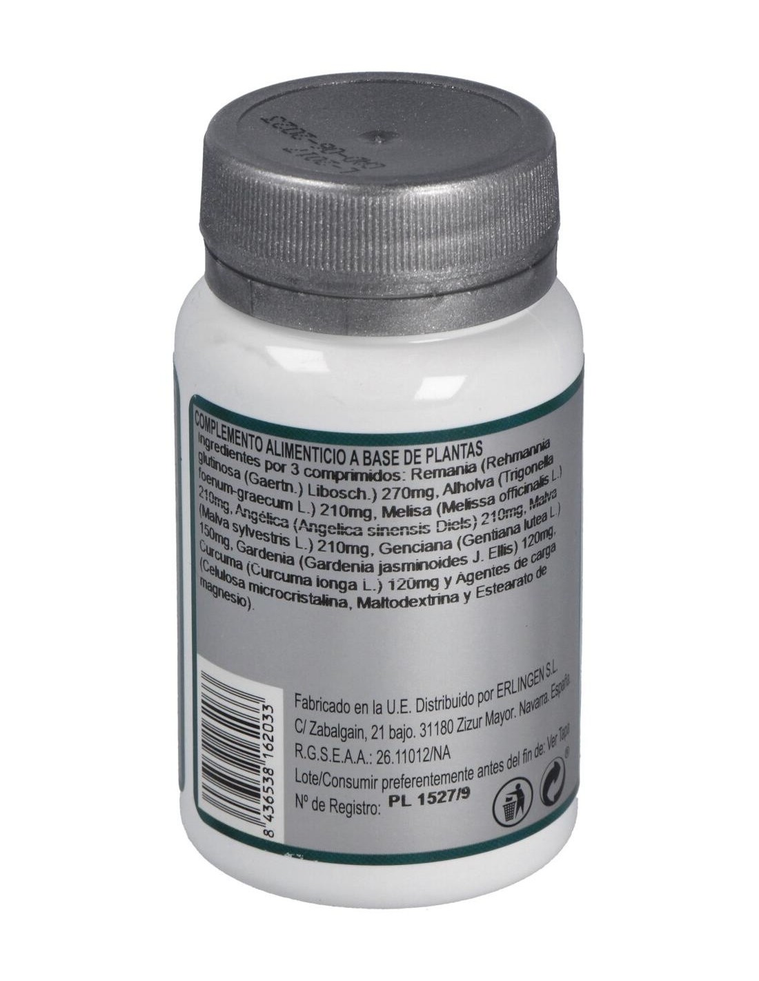 Remania (Rehmannia glutinosa (Gaertn.) Libosch.) 270 mg, Alholva (Trigonella foenum-graecum L.) 210 mg, Melisa (Melissa officinalis L.) 210 mg, Angélica (Angelica sinensis Diels) 210 mg, Malva (Malva sylvestris L.) 210 mg, Genciana (Gentiana lutea L.) 150 mg, Gardenia (Gardenia jasminoides J. Ellis) 120 mg, Cúrcuma (Curcuma longa L.) 120 mg y Agentes de carga (Celulosa microcristalina, Maltodextrina y Estearato de magnesio).