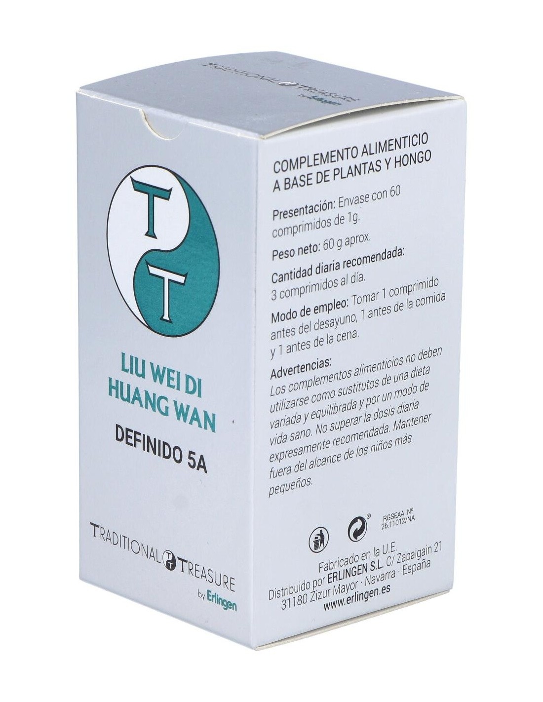 Agentes de carga (Celulosa microcristalina y Maltodextrina), Remania (Rehmannia glutinosa (Gaertn.) DC.) 390 mg, Dioscorea (Diosorea opposita Thunb.) 300 mg, Cornus (Cornus officinalis Siebold & Zucc.) 300 mg, Peonía suffruticosa (Paeonia x suffruticosa Andrews) 180 mg, Alisma (Alisma orientale (Sam.) Juz.) 180 mg, Poria (Poria cocos Wolf) 150 mg y Agente de carga (Estearato de magnesio).