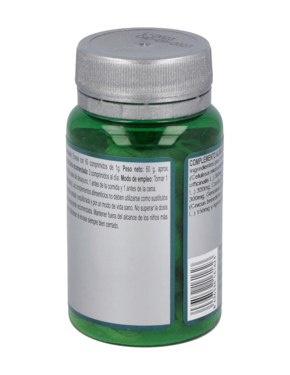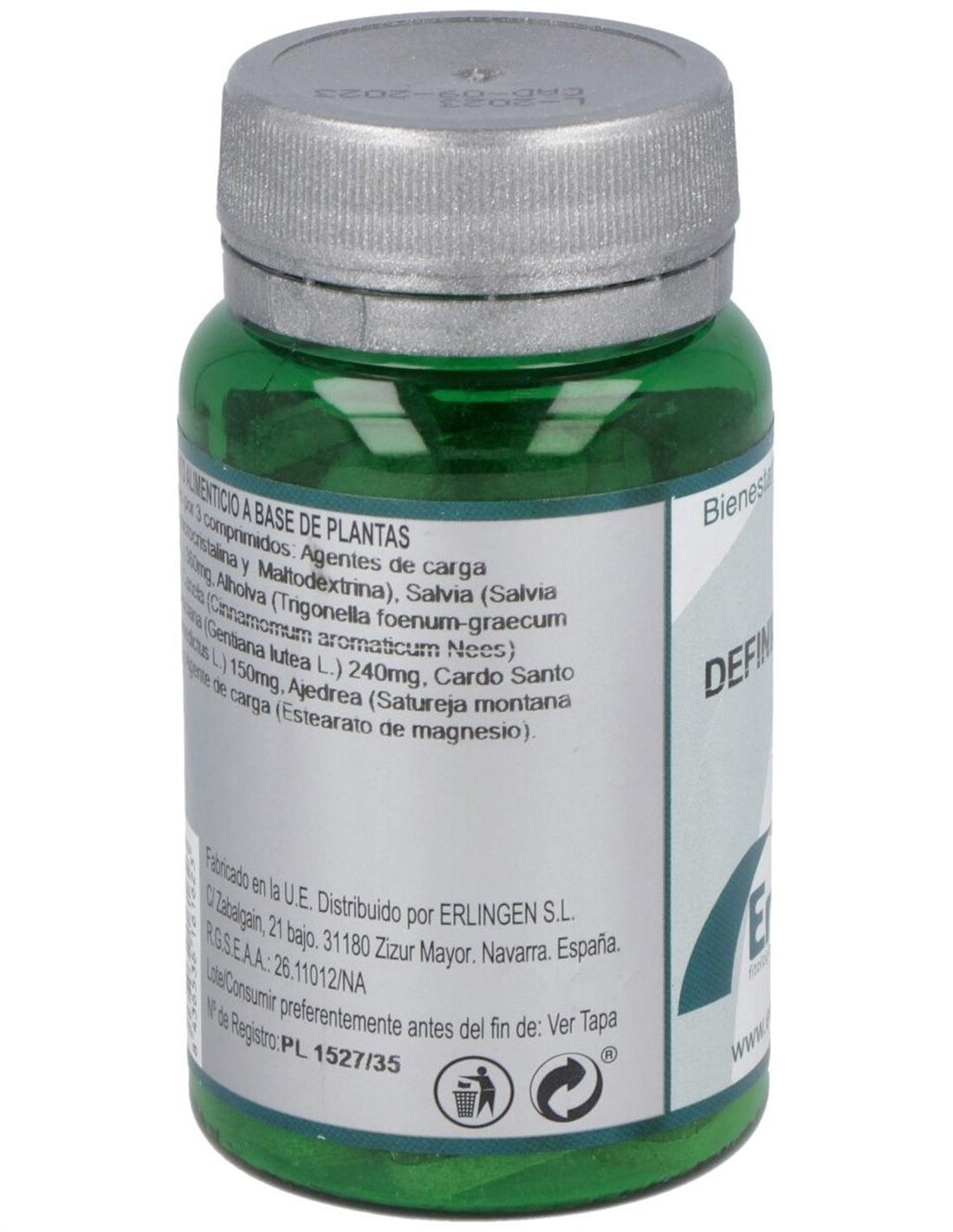 Ingredientes por 3 comprimidos: Agentes de carga (Celulosa microcristalina y Maltodextrina), Salvia (Salvia officinalis L.) 360mg, Alholva (Trigonella foenum-graecum L.) 300mg, Canela (Cinnamomum aromaticum Nees) 300mg, Genciana (Gentiana lutea L.) 240mg, Cardo Santo (Cnicus benedictus L.) 150mg, Ajedrea (Satureja montana L.) 150mg y Agente de carga (Estearato de magnesio).