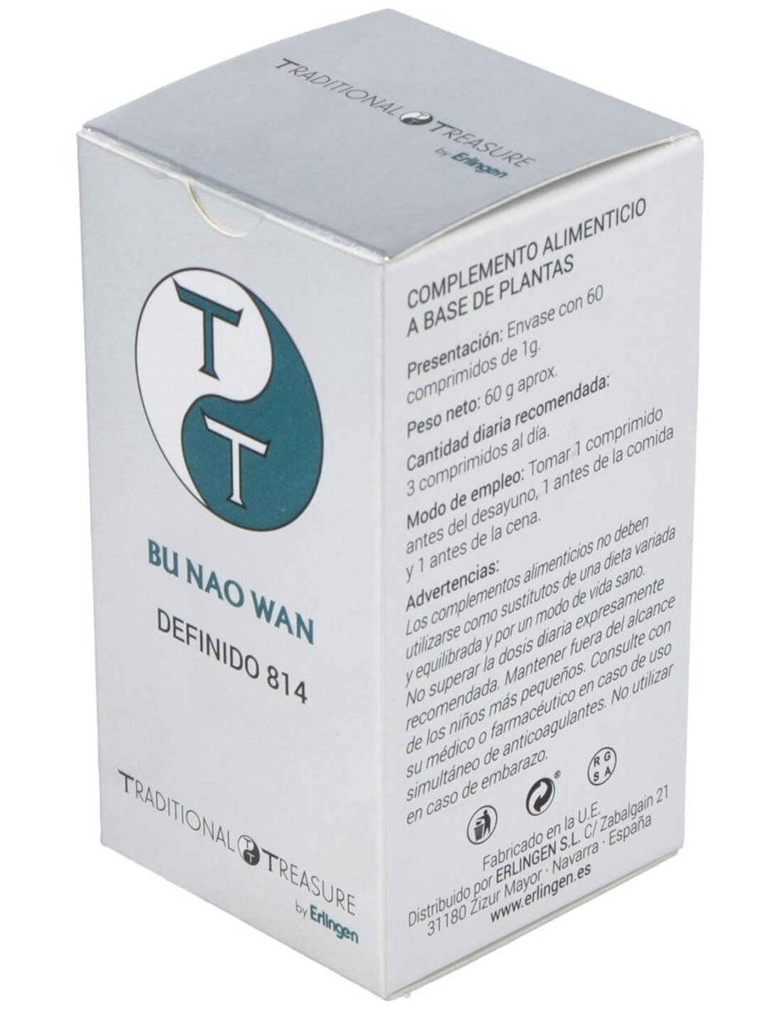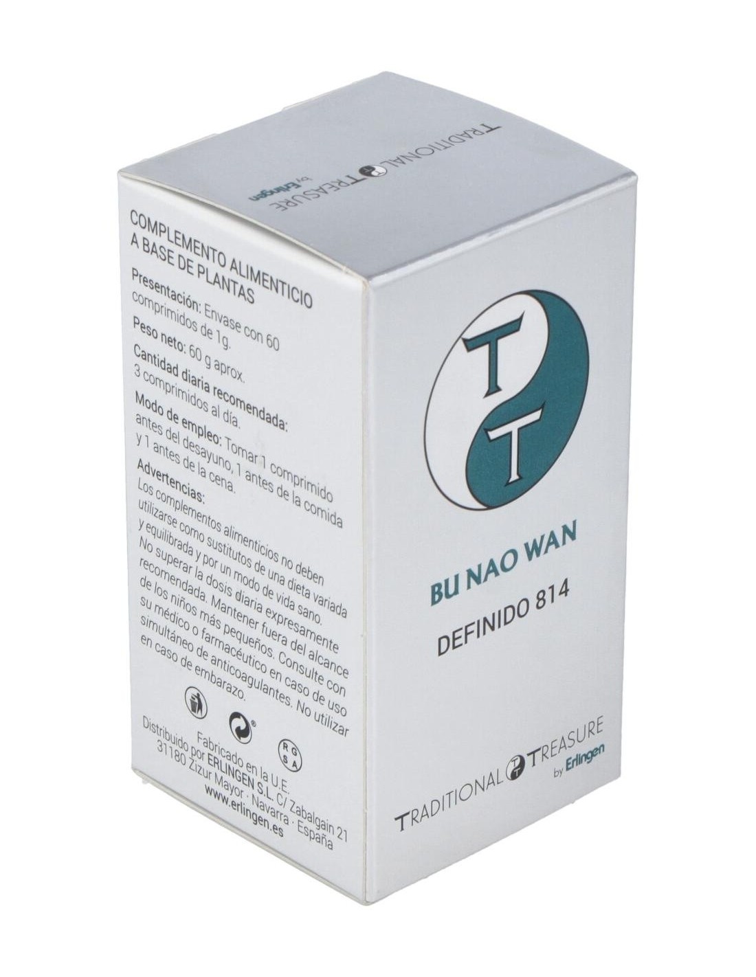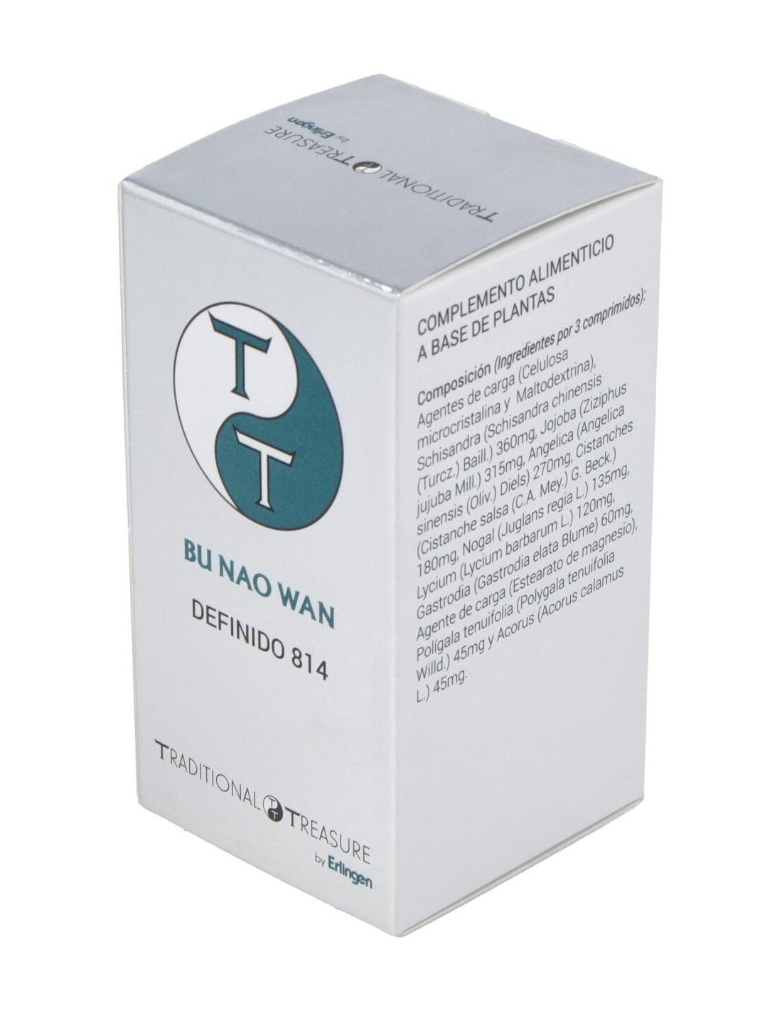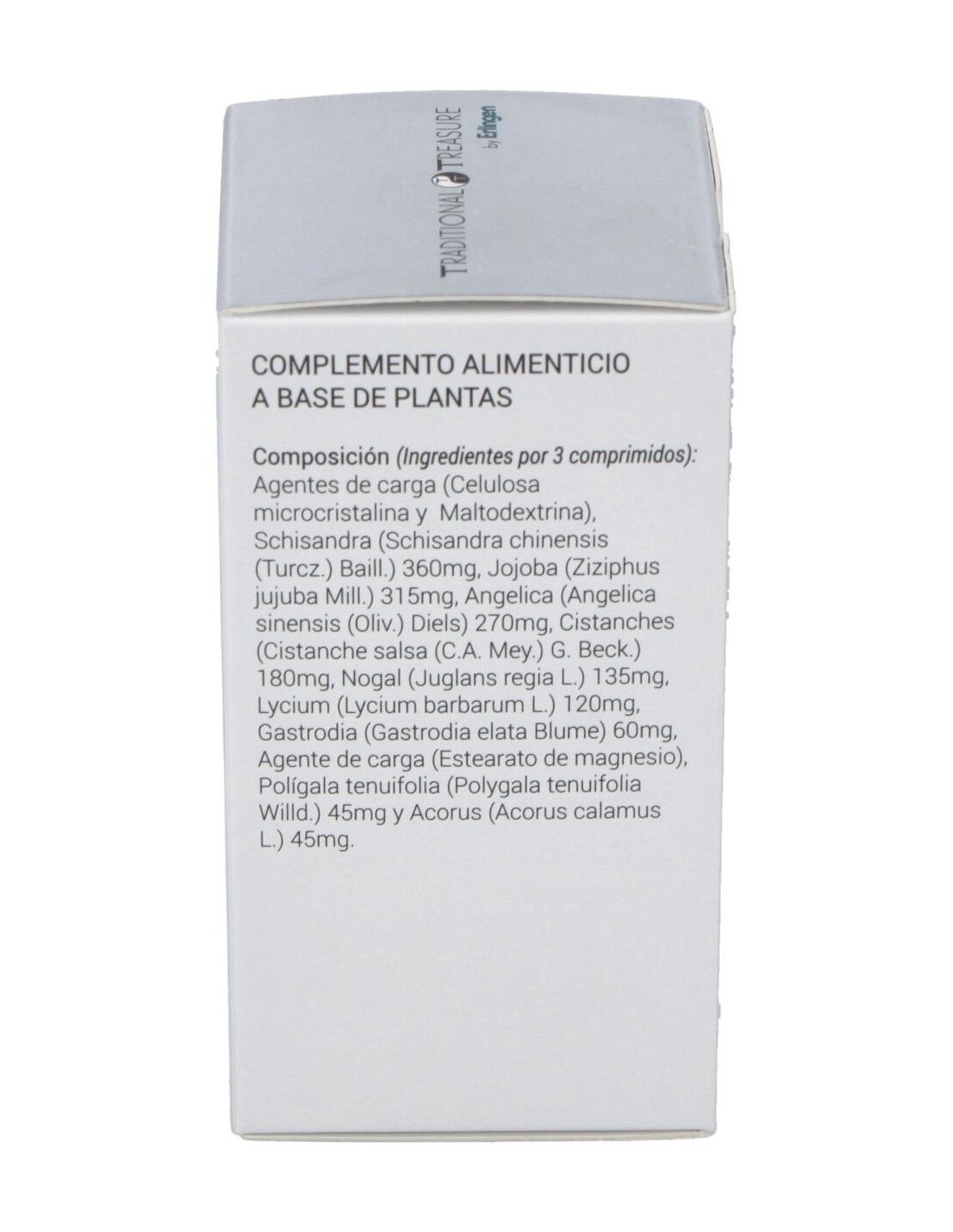 Agentes de carga (Celulosa microcristalina y Maltodextrina), Schisandra (Schisandra chinensis (Turcz.) Baill.) 360 mg, Jojoba (Ziziphus jujuba Mill.) 315 mg, Angélica (Angelica sinensis (Oliv.) Diels) 270 mg, Cistanches (Cistanche salsa (C.A. Mey.) G. Beck.) 180 mg, Nogal (Juglans regia L.) 135 mg, Lycium (Lycium barbarum L.) 120 mg, Gastrodia (Gastrodia elata Blume) 60 mg, Agente de carga (Estearato de magnesio), Polígala tenuifolia (Polygala tenuifolia Willd.) 45 mg y Acorus (Acorus calamus L.) 45 mg.