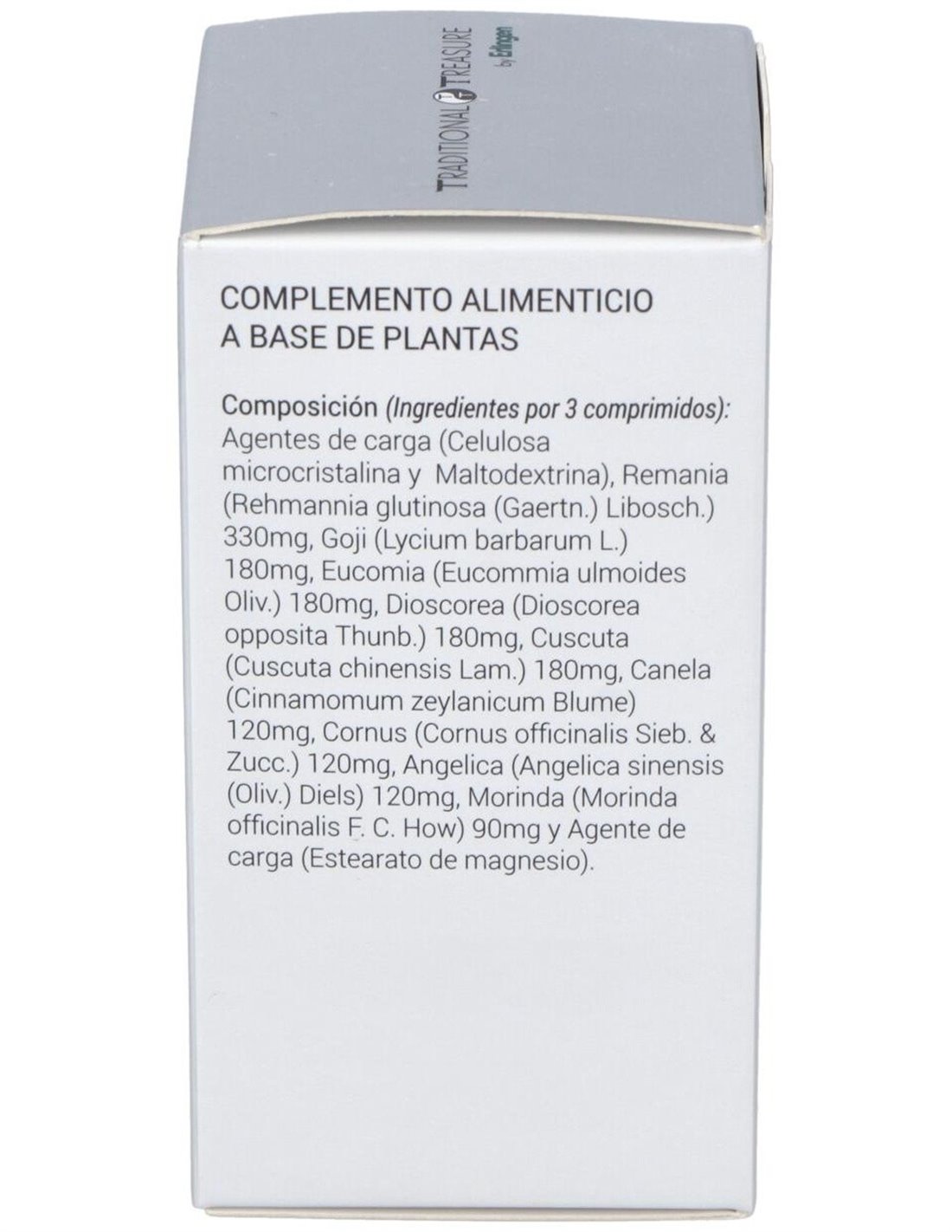 Agentes de carga (Celulosa microcristalina y Maltodextrina), Remania (Rehmannia glutinosa (Gaertn.) Libosch.) 330 mg, Goji (Lycium barbarum L.) 180 mg, Eucomia (Eucommia ulmoides Oliv.) 180 mg, Dioscorea (Dioscorea opposita Thunb.) 180 mg, Cuscuta (Cuscuta chinensis Lam.) 180 mg, Canela (Cinnamomum zeylanicum Blume) 120 mg, Cornus (Cornus officinalis Sieb. & Zucc.) 120 mg, Angélica (Angelica sinensis (Oliv.) Diels) 120 mg, Morinda (Morinda officinalis F. C. How) 90 mg y Agente de carga (Estearato de magnesio).