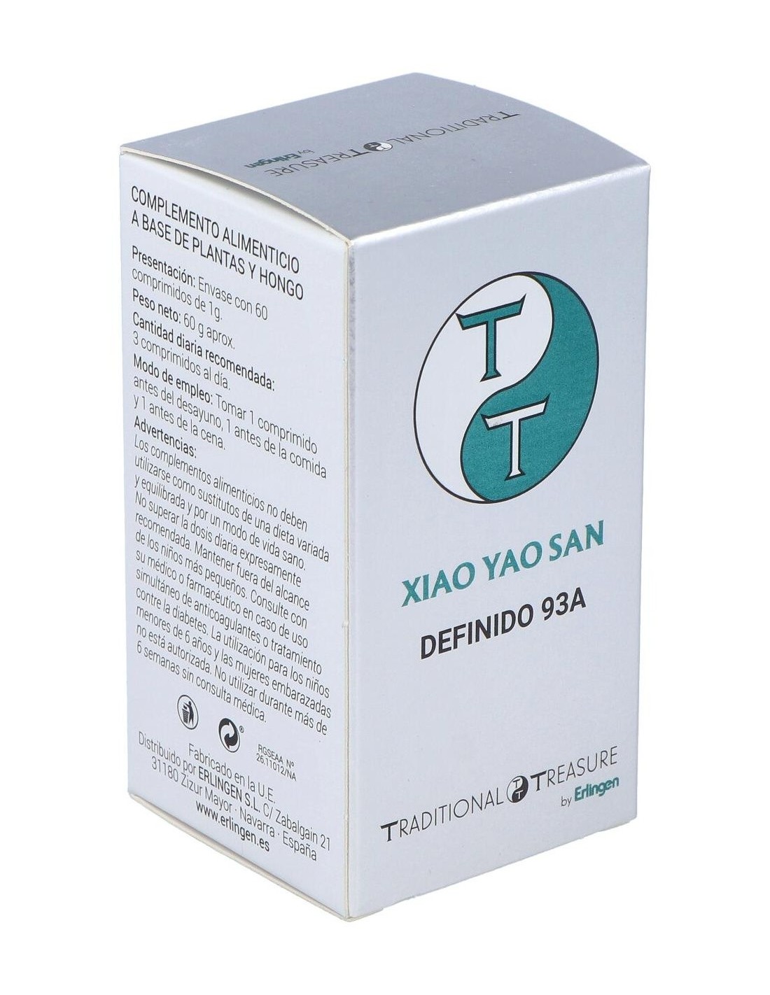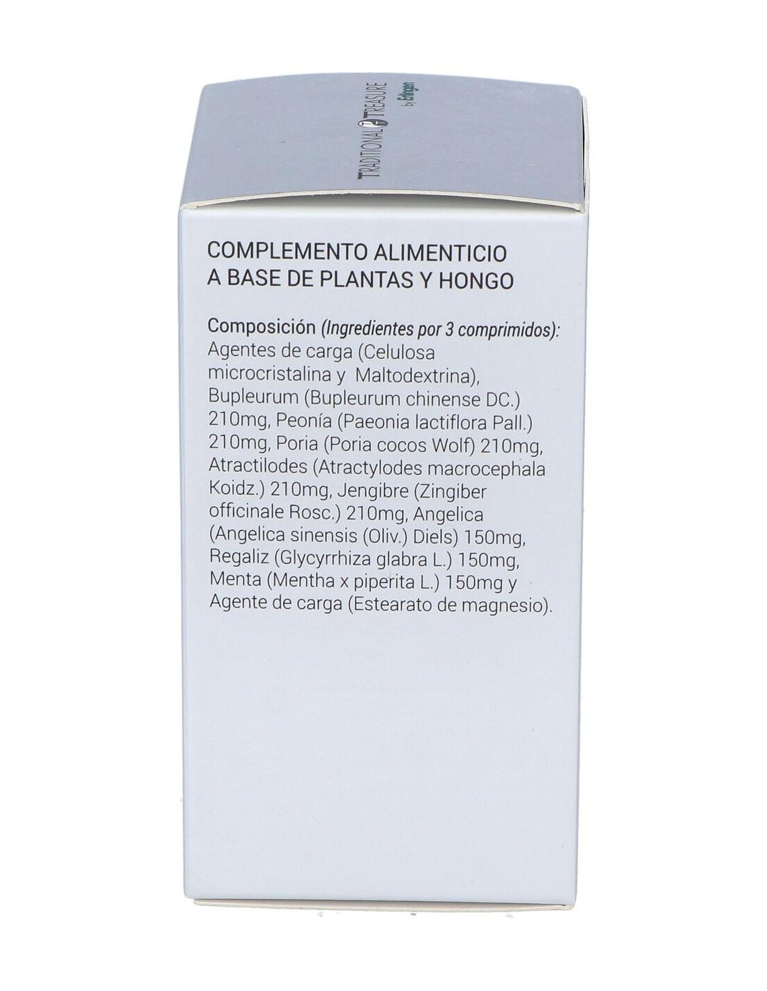 Agentes de carga (Celulosa microcristalina y Maltodextrina), Bupleurum (Bupleurum chinense DC.) 210 mg, Peonía (Paeonia lactiflora Pall.) 210 mg, Poria (Poria cocos Wolf) 210 mg, Atractilodes (Atractylodes macrocephala Koidz.) 210 mg, Jengibre (Zingiber officinale Rosc.) 210 mg, Angélica (Angelica sinensis (Oliv.) Diels) 150 mg, Regaliz (Glycyrrhiza glabra L.) 150 mg, Menta (Mentha x piperita L.) 150 mg y Agente de carga (Estearato de magnesio).