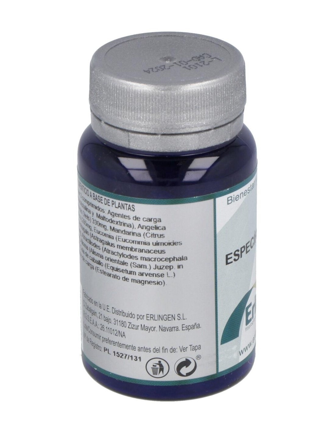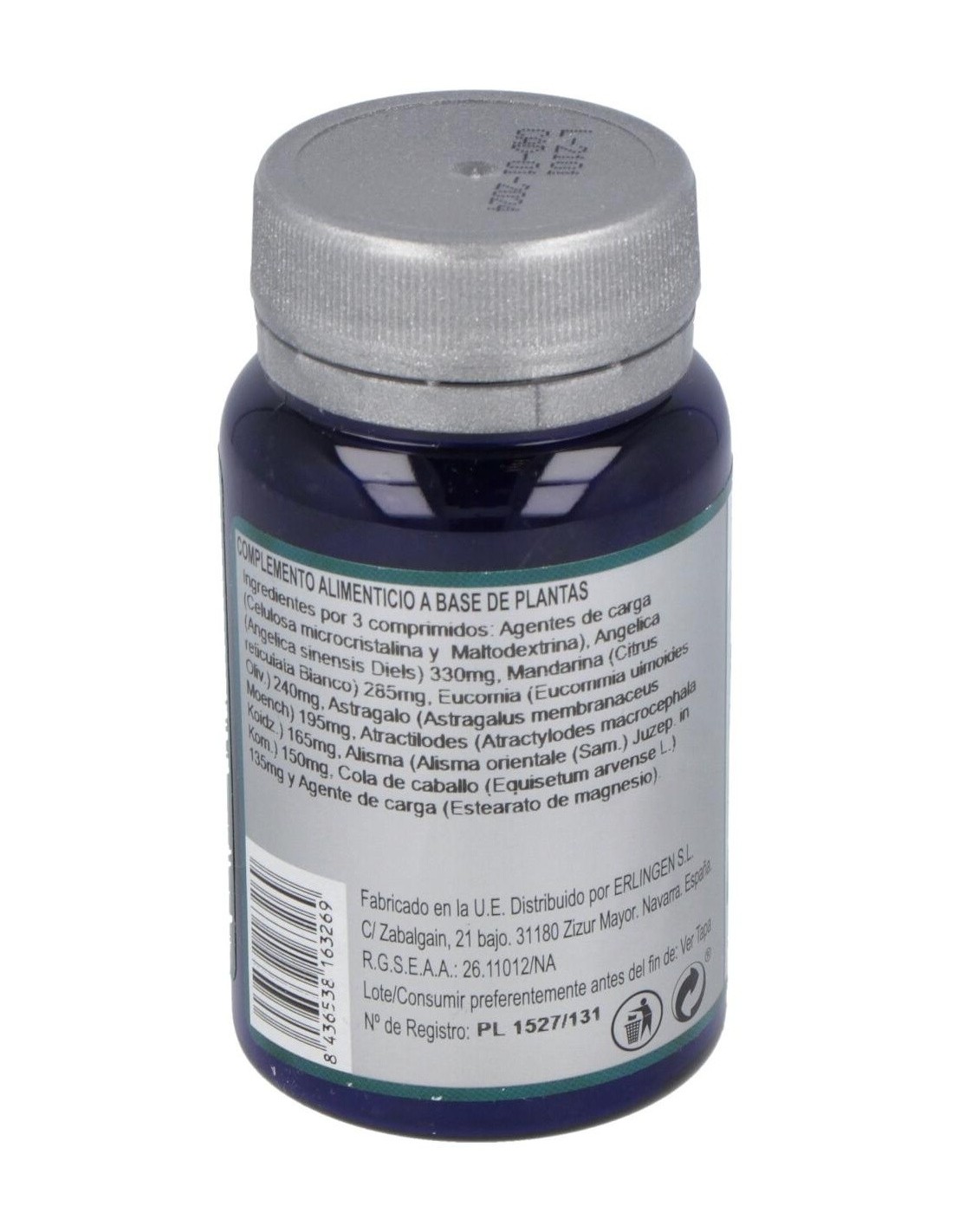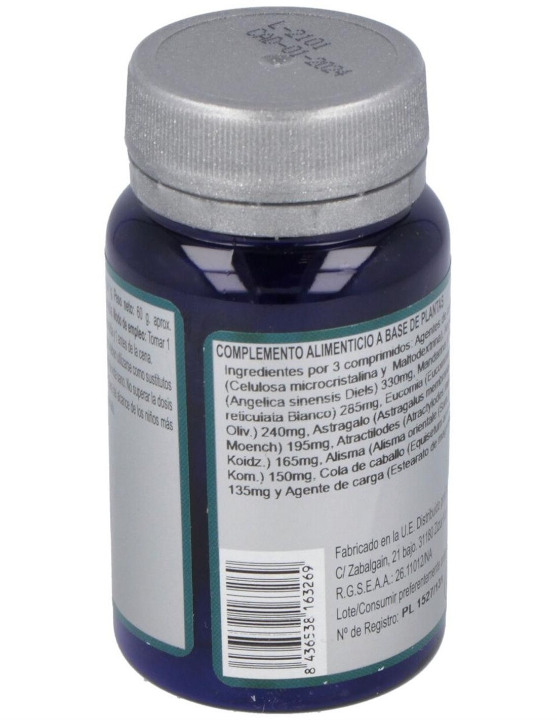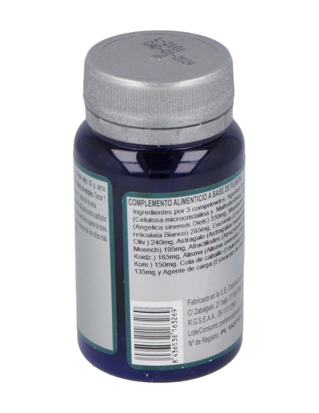 Agentes de carga (Celulosa microcristalina y Maltodextrina), Angélica (Angelica sinensis Diels) 330 mg, Mandarina (Citrus reticulata Blanco) 285 mg, Eucomia (Eucommia ulmoides Oliv.) 240 mg, Astragalo (Astragalus membranaceus Moench) 195 mg, Atractilodes (Atractylodes macrocephala Koidz.) 165 mg, Alisma (Alisma orientale (Sam.) Juzep. in Kom.) 150 mg, Cola de caballo (Equisetum arvense L.) 135 mg y Agente de carga (Estearato de magnesio).