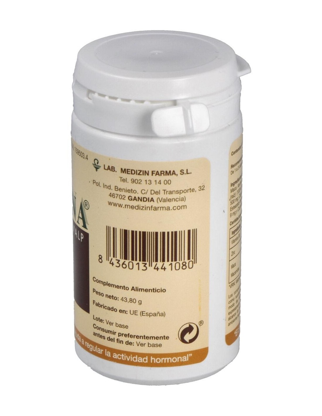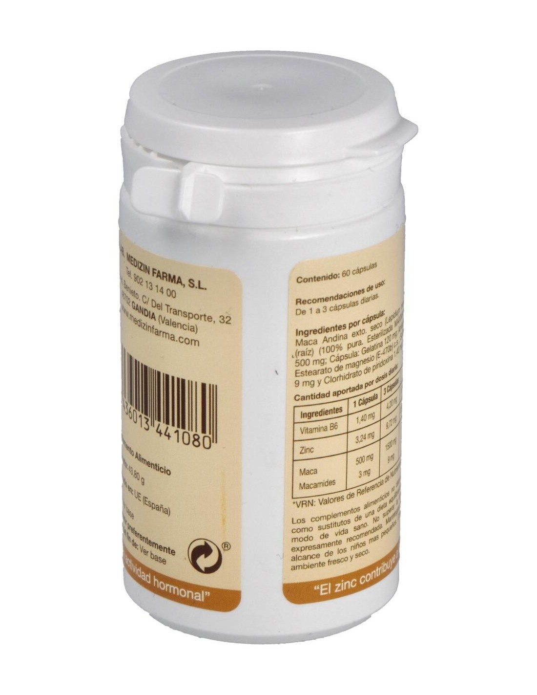 Maca Andina exto. seco (Lepidium Meyenii Walp) (raíz) (100% Pura. Esterilizada. máxima calidad) 500 mg: Cápsula: Gelatina 120 mg y Antiaglomerante: Estearato de magnesio (E- 470b) c.s.: Sulfato de zinc 9 mg y Clorhidrato de piridoxina (Vit. B6) 1,40 mg