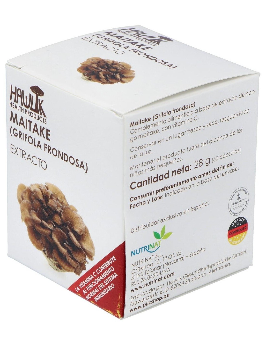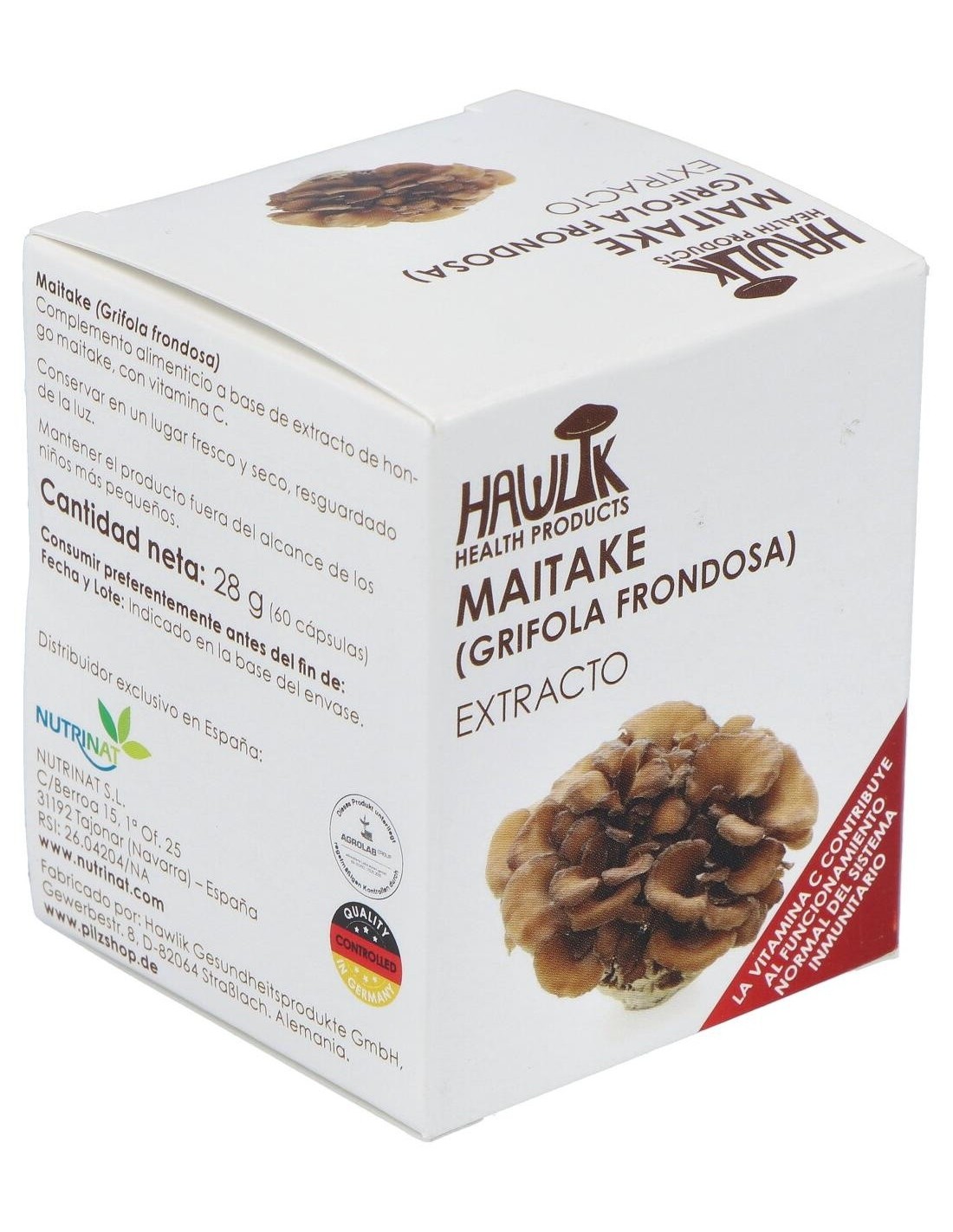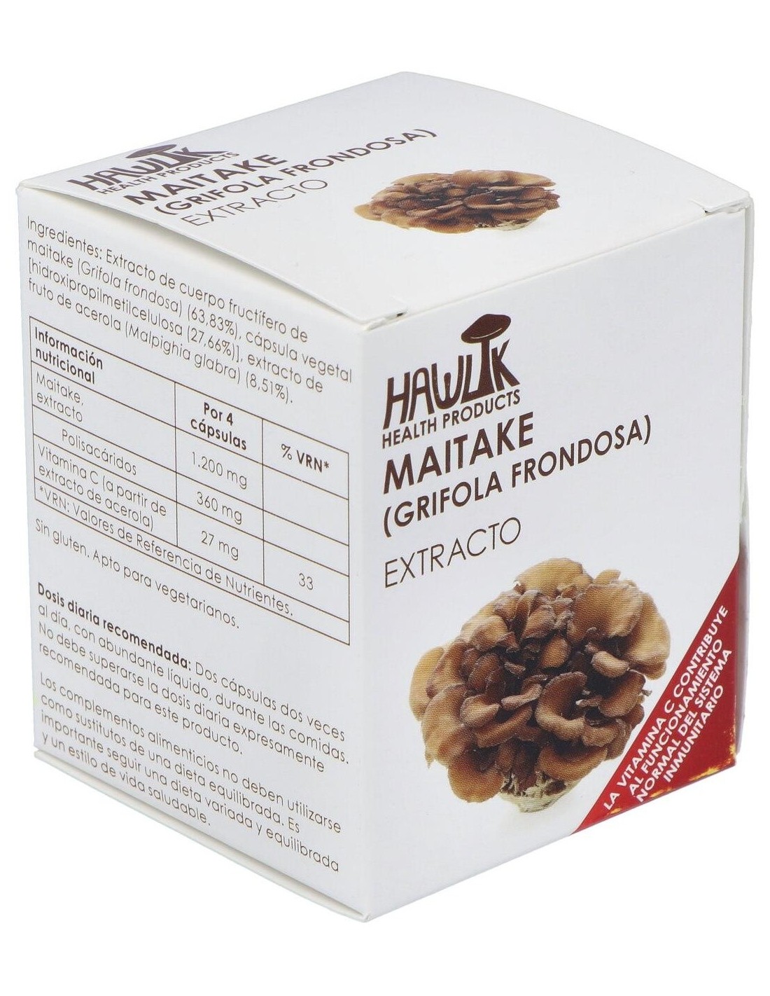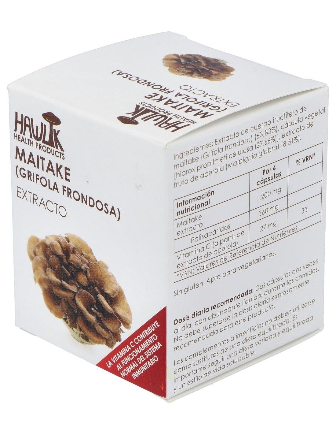 Complemento alimenticio a base de extracto de hongo maitake con alto contenido en polisacáridos, con extracto de acerola rico en vitamina C. Actúa sobre la glucosa y la insulina, la presión arterial, el peso y los lípidos sanguíneos. Es inmunomodulador y está indicado en caso de enfermedades hepáticas y osteoporosis. Apto para vegetarianos y veganos.