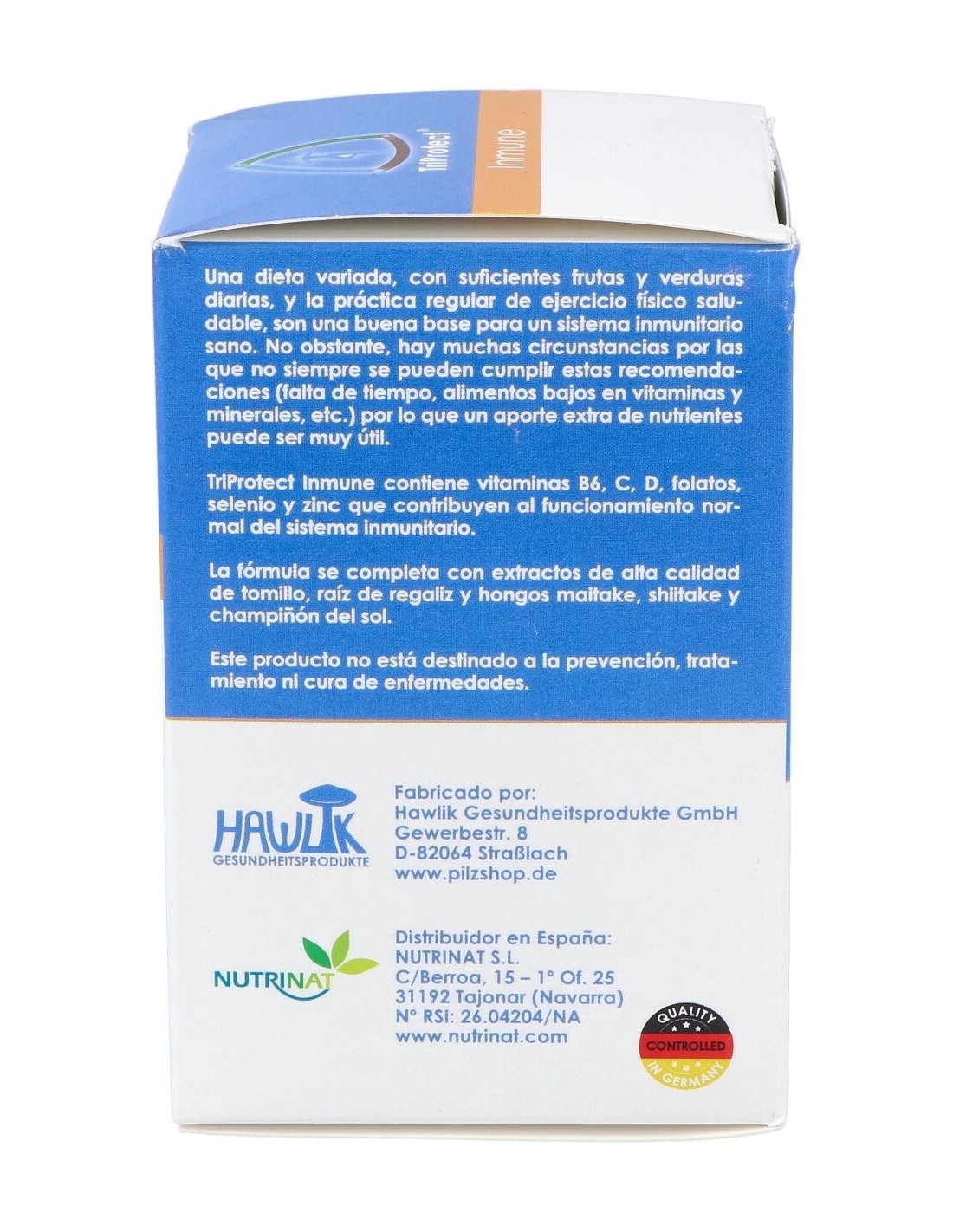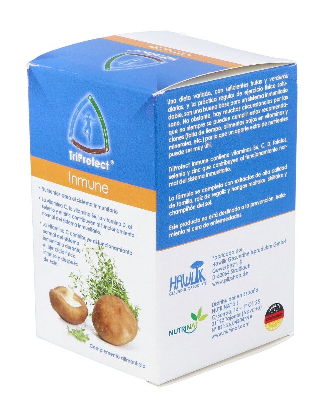 Champiñón del sol (Agaricus blazei) extracto, Contenido en polisacáridos, Maitake (Grifola frondosa) extracto, Contenido en polisacáridos, Shiitake (Lentinula edodes) extracto, Contenido en polisacáridos, Regaliz (Glycyrrhiza glabra) extracto de raíz, Contenido en ácido glicirrícico, Tomillo (Thymus vulgaris) extracto de hoja, Vitamina C (ascorbato cálcico), Vitamina E (acetato de d-alfa tocoferol), Zinc (gluconato), Vitamina B6 (clorhidrato de piridoxina), Ácido fólico, Selenio (selenito de sodio), Vitamina D3 (colecalciferol). Cápsula vegetal (hidroxipropilmetilcelulosa), agente de carga (celulosa en polvo).