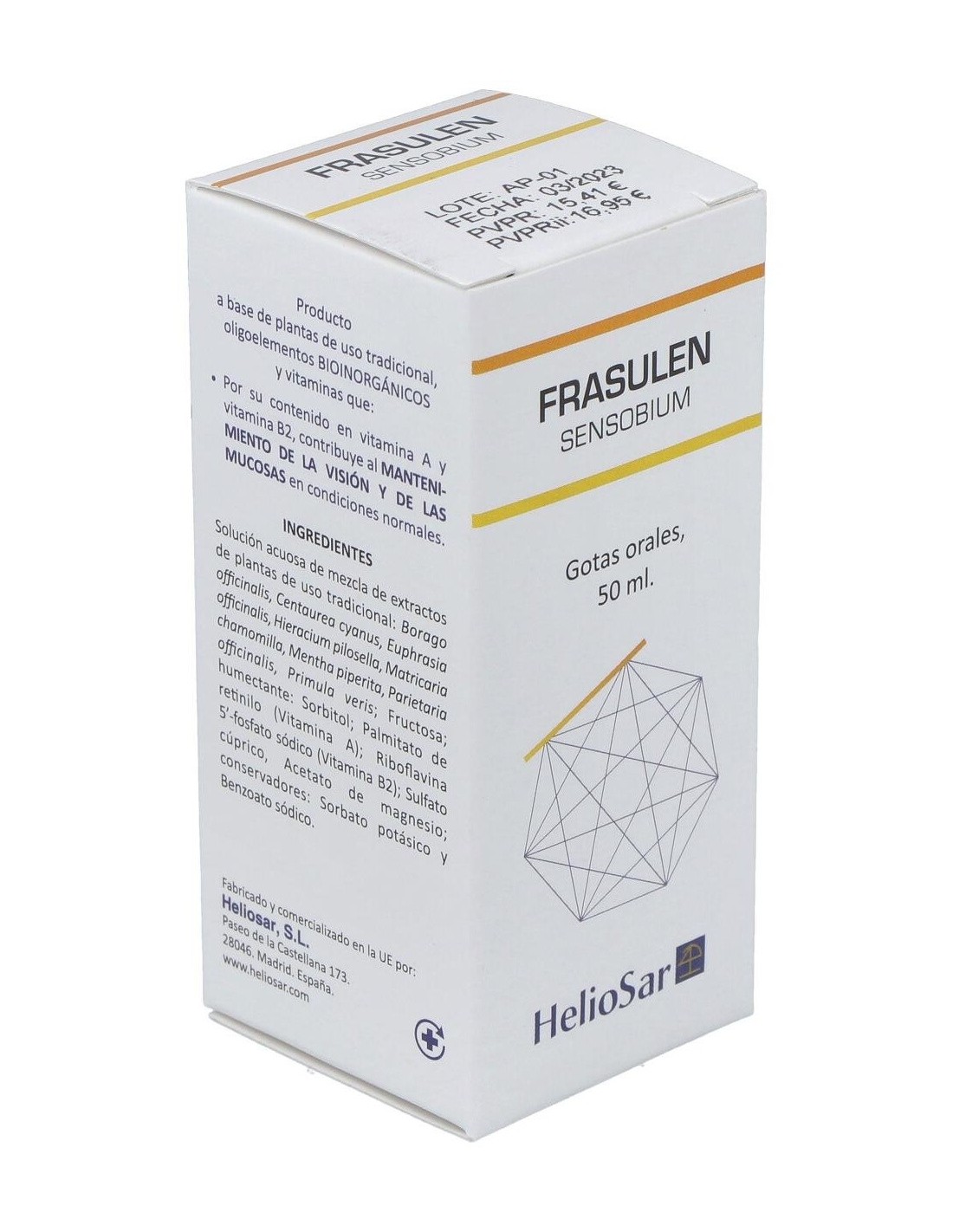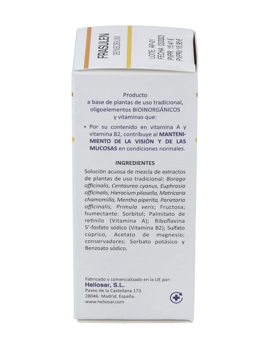 Solución acuosa de mezcla de extractos de plantas de uso tradicional: Borago officinalis, Centaurea cyanus, Euphrasia officinalis, Hieracium pilosella, Matricaria chamomilla, Mentha piperita, Parietaria officinalis, Primula veris: Fructosa: