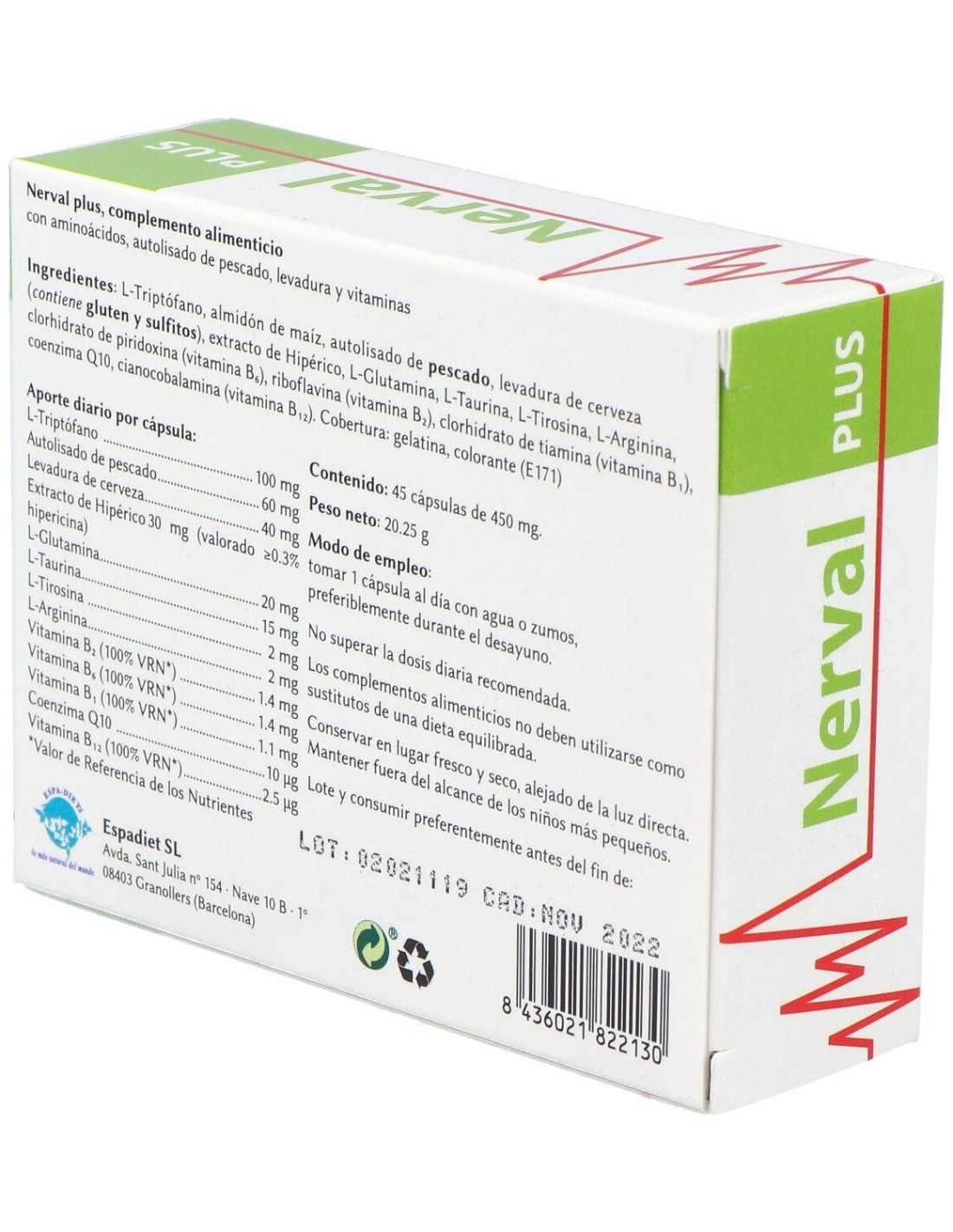 L-Triptófano, Almidón de maíz, Autolisado de pescado, Levadura de cerveza (contiene gluten y sulfitos), Extracto de Hipérico, L-Glutamina, L-Taurina, L-Tirosina, L-Arginina, Clorhidrato de piridoxina (vitamina B6), Riboflavina (vitamina B2), Clorhidrato de tiamina (vitamina B1), Coenzima Q10, Cianocobalamina (vitamina B12).