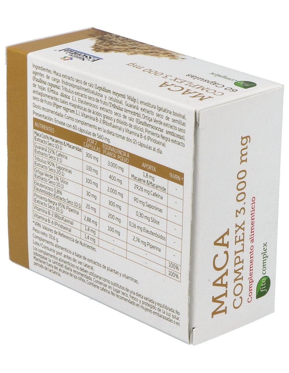 Maca Extracto Seco 150 mg (Equivalente a 1.500 mg de Planta Polvo) (Lepidium meyenii Walp), Agente de Carga (Hidroxipropilmetilcelulosa y Celulosa Vegetal), Guaraná Extracto Seco 66,5 mg (Equivalente a 200 mg de Planta Polvo) (Paullina cupana), Tríbulus Extracto Seco 50 mg (Equivalente a 1.000 mg de Planta Polvo) (Tribulus terrestres L.), Ortiga Verde Extracto Seco 15 mg (Equivalente a 150 mg de Planta Polvo) (Urtica dioica L.), Eleuterococo Extracto Seco 10 mg (Equivalente a 100 mg de Planta Polvo) (Eleutherococcus senticosus), Antiaglomerantes (Estearato de Magnesio Vegetal y Dióxido de Silicio), Pimienta Negra Extracto Seco 1,44 mg (Equivalente a 50 mg de Planta Polvo) (Piper nigrum L.), Vitamina B-2 (Riboflavina) 0,7 mg, Vitamina B-6 (Piridoxina) 0,7 mg y Envoltura (Gelatina).