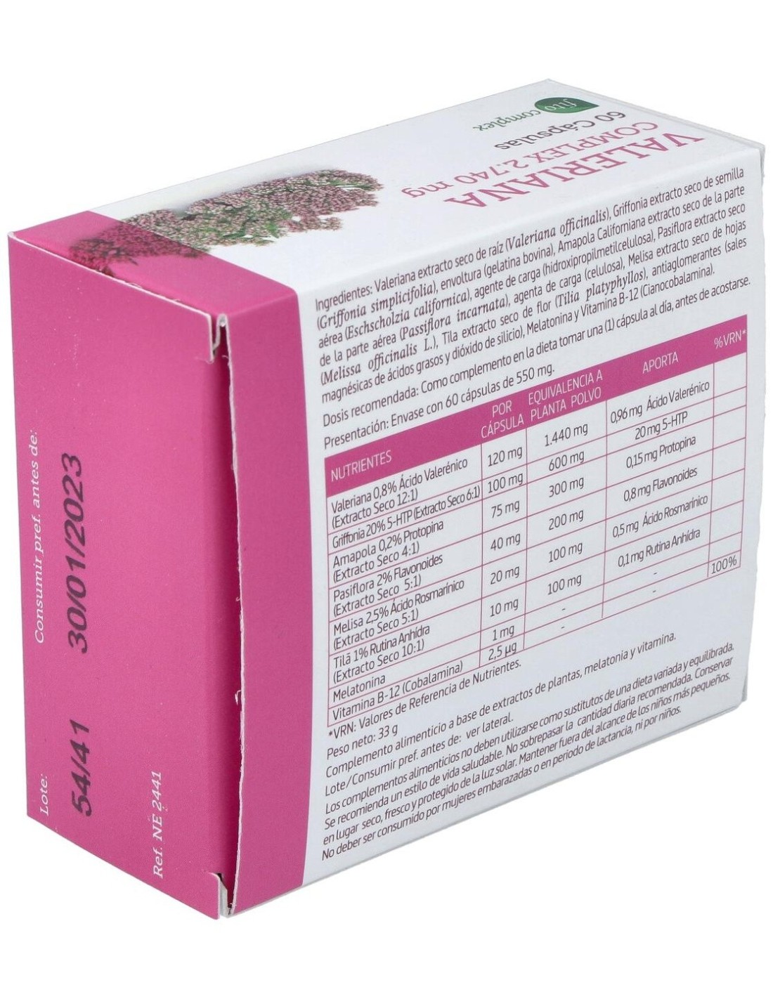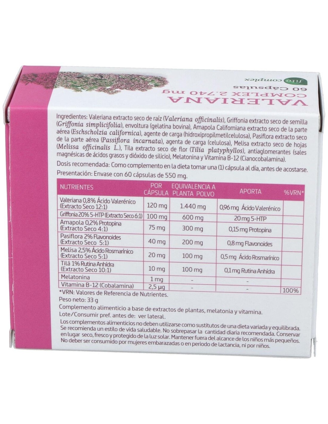 Por 1 cápsula: Valeriana Extracto Seco (Raíz) 120 mg (Equivalente a 1.440 mg de Planta Polvo), Griffonia Extracto Seco (Semilla) 100 mg (Equivalente a 600 mg de Planta Polvo), Amapola Californiana Extracto Seco (Parte Aérea) 75 mg (Equivalente a 300 mg de Planta Polvo), Agente de Carga (Hidroxipropilmetilcelulosa), Pasiflora Extracto Seco 40 mg (Equivalente a 200 mg de Planta Polvo), Agente de Carga (Celulosa Microcristalina), Melisa Extracto Seco (Hojas) 20 mg (Equivalente a 100 mg de Planta Polvo), Tila Extracto Seco (Flor) 10 mg (Equivalente a 100 mg de Planta Polvo), Antiaglomerantes (Estearato de Magnesio Vegetal y Dióxido de Silicio), Melatoni 1 mg, Vitamina B-12, 2,5 µg y Envoltura (Cápsula de Gelatina Bovina).