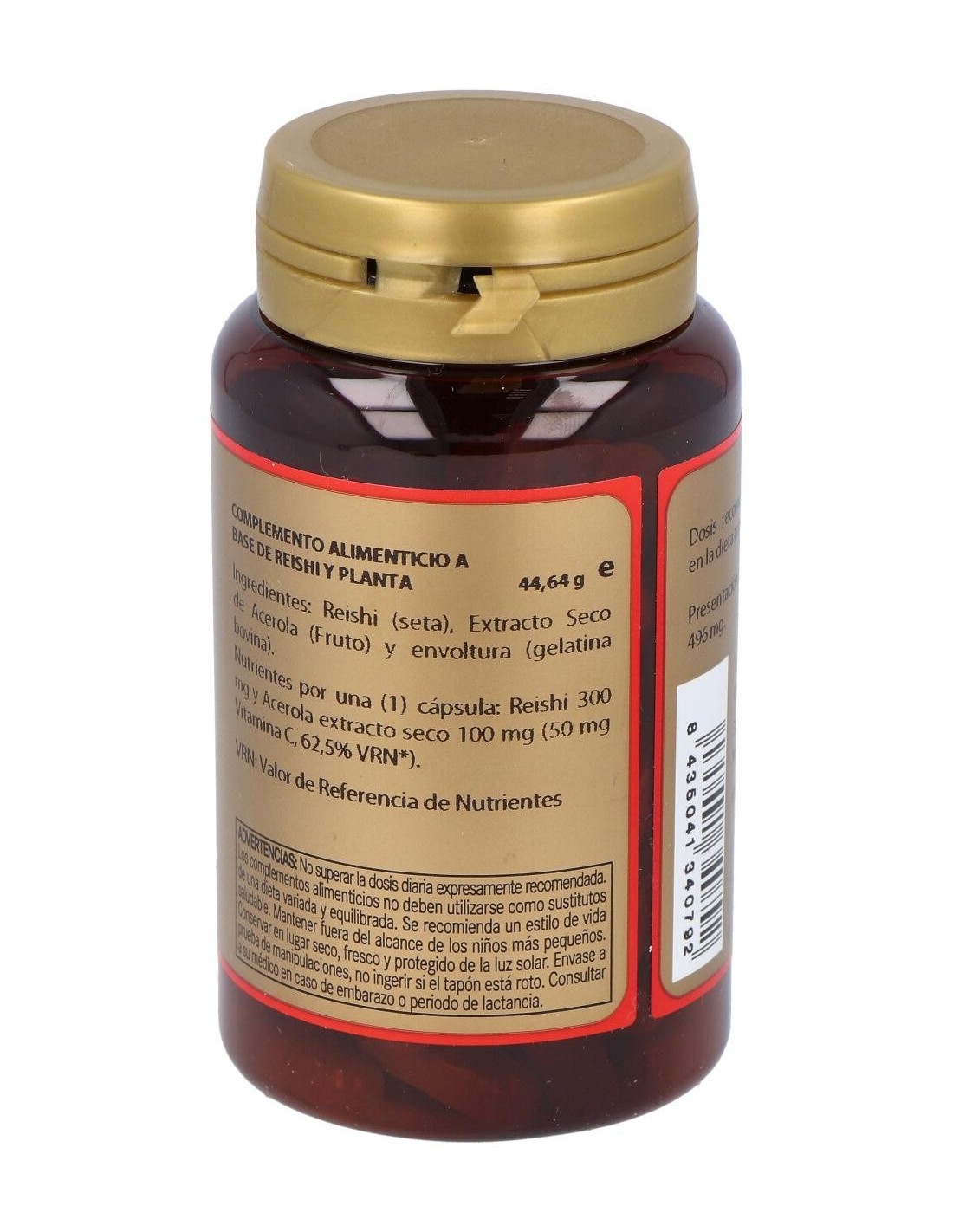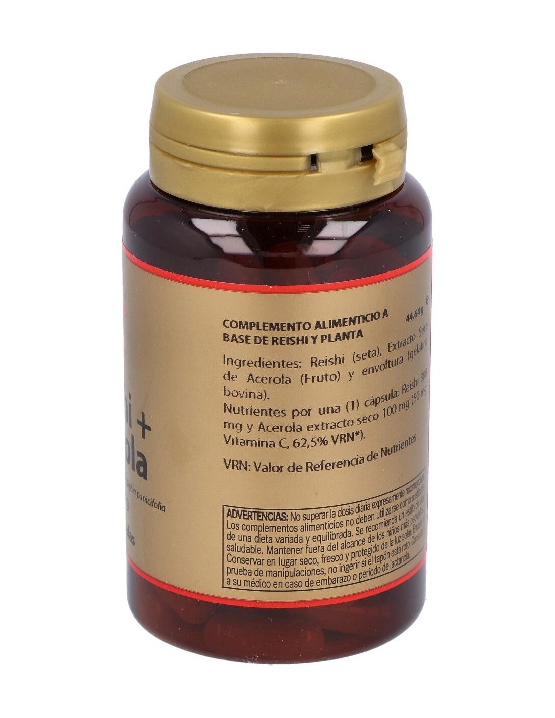 Complemento alimenticio formulado a base de semilla de reishi y extracto de acerola, rico en vitamina C, B y minerales. Favorece el funcionamento normal del sistema inmune. A la sinergia de sus ingredientes se le atribuyen propiedades beneficiosas sobre el flujo sanguíneo. Indicado para adultos. No apto para mujeres embarazadas o en periodo de lactancia.