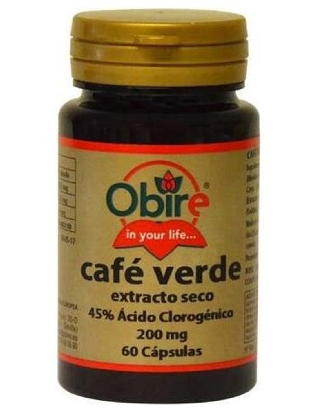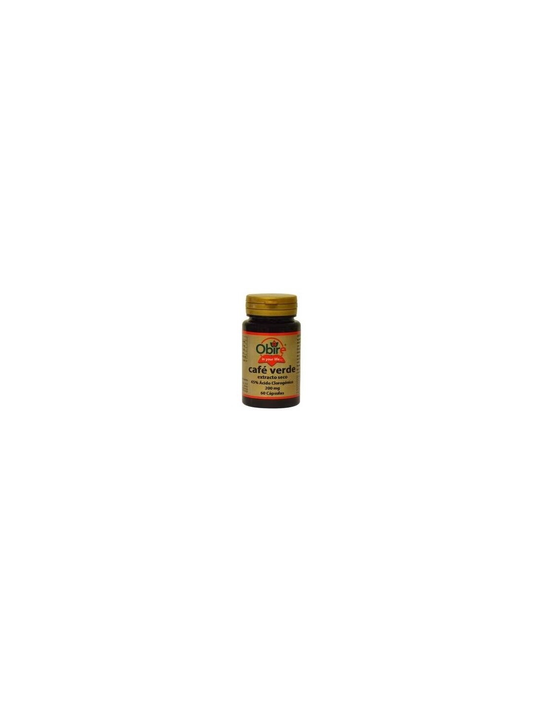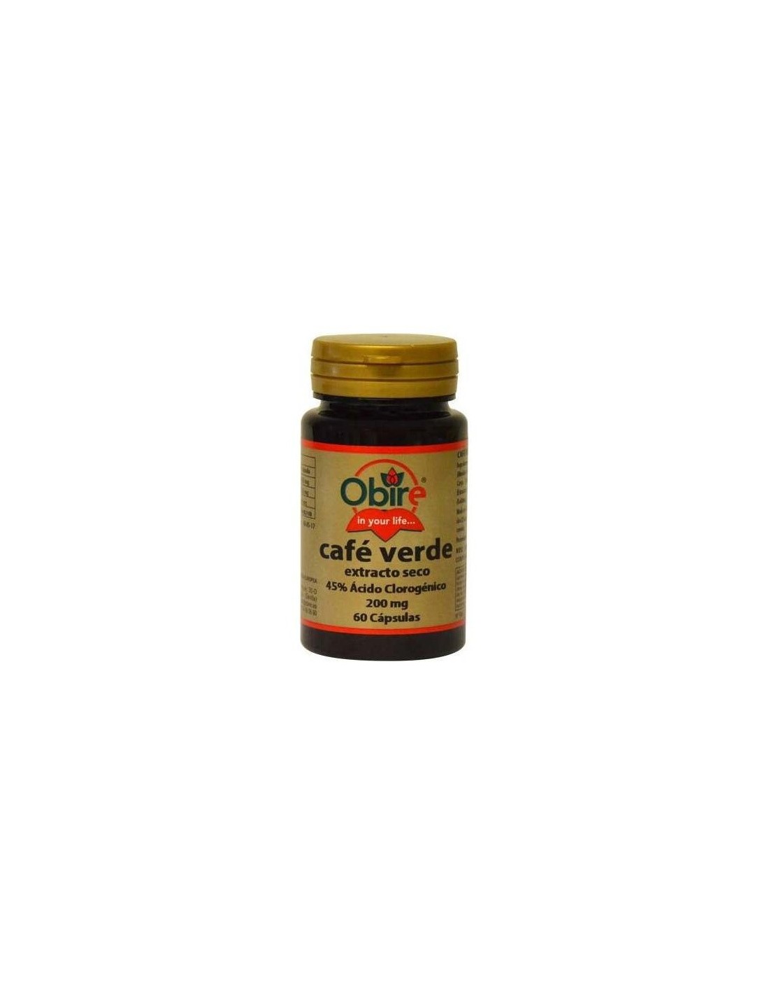Café Verde extracto seco (45% ácido clorogénico) 200mg. Almidón de Maíz, Maltodextrina, Celulosa Microcristalina, Estearato de Magnesio, Dióxido de Silicio y Gelatina.